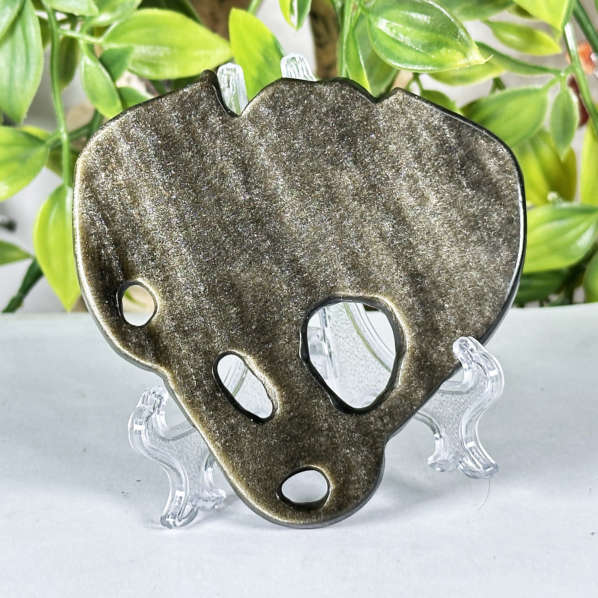 The Gold Sheen Obsidian Dragon Carving is a stunning polished crystal figurine made from natural obsidian stone. Measuring 3 inches tall and wide with a 0.25 inch depth, this detailed display piece showcases intricate dragon artistry with smooth polished surfaces that reflect light beautifully. The translucent black crystal features natural golden sheen patterns throughout its body, creating an elegant contrast against the dark glass-like material. Weighing only 2.4 ounces, this premium carving demonstrates excellent craftsmanship in its precise scales facial features and dynamic winged pose.