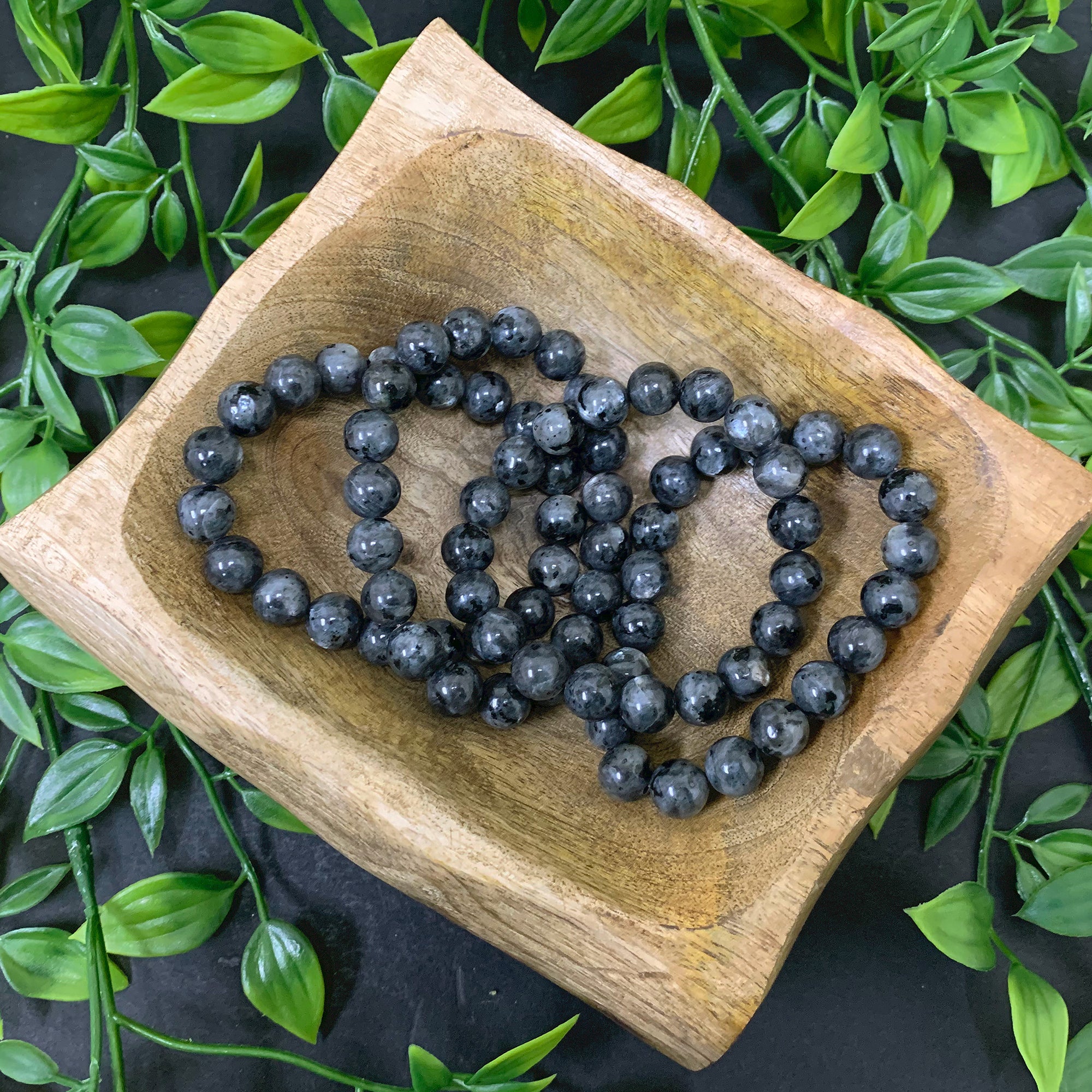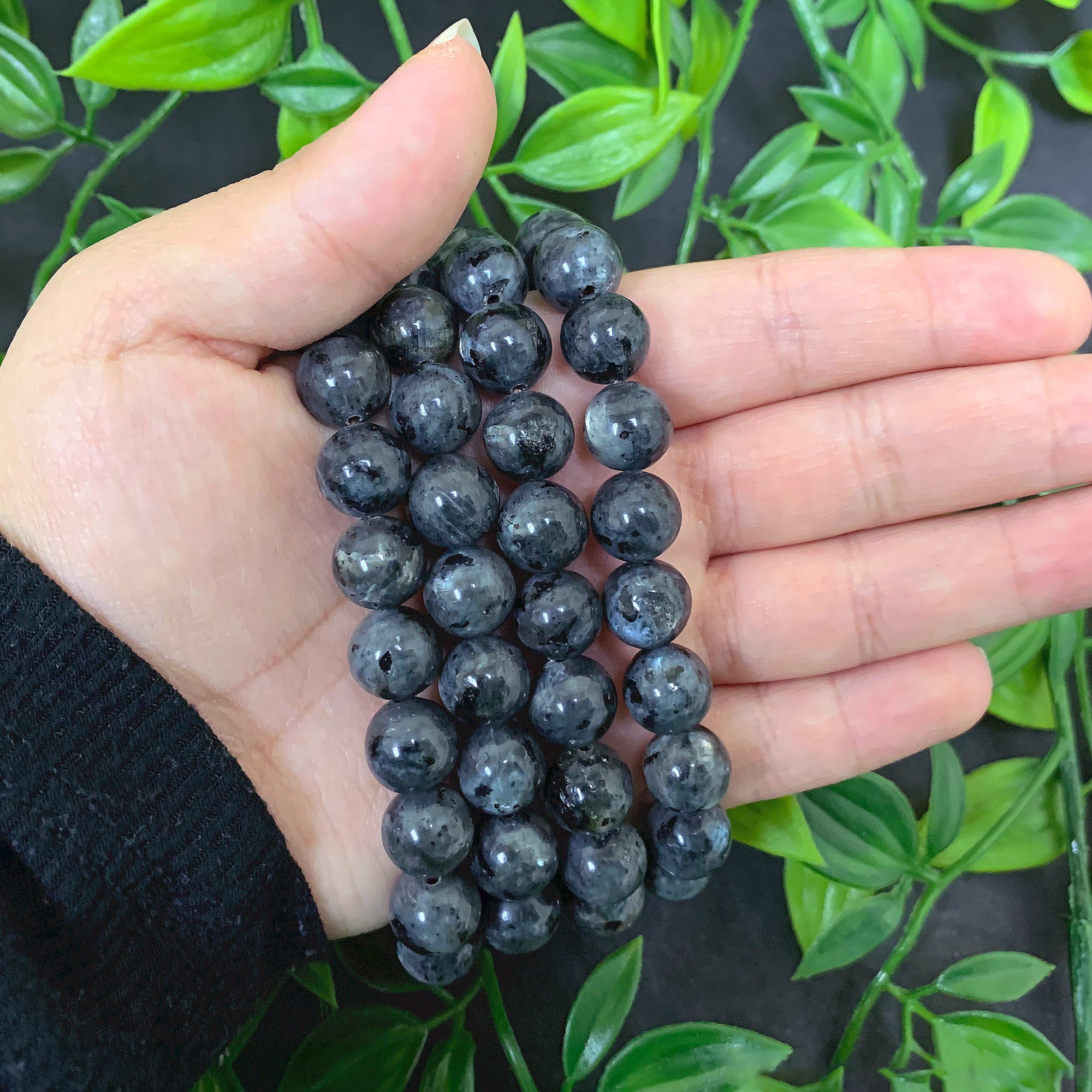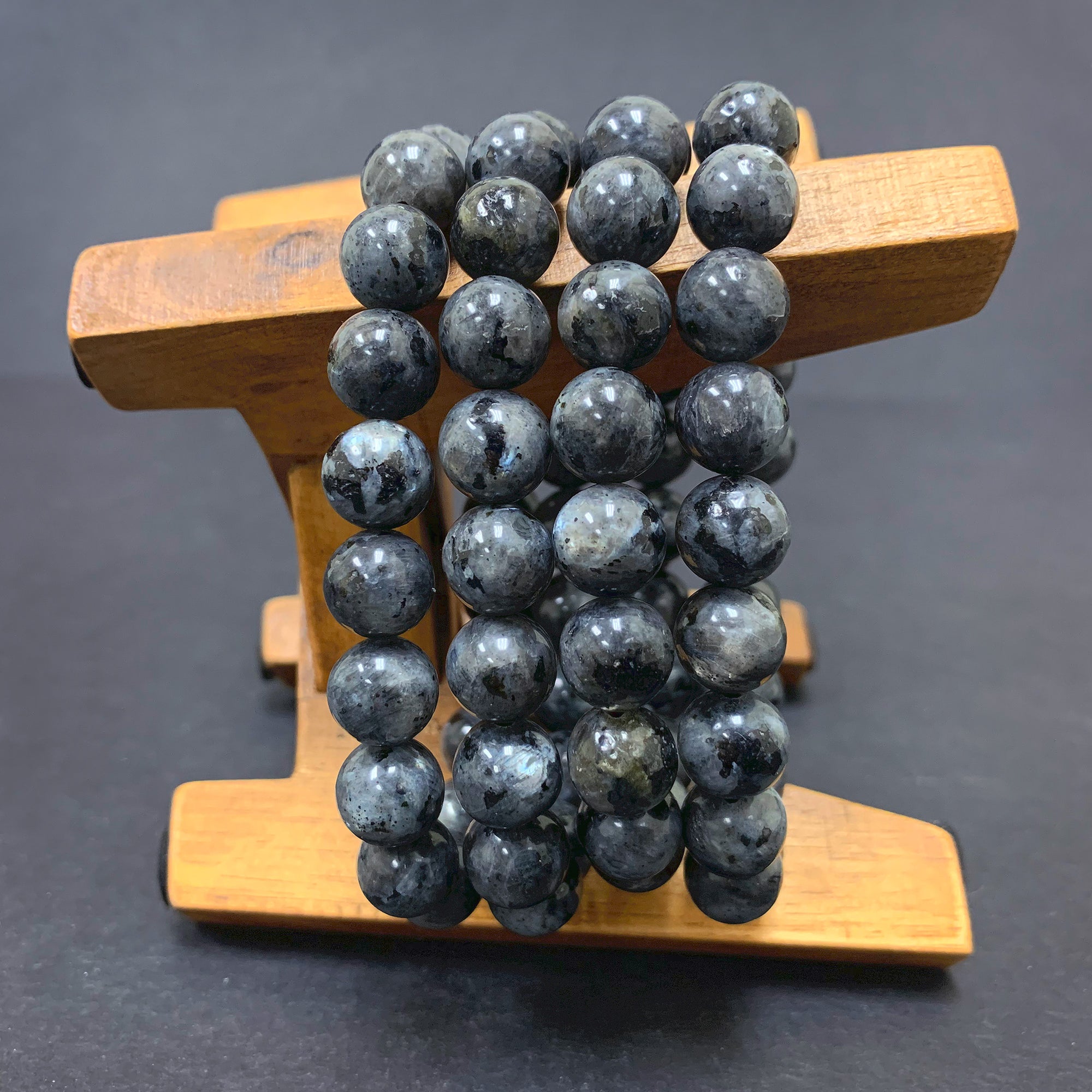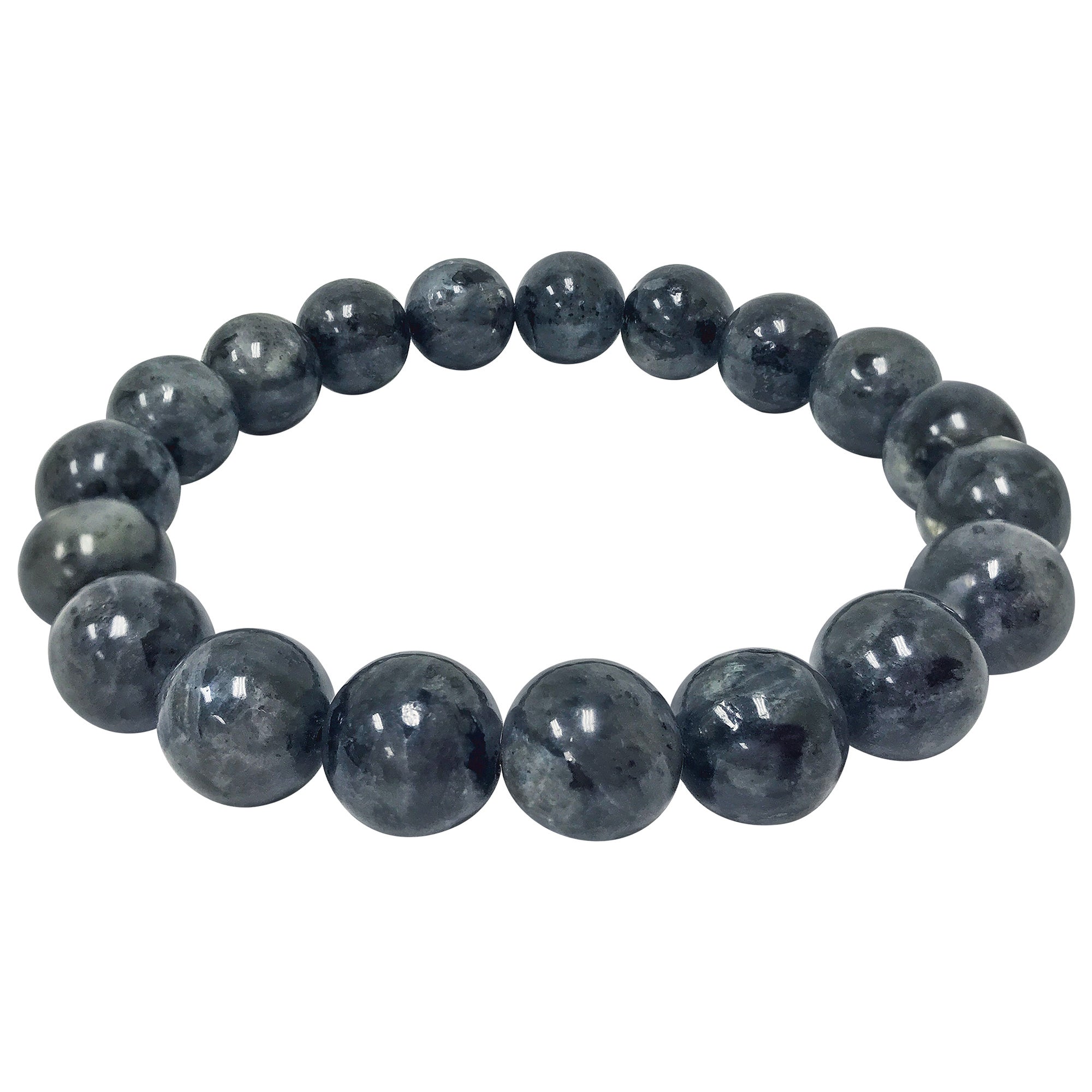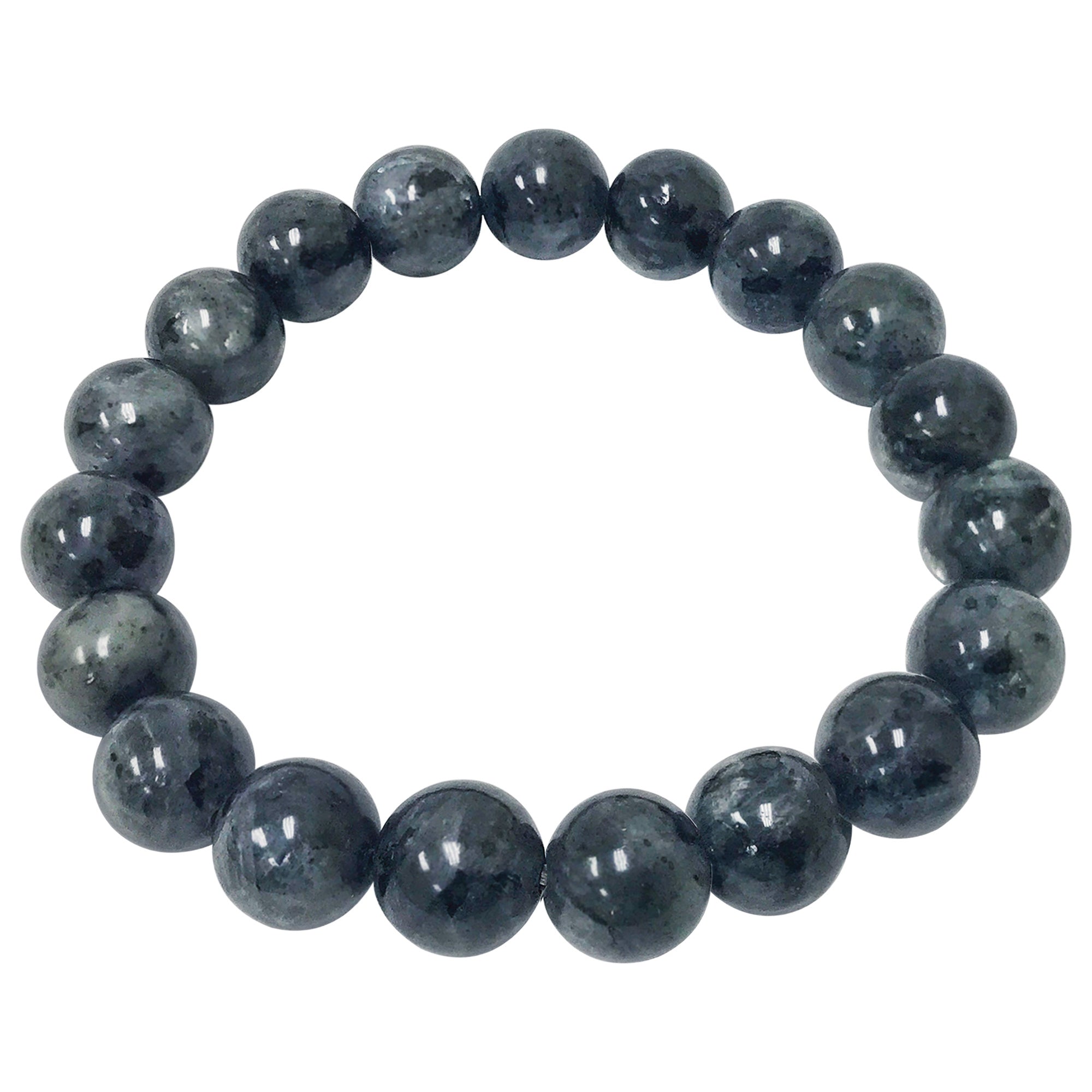 Each bracelet is composed of 10mm Larvikite beads that contain a rich shade of grey with subtle touches of black. The beads also have a slight sheen of white when met with light.