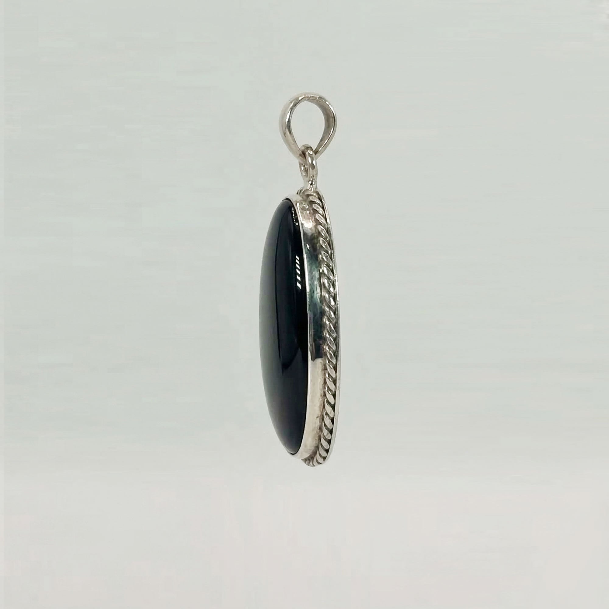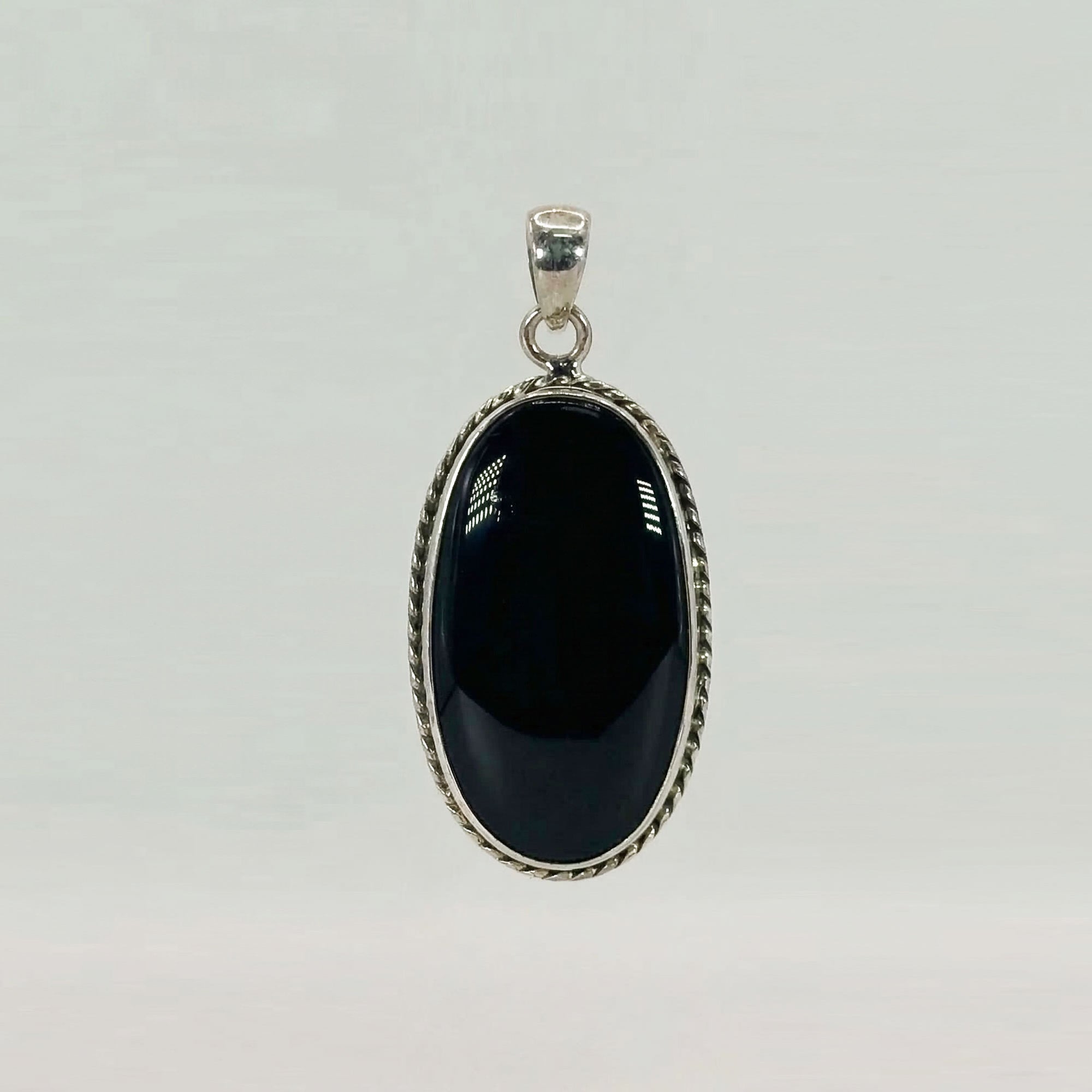 This pendant features a smooth oval black onyx set in genuine 925 sterling silver. The sleek design showcases the natural stone against a polished silver backdrop, and the piece weighs 10.61 gram, offering a comfortable feel.