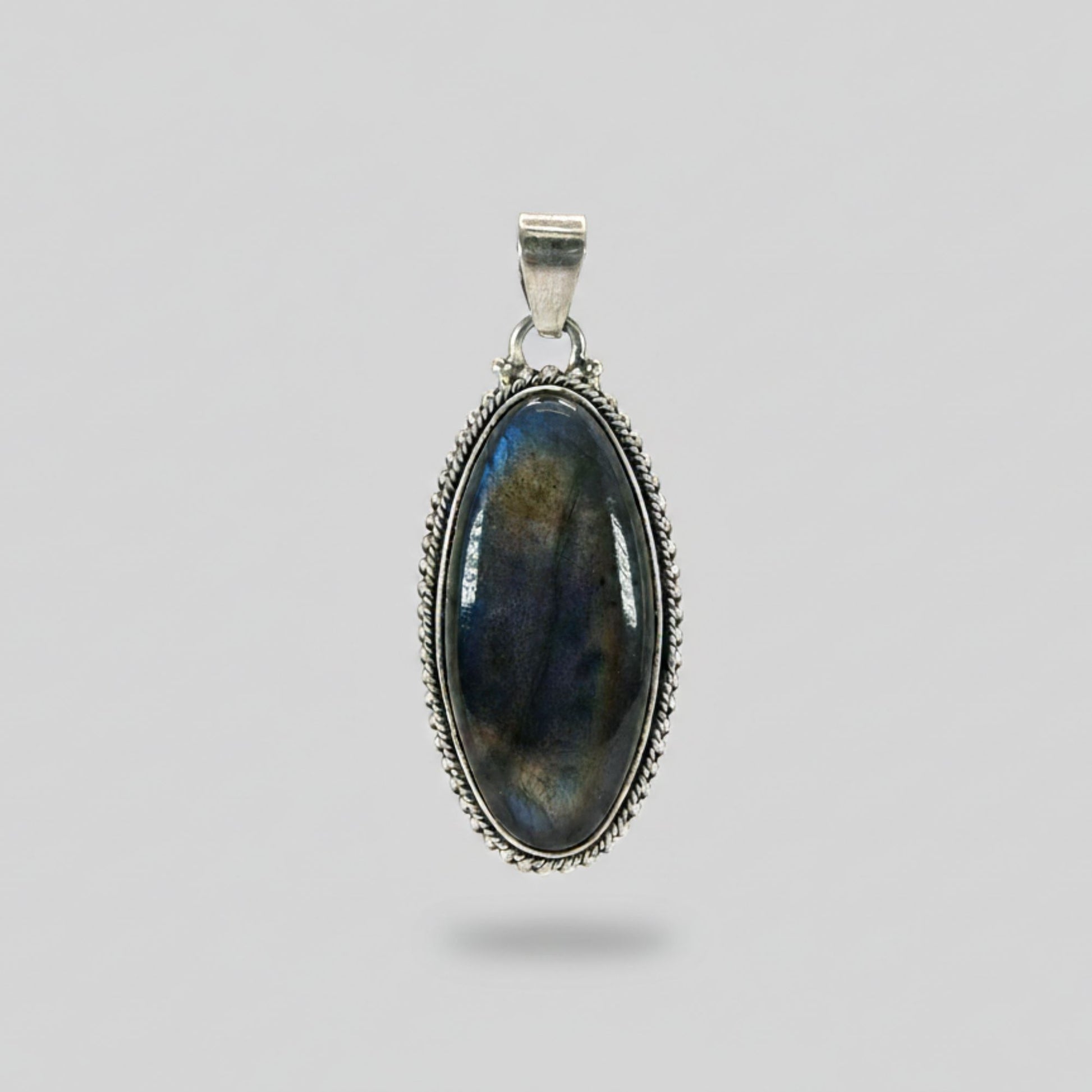 Crafted from genuine 925 sterling silver, this pendant features a natural blue flash labradorite gemstone set in an elegant oval shape. The piece weighs 16.36 gram, offering a substantial yet comfortable feel.