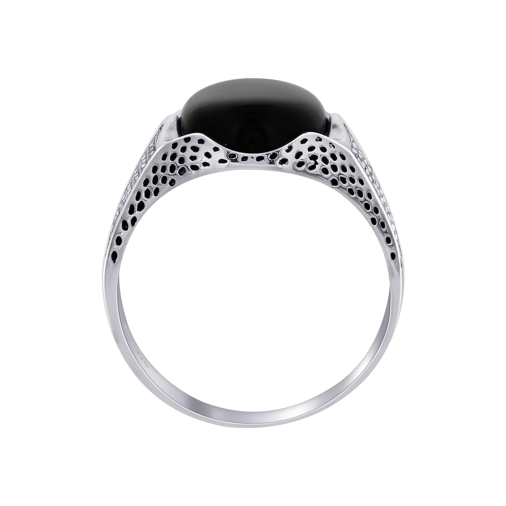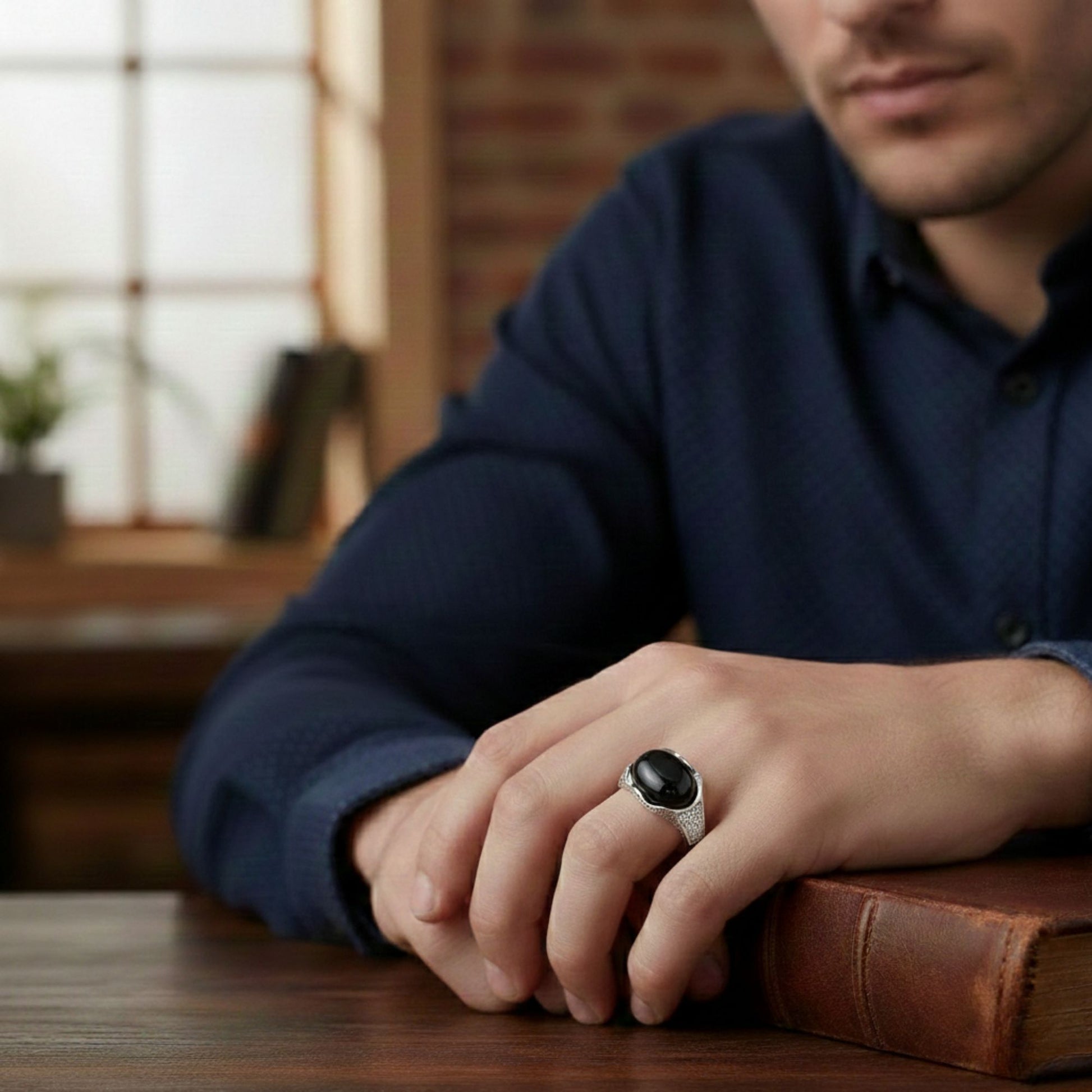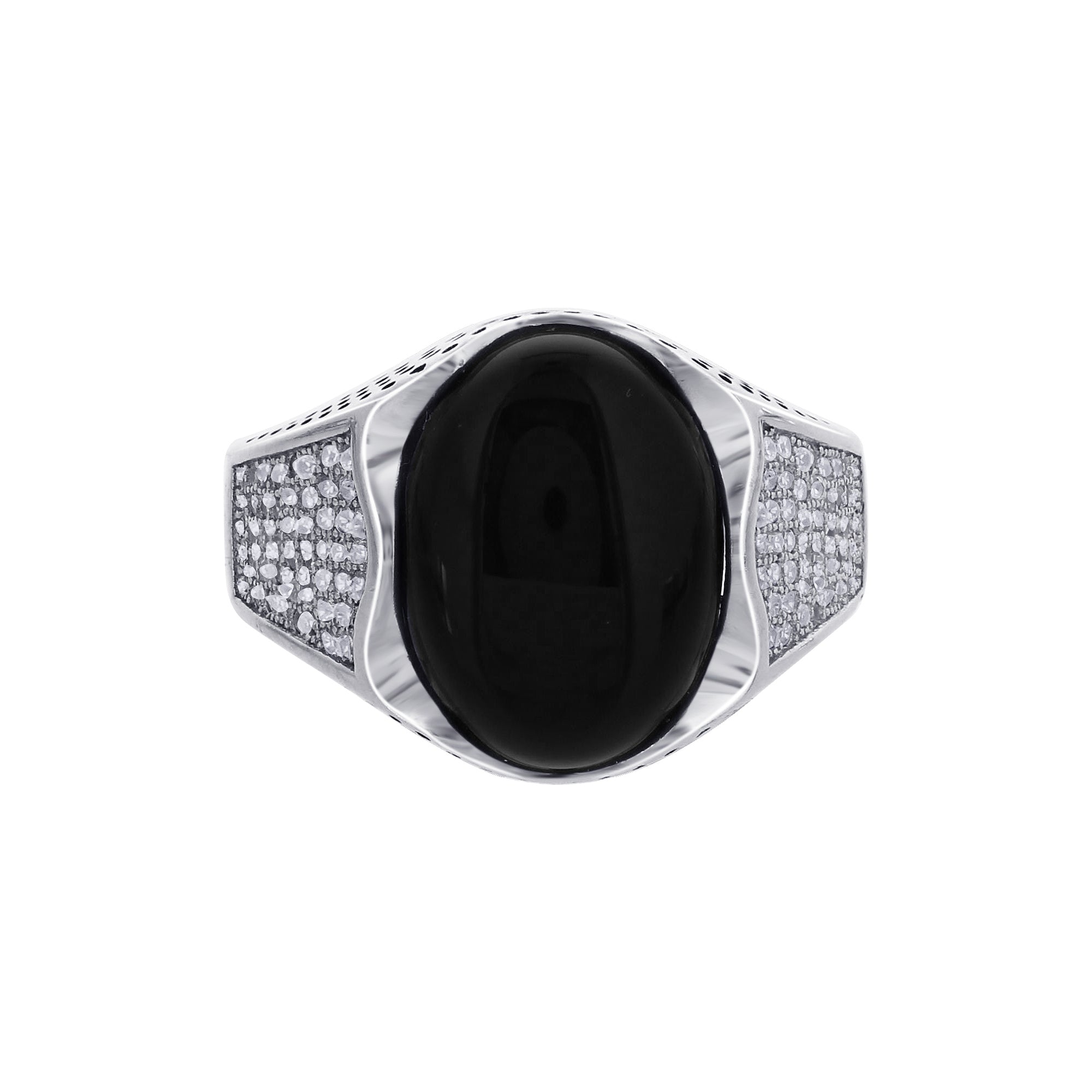 At the heart of this piece lies a stunning Black Onyx oval stone, known for its deep, rich color and calming properties. The stone is beautifully accented by shimmering Cubic Zirconia (CZ) stones, adding a touch of sparkle to the design. This ring is not just a piece of jewelry; it's a statement that reflects your unique taste and sophistication.