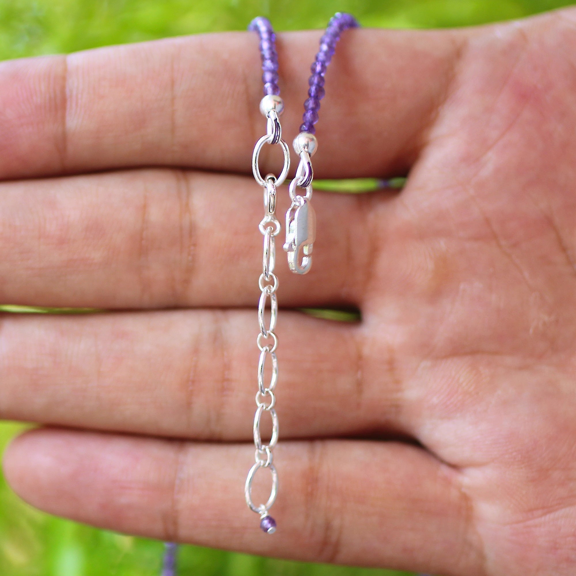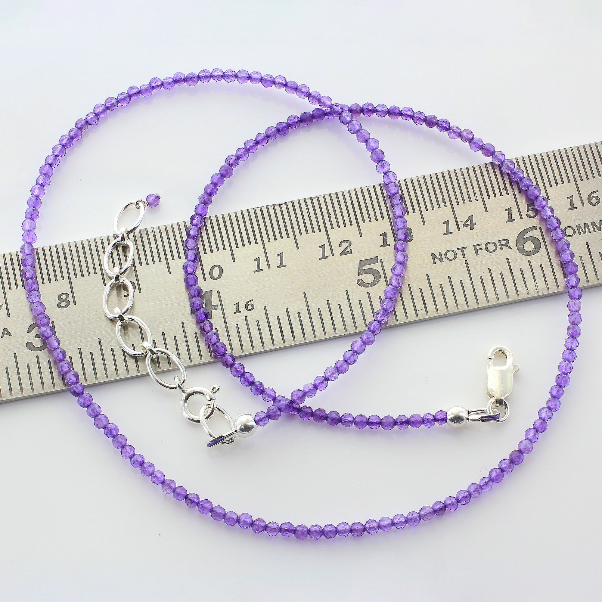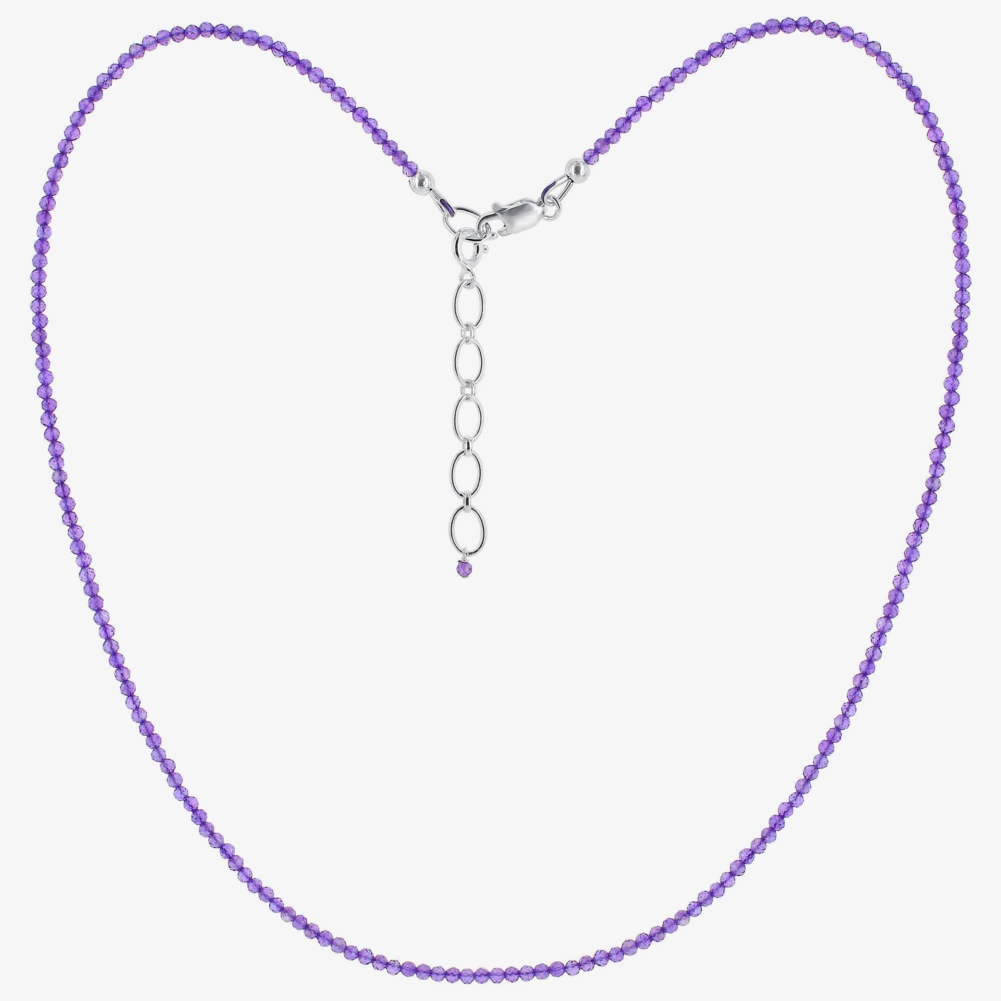 Expertly designed in India, this exquisite 925 sterling silver amethyst necklace adds a delightful burst of color and brilliance to any ensemble. Featuring a rich purple hue and a reliable lobster clasp, this striking piece is an essential accessory for any wardrobe. The necklace has an approximate length of 16 inches, with beads measuring 1.5 mm and a total weight of 4 grams.