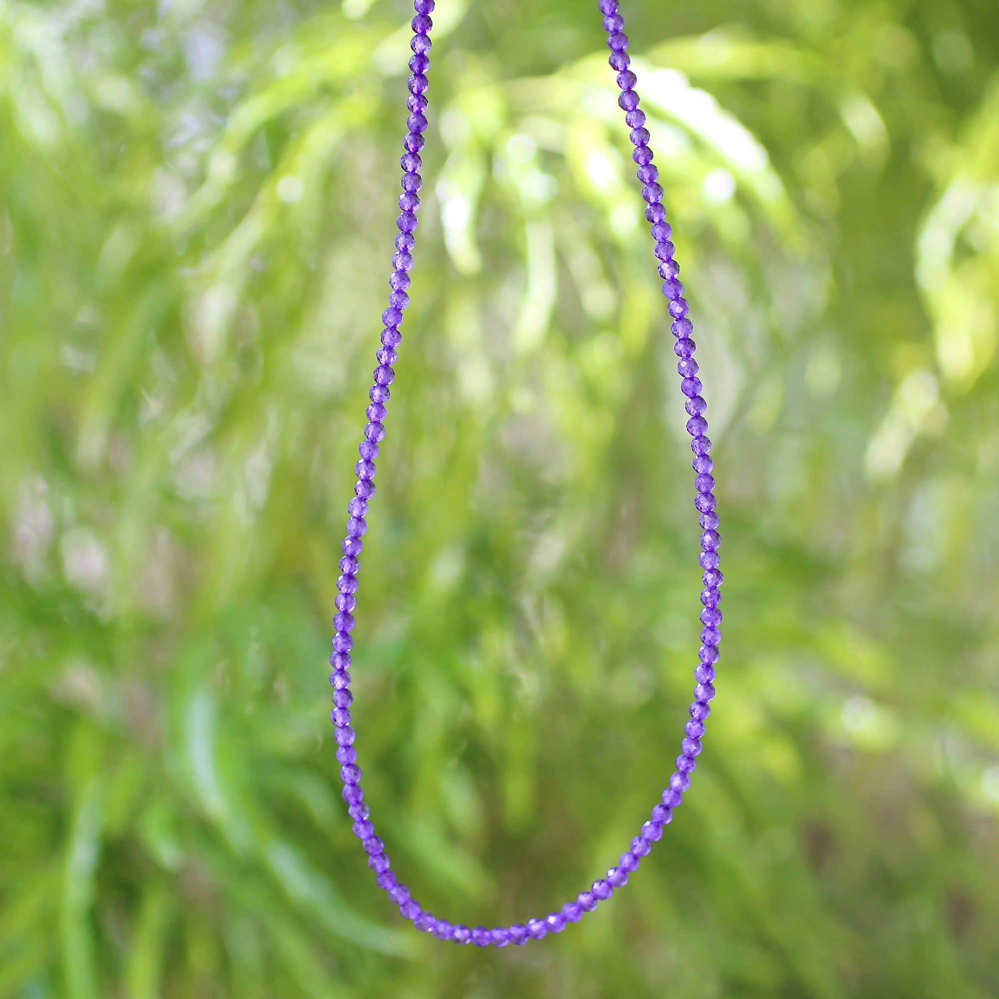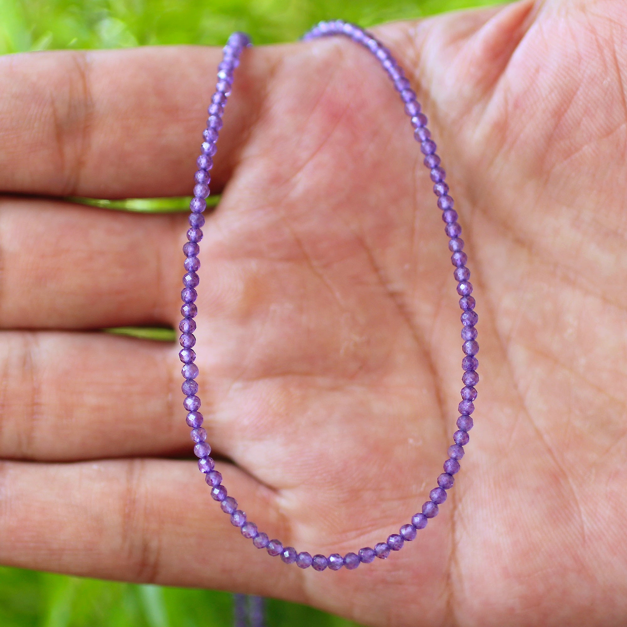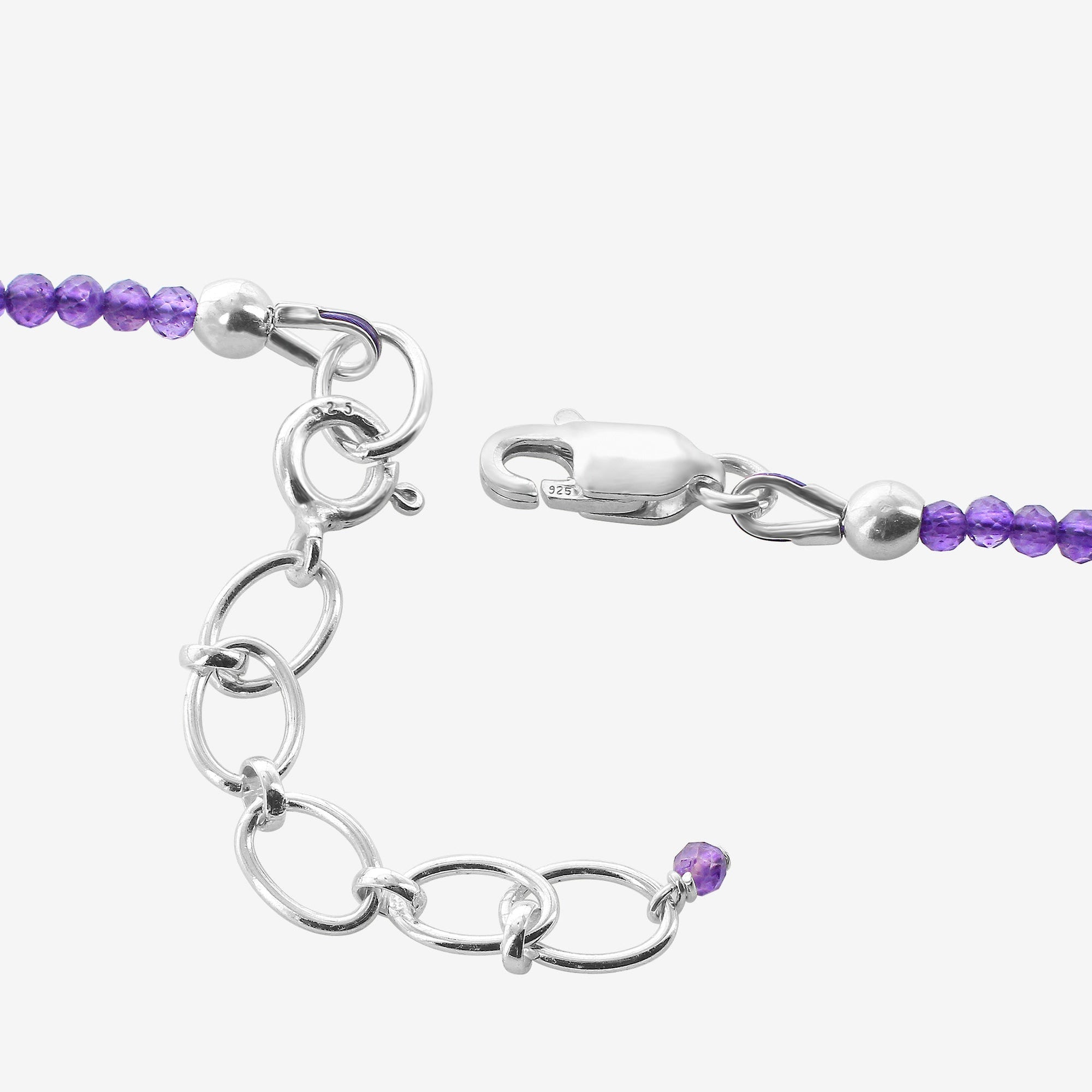 Expertly designed in India, this exquisite 925 sterling silver amethyst necklace adds a delightful burst of color and brilliance to any ensemble. Featuring a rich purple hue and a reliable lobster clasp, this striking piece is an essential accessory for any wardrobe. The necklace has an approximate length of 16 inches, with beads measuring 1.5 mm and a total weight of 4 grams.