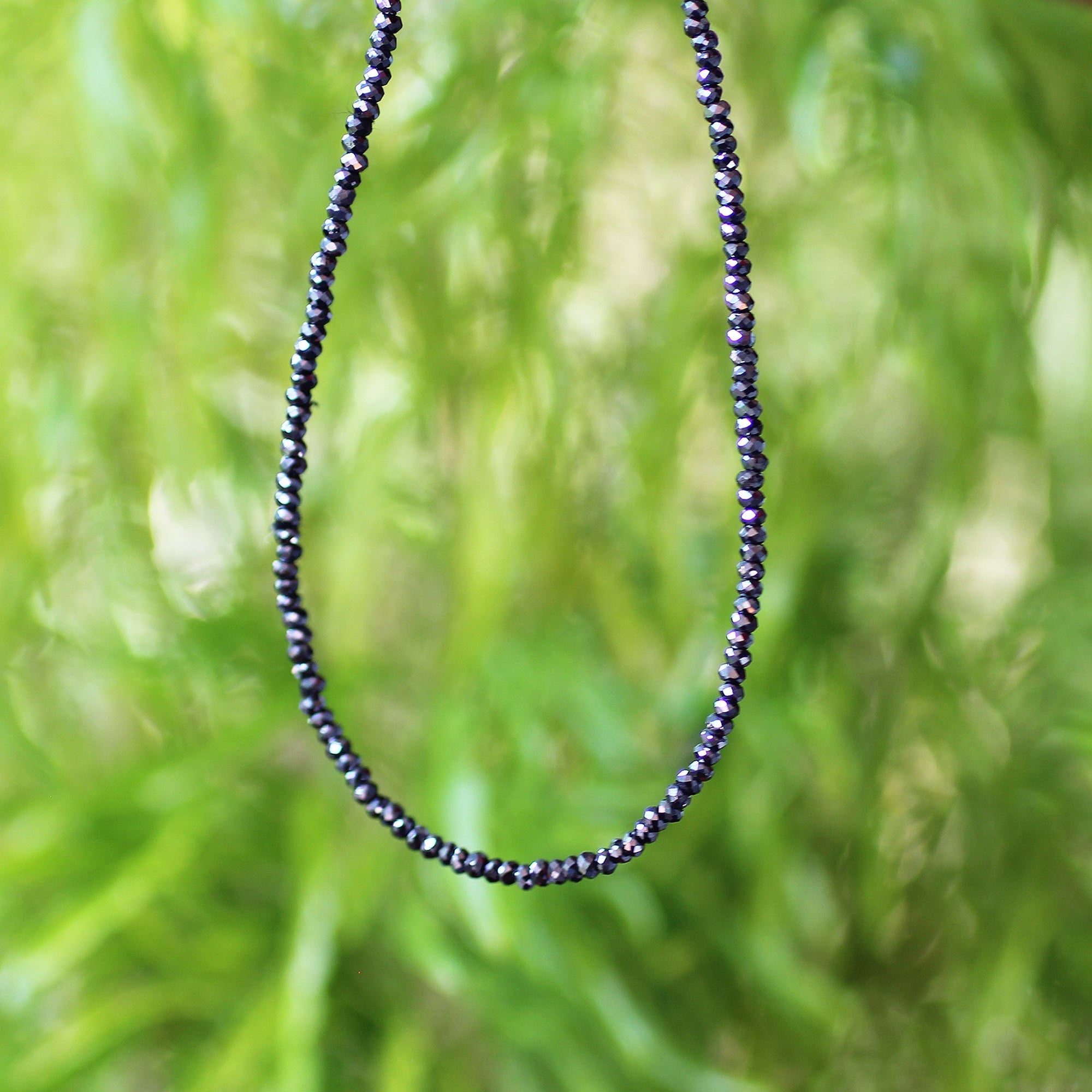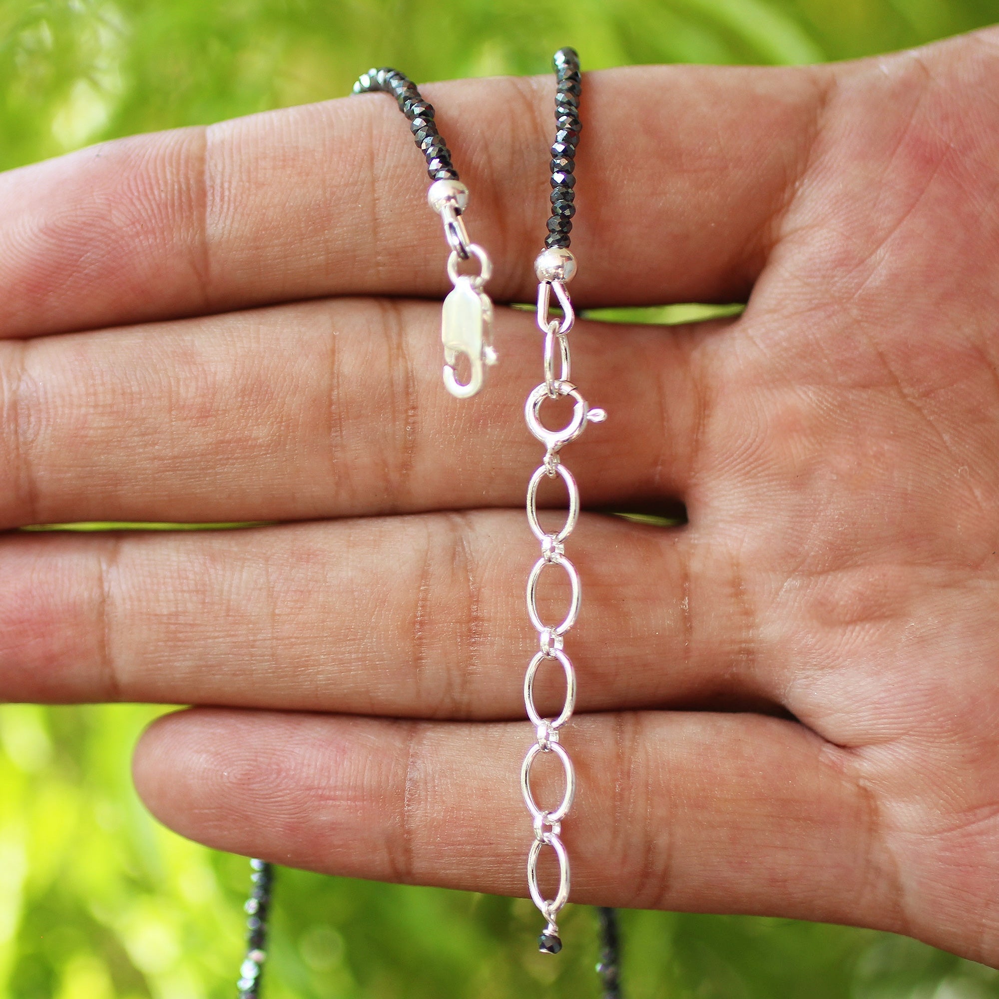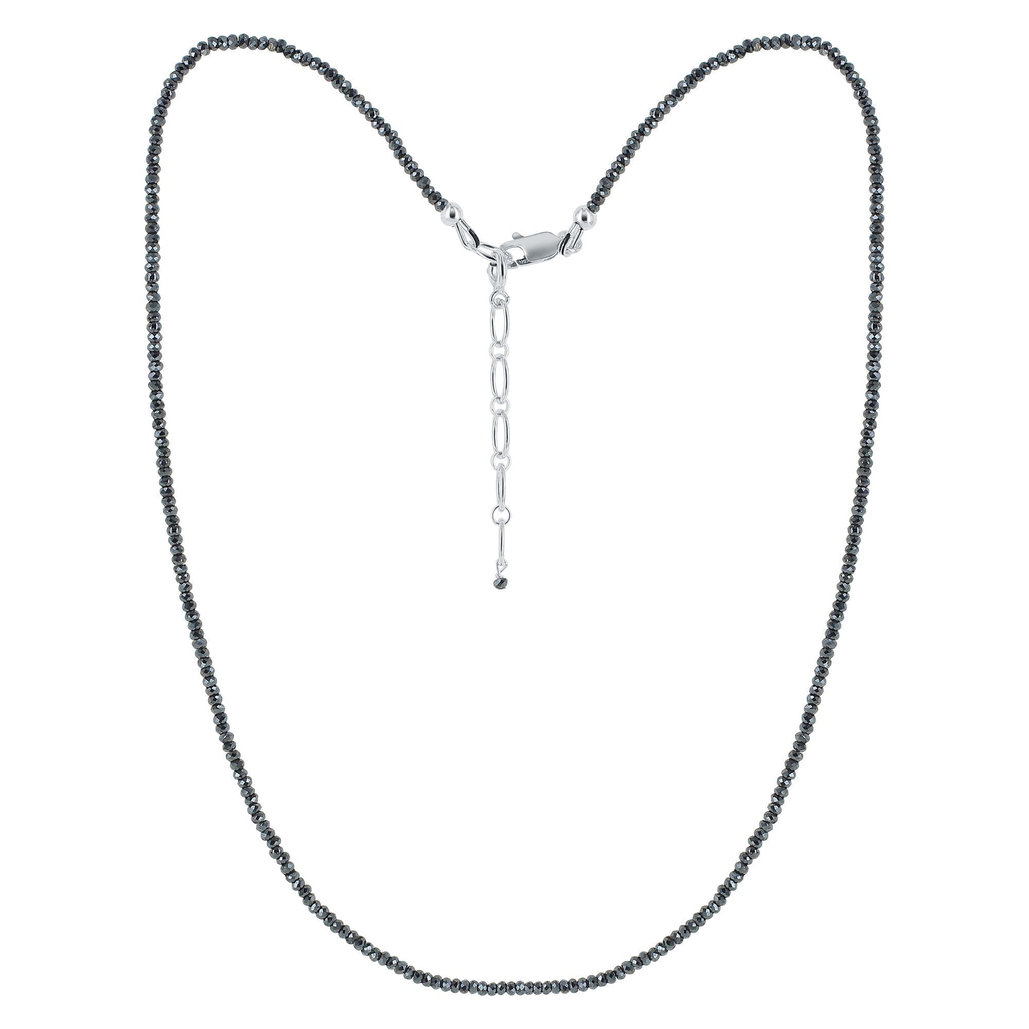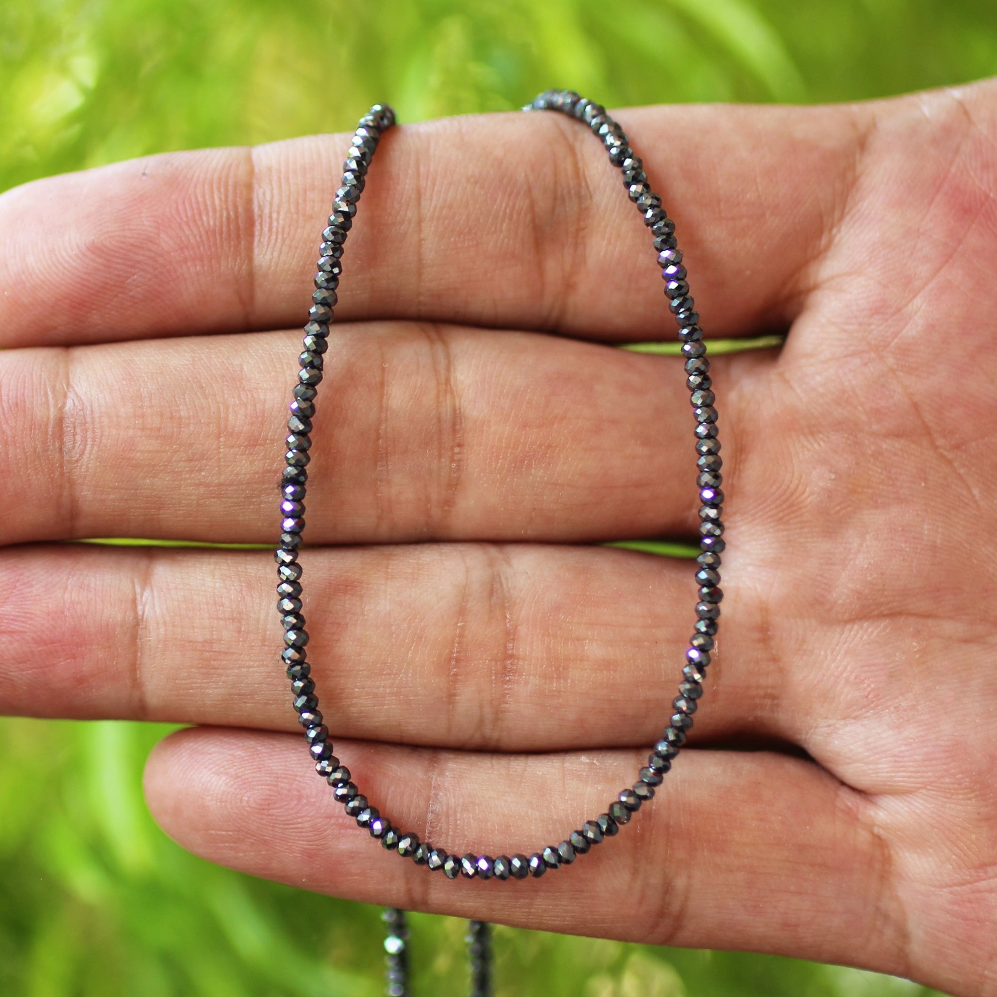 Expertly designed in India, this exquisite sterling silver hematite necklace adds a vibrant touch and a hint of sparkle to any ensemble. Featuring a deep gray hue and a reliable lobster clasp, this remarkable piece is an essential accessory for any wardrobe. The necklace has an approximate length of 16 inches, with beads measuring 1.5 mm and a total weight of 6 grams.