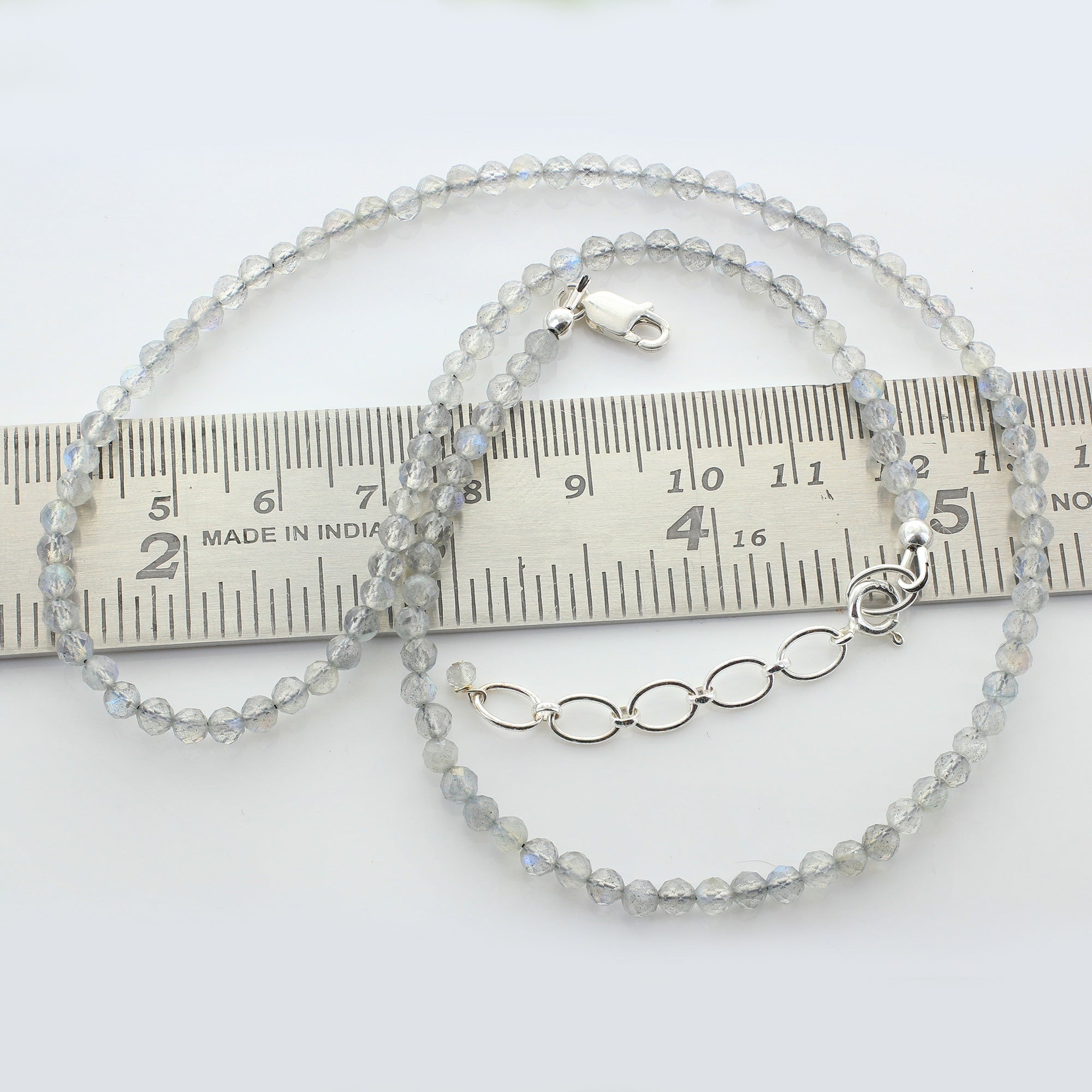 Expertly crafted in India, this exquisite sterling silver Labradorite necklace adds a delightful burst of color and brilliance to any ensemble. Featuring a deep gray hue complemented by striking flashes of blue, purple, green, and yellow, this remarkable piece is secured with a reliable lobster clasp. An essential accessory for any wardrobe, this sterling silver Labradorite necklace is truly a must-have! The necklace measures approximately 16 inches in length, with a bead size of 2 mm, and weighs 7 grams.