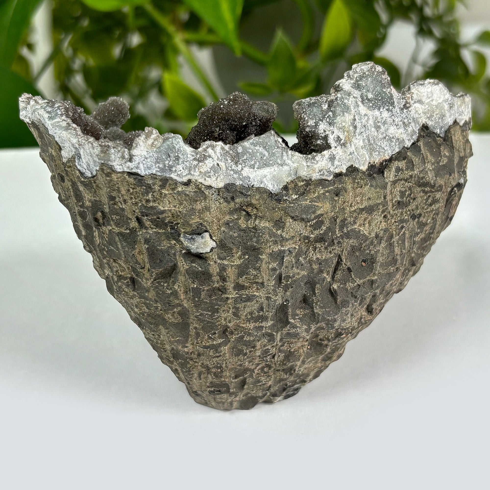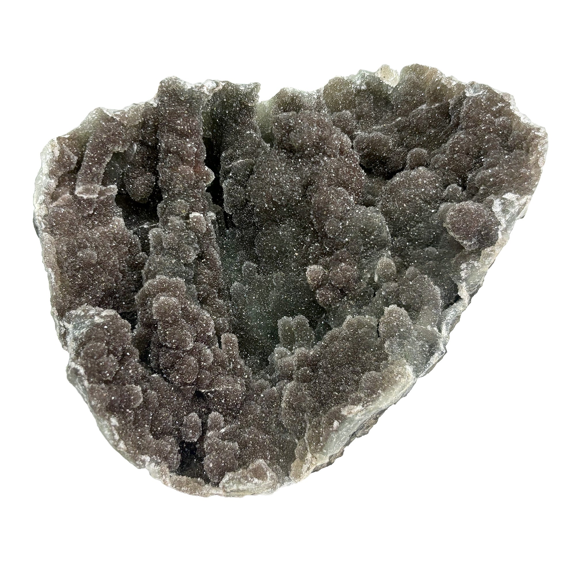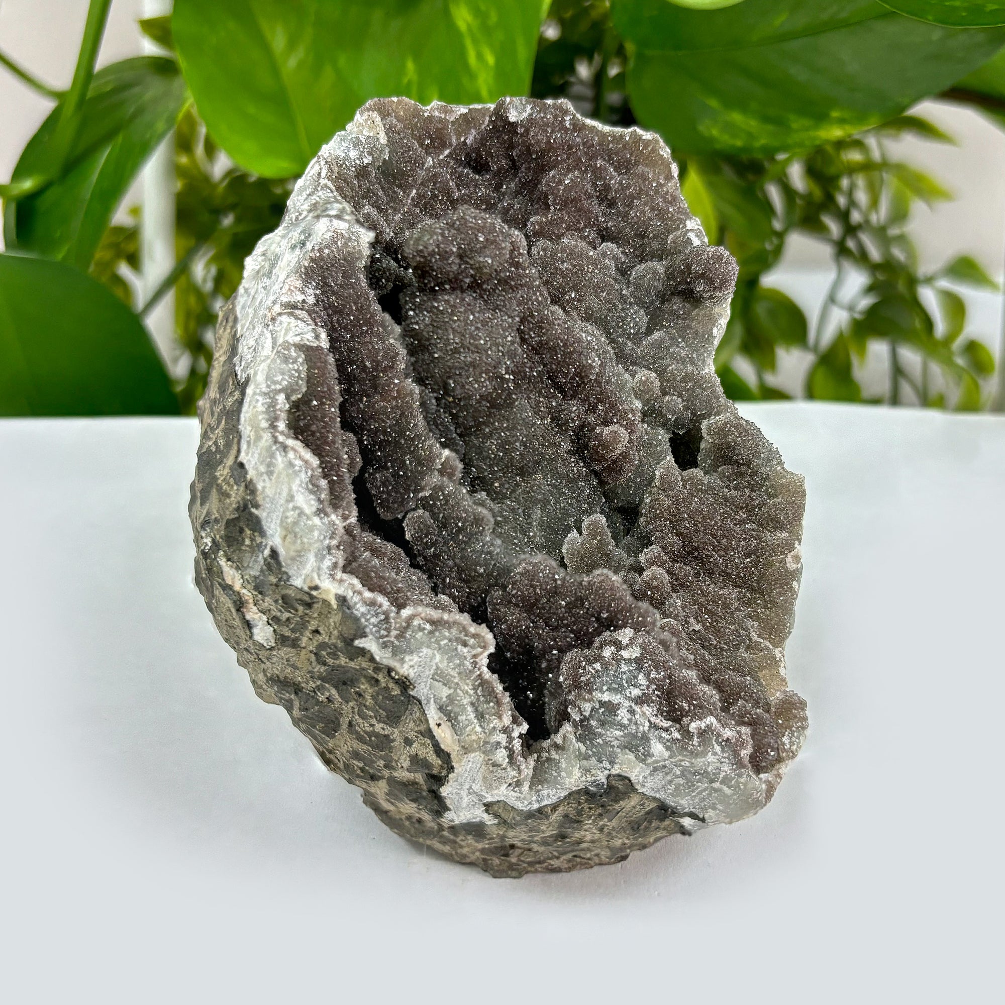 Beautifully unique, this Black Amethyst geode is like no other. Featured on this stunning piece is a rich shade of a grayish purple. Once met with light this geode shimmers and sparkles beautifully. With amazing quality paired with eye-catching beauty, this Amethyst geode will make a perfect addition to any home or collection!