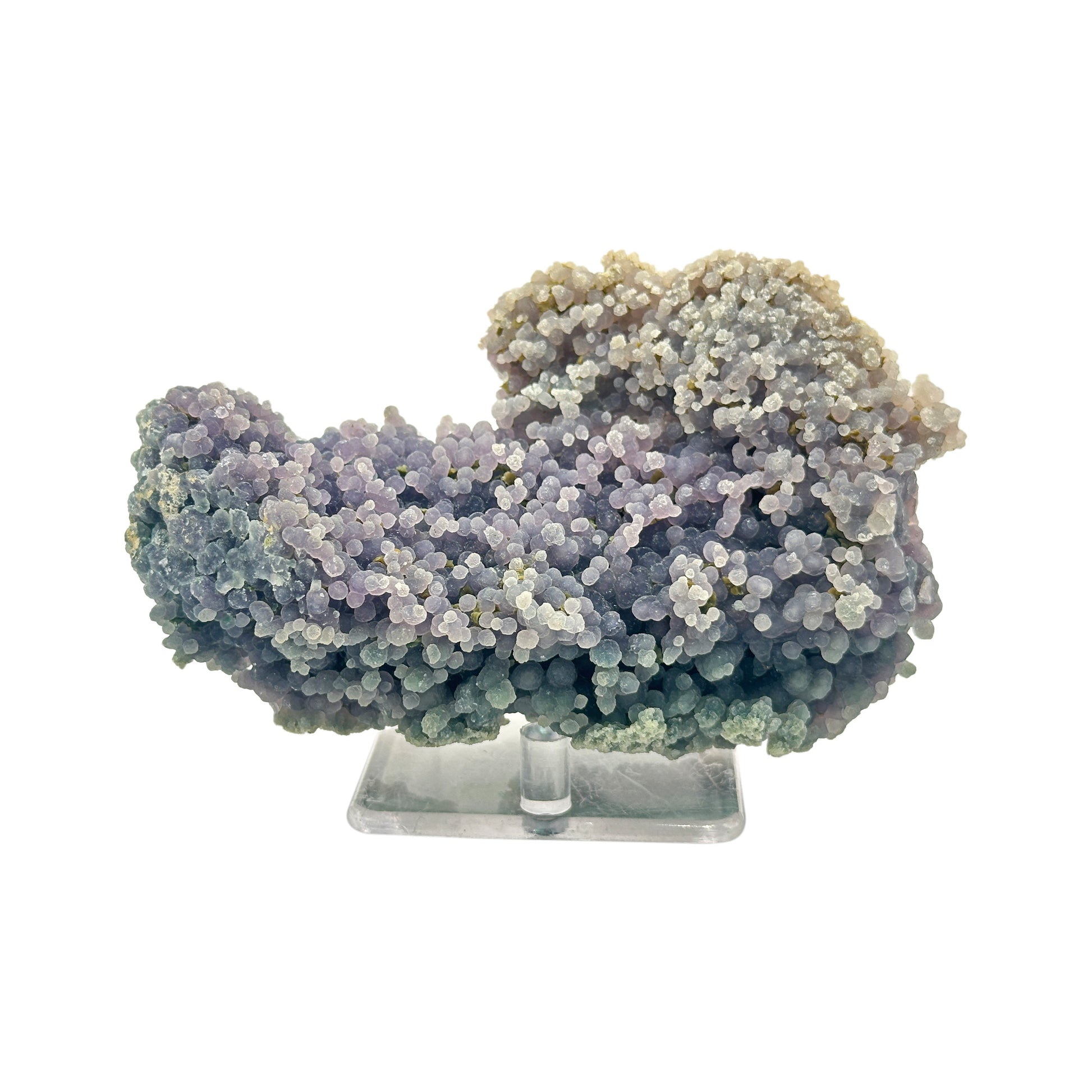 Discover the captivating beauty of this Natural Grape Agate Mineral Specimen, sourced from the lush landscapes of Indonesia. This stunning piece measures approximately 5 inches in length, 2.75 inches in width, and 3 inches in height, and weighs around 1 pound. It showcases a mesmerizing display of deep purple crystal clusters, each one unique and intricately formed, set against a backdrop of clear, translucent agate.
