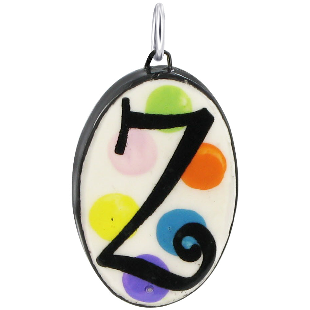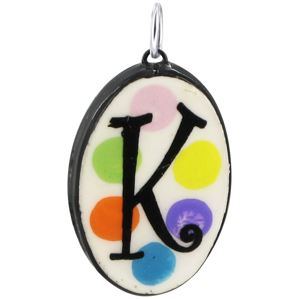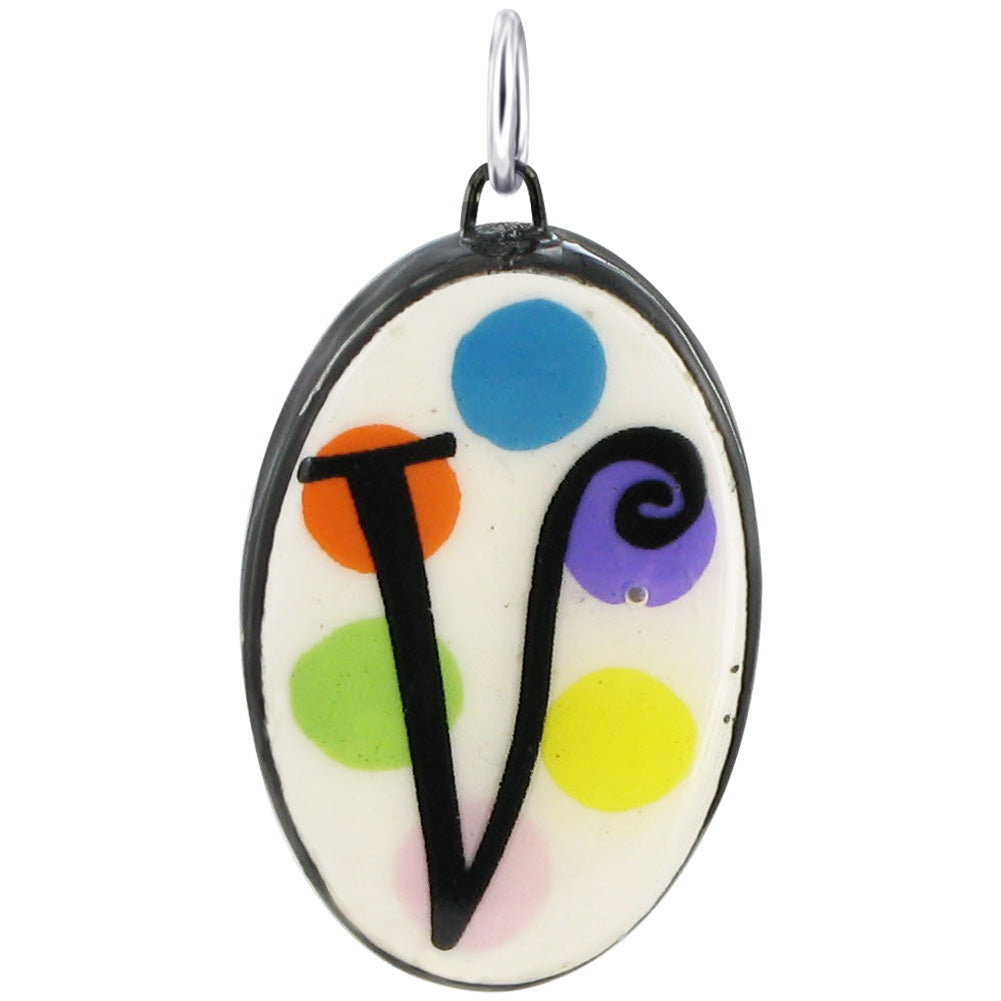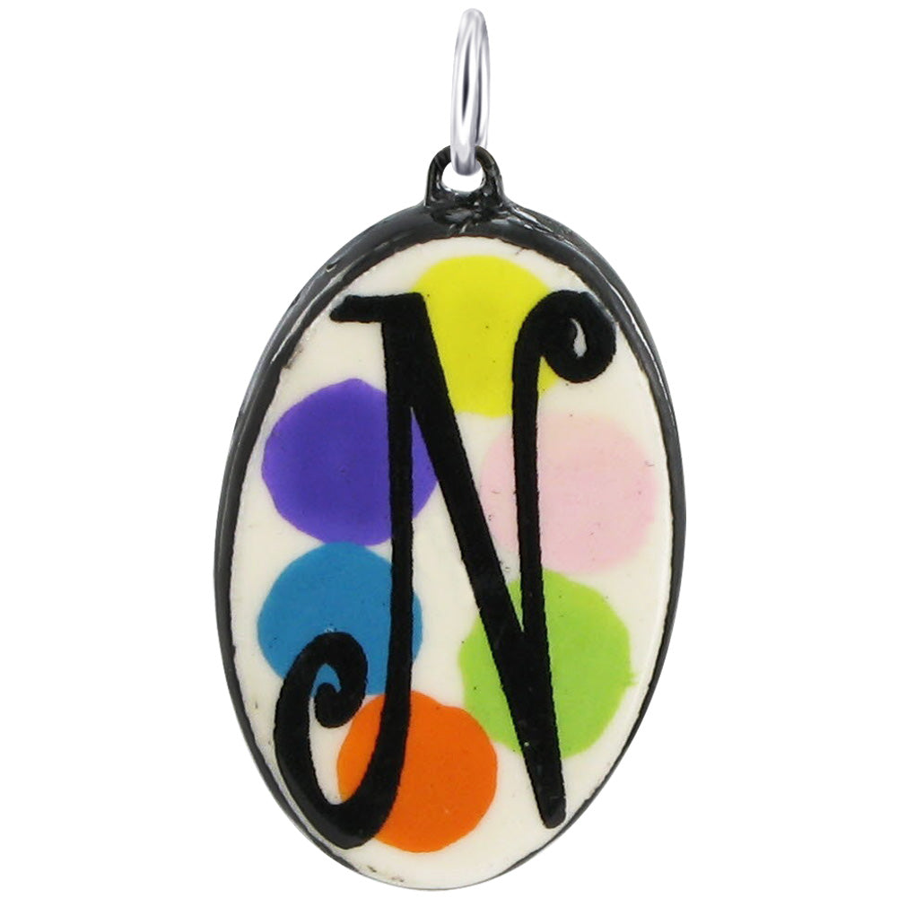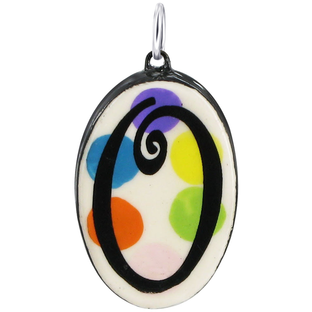 29 x 19mm Oval Hand Painted on Ceramic Initial Pendant with Sterling Silver Bail. Painted with Black Color Alphabet over Yellow, Lime Green, Light Pink, Orange, Blue and Purple Circles. Sterling Silver Bail of this Pendant will go with all Standard Chains.
