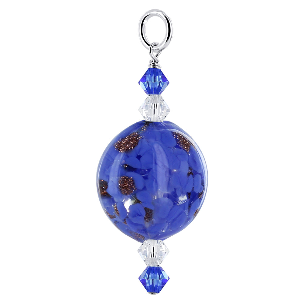 Add a splash of bold color with this stunning pendant. Crafted from .925 sterling silver, the pendant features a cabochon lampwork glass bead with flowers and flecks of gold, measuring 16mm. The pendant also come with 4mm Austrian bicone crystals. Measuring 38mm long, the pendant comes with a jump ring that will fit most standard chains.