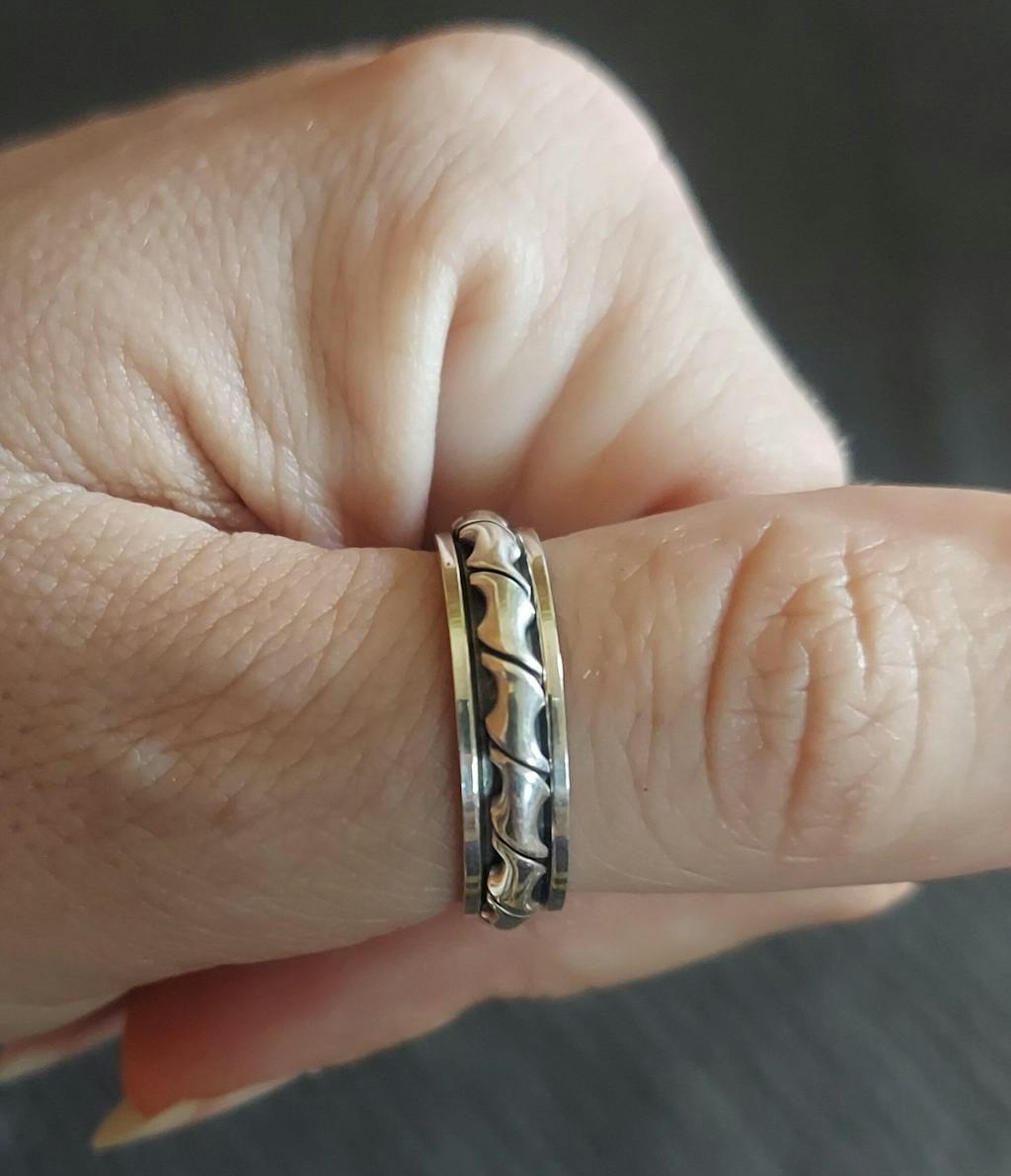 This unique sterling silver spinner band fidget ring is perfect for anyone who loves spinning jewelry. The band is made of 925 sterling silver and features a beautiful blaze design. The spinner ring is easy to spin and makes a great addition to any jewelry collection.