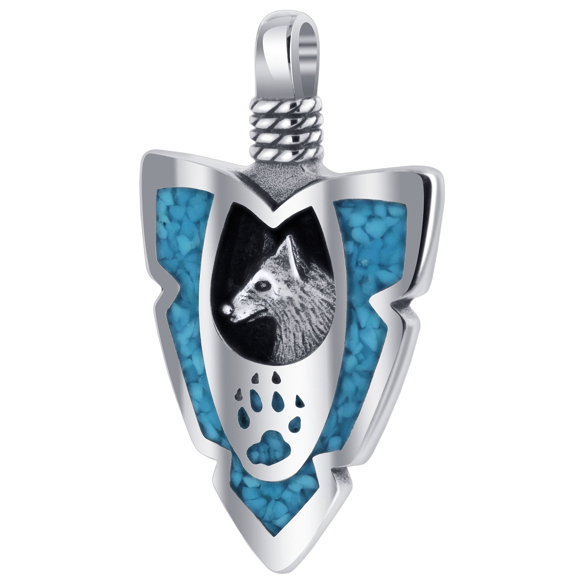 Add beauty to any necklace with this mesmerizing 925 sterling silver Turquoise gemstone arrowhead Wolf pendant. This dazzling blue pendant is adorned with a stunning image of a lone wolf accompanied with a paw print. Dress it up or dress it down this pendant looks beautiful doing both!