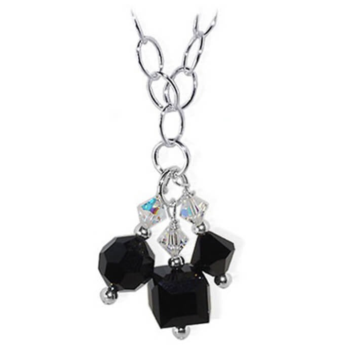 This exquisite handmade necklace is crafted from 925 sterling silver and showcases an oval chain adorned with genuine clear and black Austrian crystals. The design incorporates cube, bicone, and round crystals, all elegantly arranged on a sterling silver oval chain.