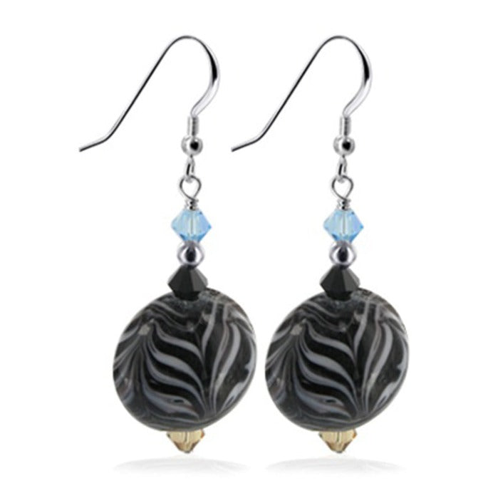 These 925-sterling silver dangle and drop earrings are composed of black glass beads that contain white designs. These earrings also contain black, brown, and blue Austrian crystals. Each pair of earrings measures approximately 1.75 inches top to bottom with French wire hook-back findings to ensure a secure and comfortable fit.