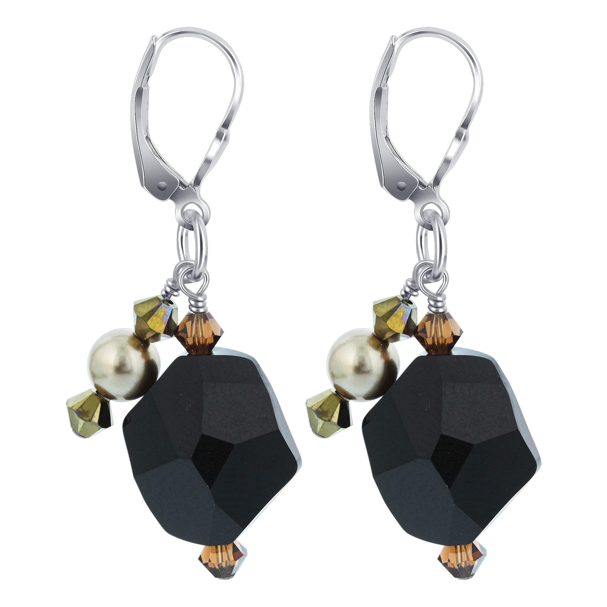 Crafted from 925 sterling silver, these earrings feature bronze imitation pearls along with black and brown Austrian crystals. Ideal for day by day wear, every pair measures about 1.5 inches in length and is designed with a sturdy lever again for a steady and snug fit.