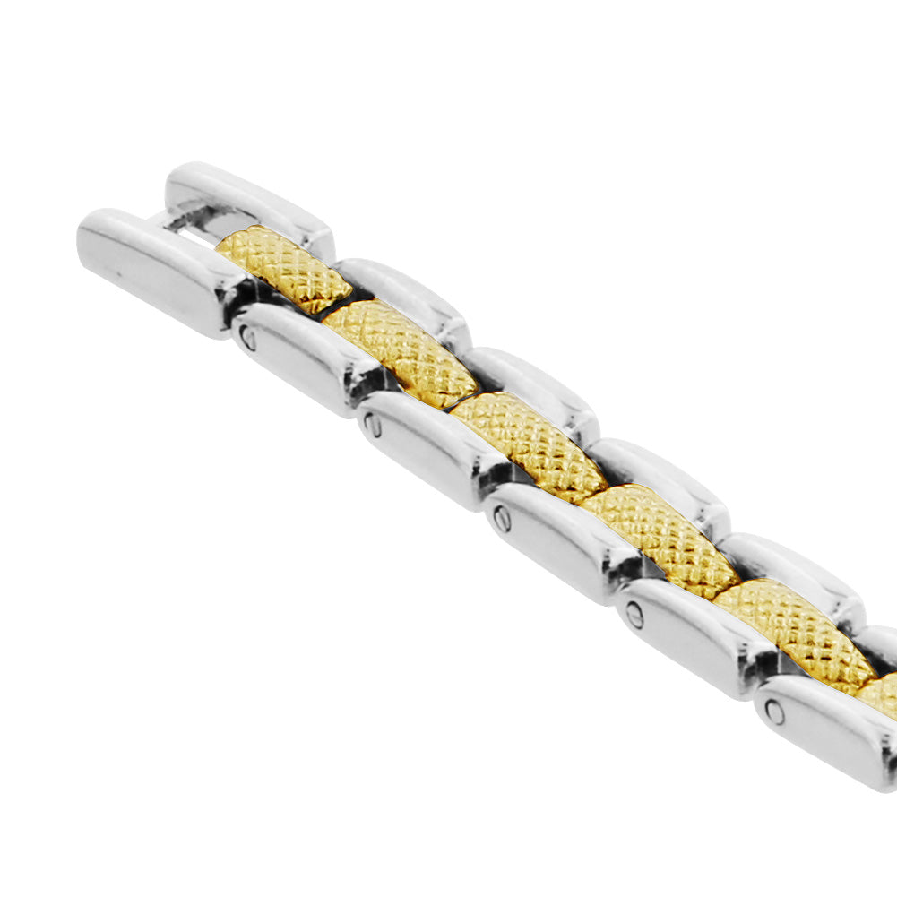 Wrap your wrist in glamour with this stunning two-tone magnetic link bracelet. This beautiful bracelet contains both a lovely silver on the outer edges and gold down the center, as well as 22 magnets on the inside, each measuring 2000 Gauss. Magnets have long been considered to improve blood flow and relieve pain. The bracelet measures 6mm wide and 7.5" long. It contains a fold-over clasp to ensure a secure and comfortable fit, great for everyday wear!