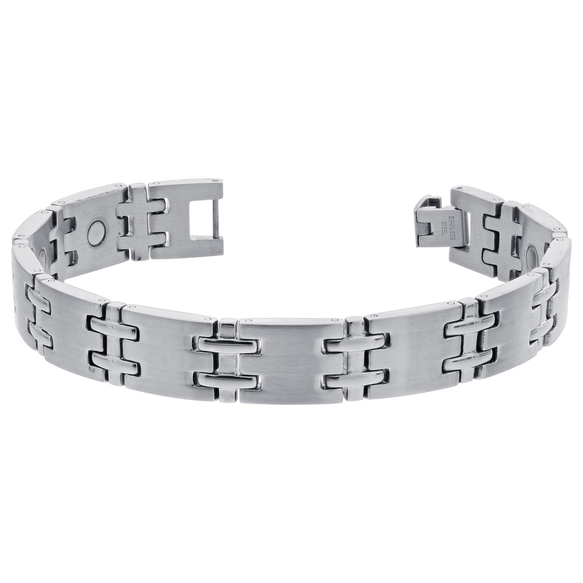 All Stainless Steel magnetic bracelet. Durable Stainless Steel with a mostly brushed finish and partly Shiny polished finish.