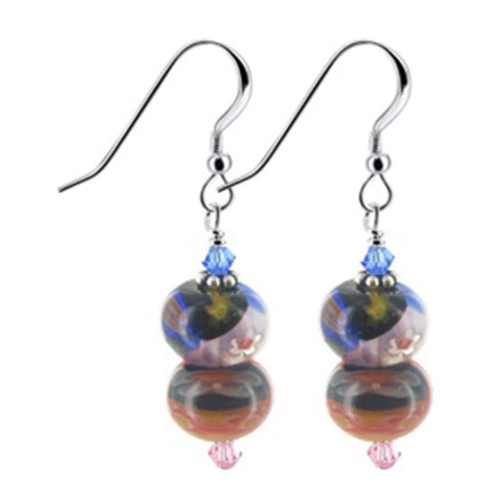 These 925-sterling silver dangle and drop earrings are composed of Millefiori glass that contains a variety of colors and eye-catching designs. These earrings also have pink and blue Austrian Crystals as well as subtle silver bead accents found on both sides. Each pair of earrings measures approximately 1.5 inches long from top to bottom with French wire hook back findings to ensure a secure and comfortable fit.