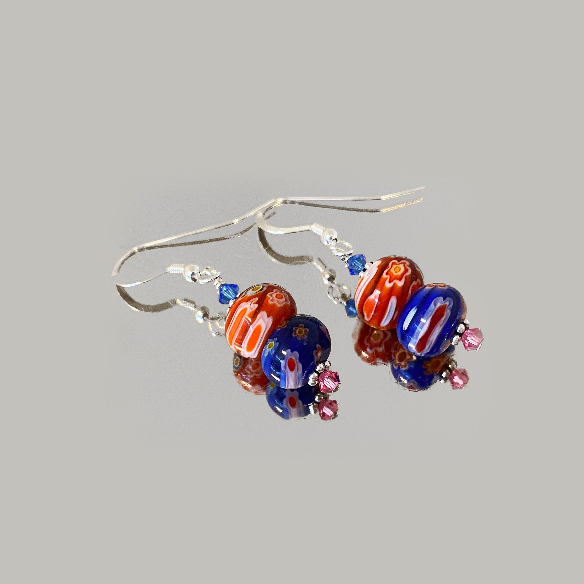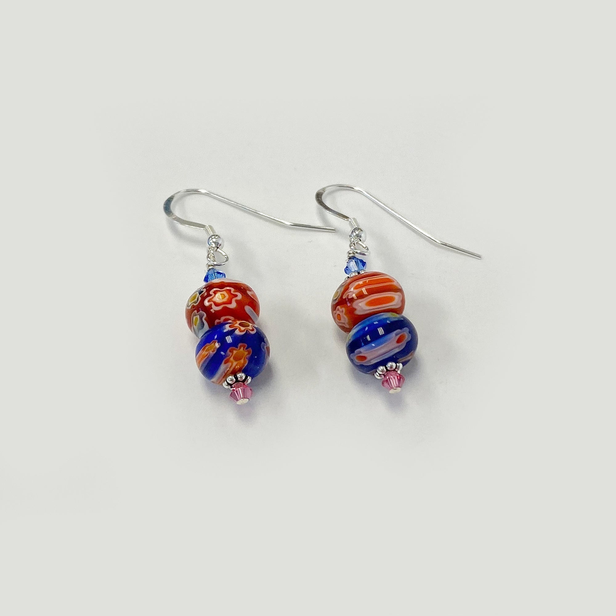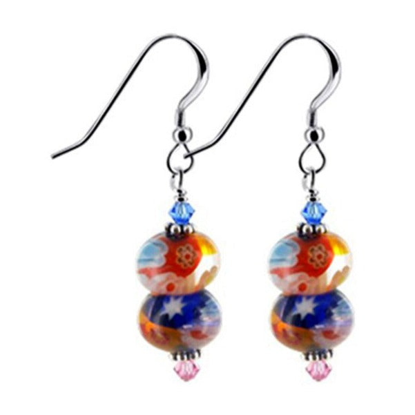 These 925-sterling silver dangle and drop earrings are composed of Millefiori glass that contains a variety of colors and eye-catching designs. These earrings also have pink and blue Austrian Crystals as well as subtle silver bead accents found on both sides. Each pair of earrings measures approximately 1.5 inches long from top to bottom with French wire hook back findings to ensure a secure and comfortable fit.