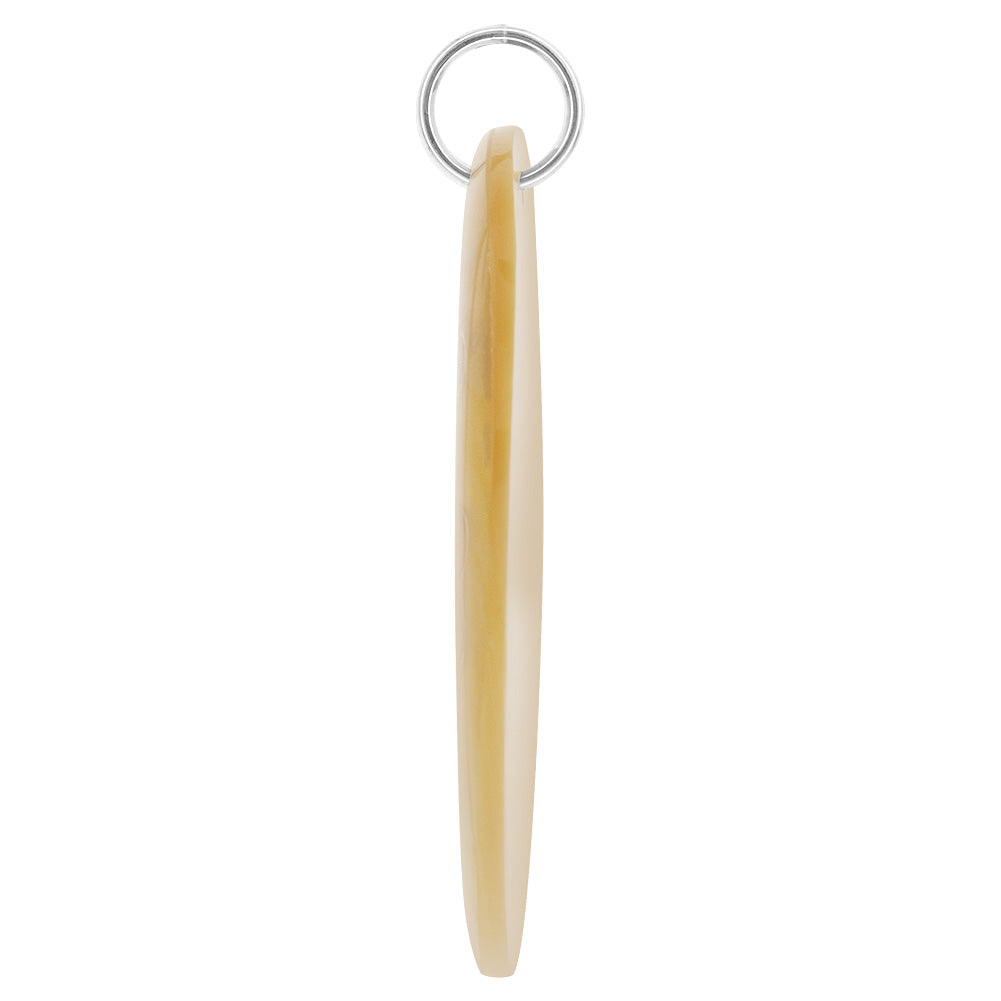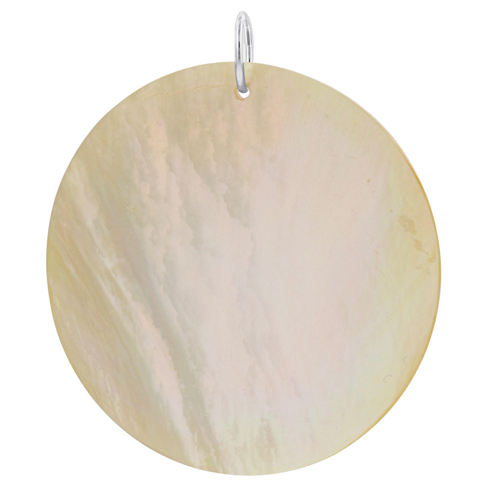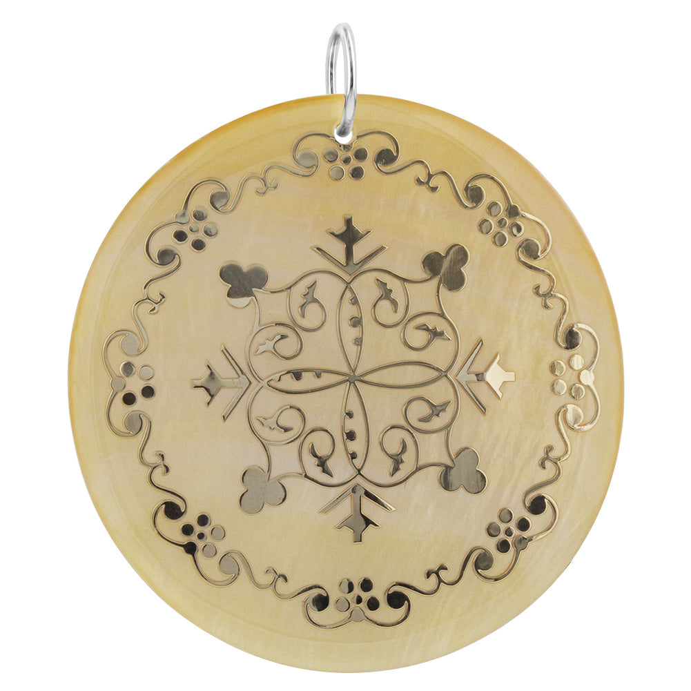 Floral design engraved gold tone mother of pearl charm pendant. Pendant measures 1.75 inch Diameter. The pendant's intricate design provides a timeless elegance that will elevate any outfit you pair it with.