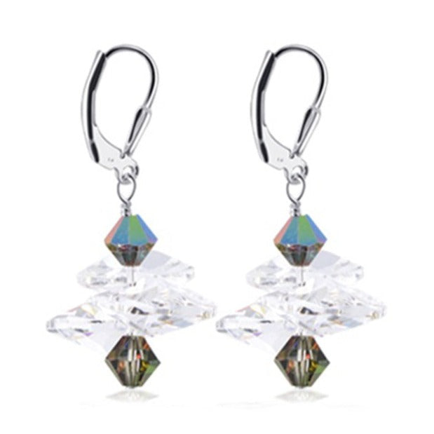 These 925-sterling silver dangle and drop earrings are composed of both clear and vitrail-light Austrian crystals. Each pair of earrings measures approximately 1.5 inches from top to bottom with a firm lever back to ensure both a secure and comfortable fit.