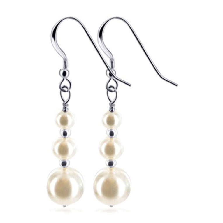 These 925-sterling silver dangle and drop earrings are composed of 3 white faux pearls each differing in size. Each pair of earrings measures approximately 1.5 inches from top to bottom with a French wire hook back findings to ensure a secure and comfortable fit.