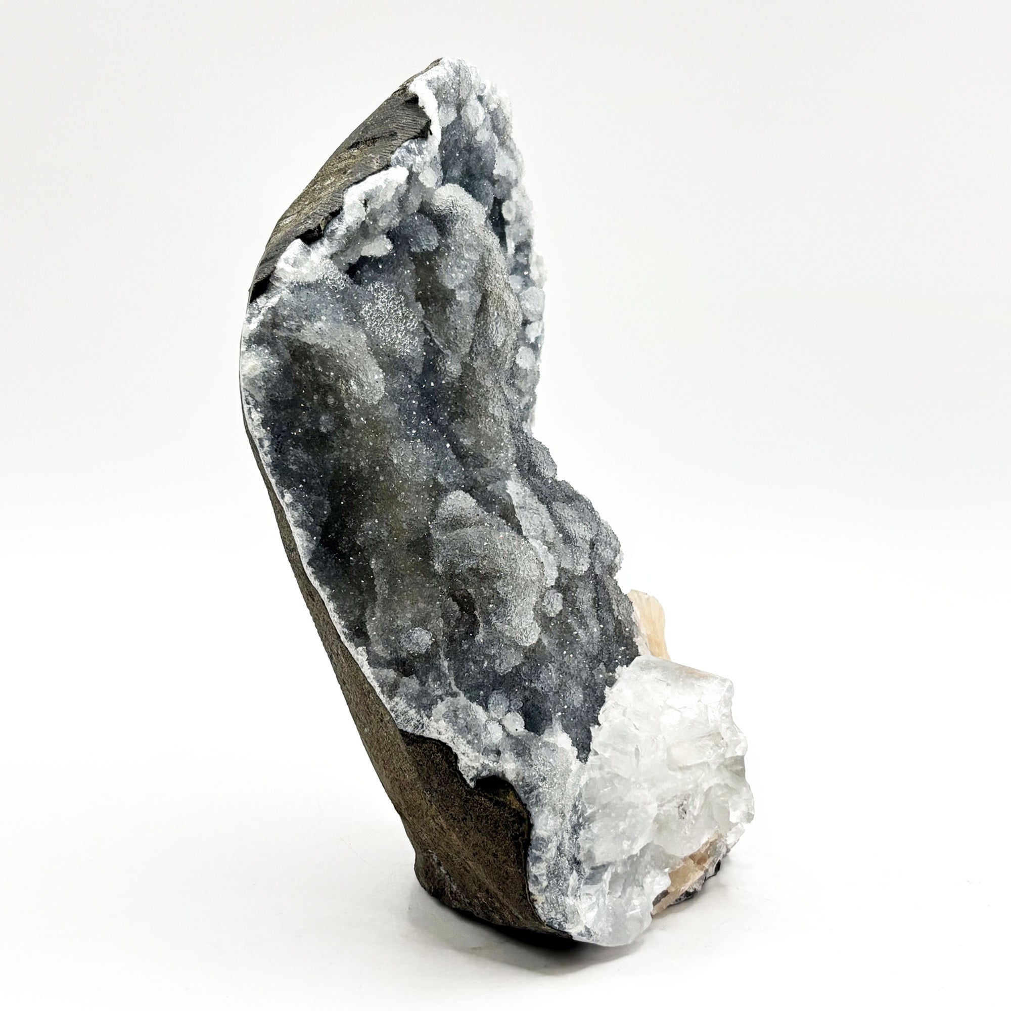 This captivating specimen is a unique cluster of Natural Chalcedony, Apophyllite, and Stilbite crystals, mined from the rich mineral deposits of India. The cluster measures approximately 3.25 inches in length, 1.5 inches in width, and 5.5 inches in height, with a total weight of about 1.92 pounds. The crystals exhibit a beautiful, translucent appearance, with the Chalcedony showcasing its signature banded pattern, while the Apophyllite and Stilbite display delicate, needle-like formations.