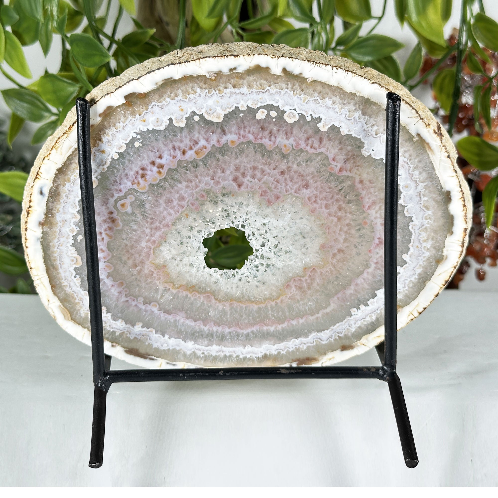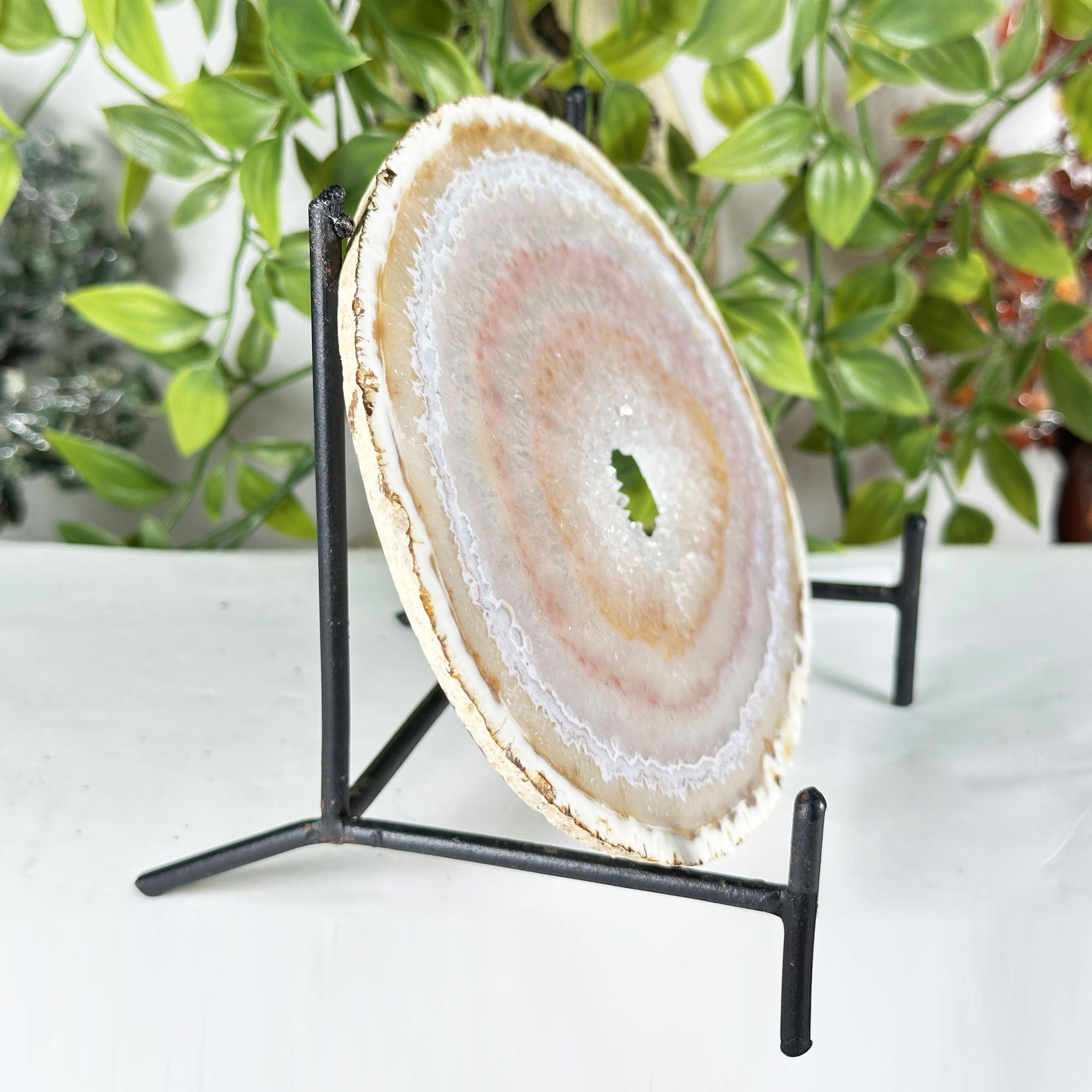 This agate slab with druzy center is a collector favorite and a standout display piece precisely because it combines the quiet elegance of banded agate with the dazzling sparkle of a natural druzy formation in a single flat and highly displayable form. It works beautifully as a shelf or mantle accent, a light-catching window piece, a wall art element, or a decorative base for other crystals and natural objects, and its lightweight form makes it easy to reposition and style in any setting. Agate is associated with balance and grounding while druzy crystals are linked to amplified energy and clarity, making this combined specimen a meaningful and energetically rich addition to any home, office, or sacred space. Whether you are a dedicated crystal collector or simply someone who appreciates the extraordinary artistry of the natural world, this polished agate druzy slab is a piece that rewards close attention and grows more beautiful the longer you spend with it.