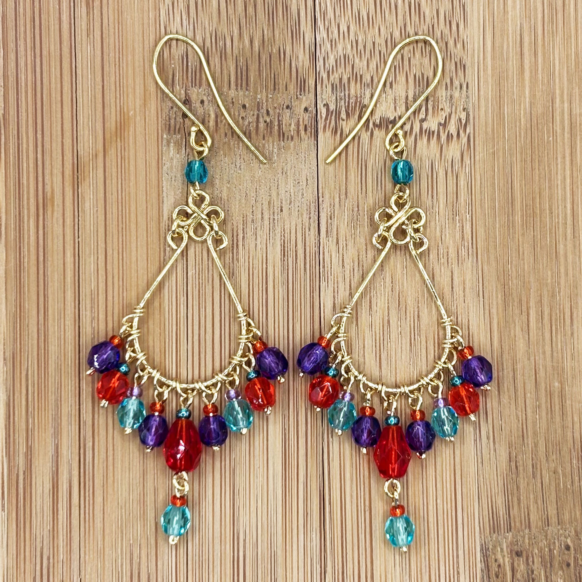 - description_tag : Elegant gold tone chandelier drop earrings featuring multicolor fire polished beads and hypoallergenic stainless steel hooks, perfect for any occasion. Gem Avenue in Charlotte.