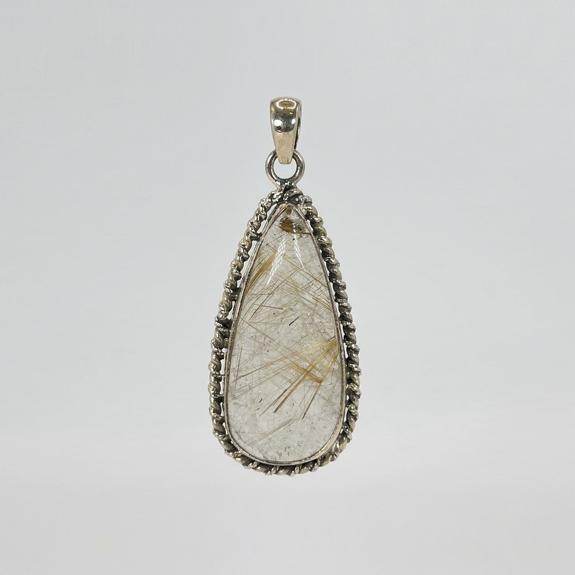 This teardrop pendant is made of genuine golden rutilated quartz set in 925 sterling silver. The natural rutile gemstone showcases beautiful golden needles, with the piece weighing 10.11 grams for a substantial yet comfortable feel.