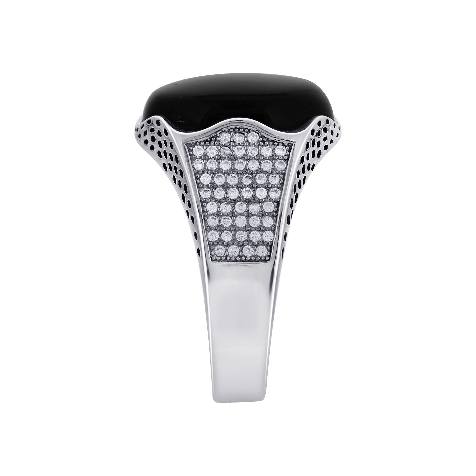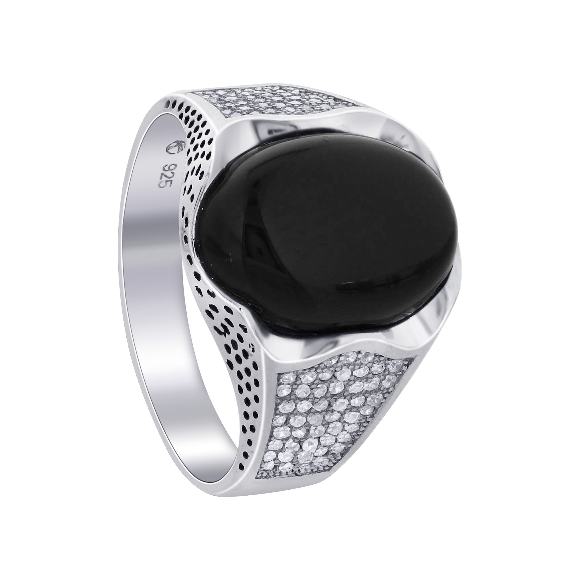 At the heart of this piece lies a stunning Black Onyx oval stone, known for its deep, rich color and calming properties. The stone is beautifully accented by shimmering Cubic Zirconia (CZ) stones, adding a touch of sparkle to the design. This ring is not just a piece of jewelry; it's a statement that reflects your unique taste and sophistication.