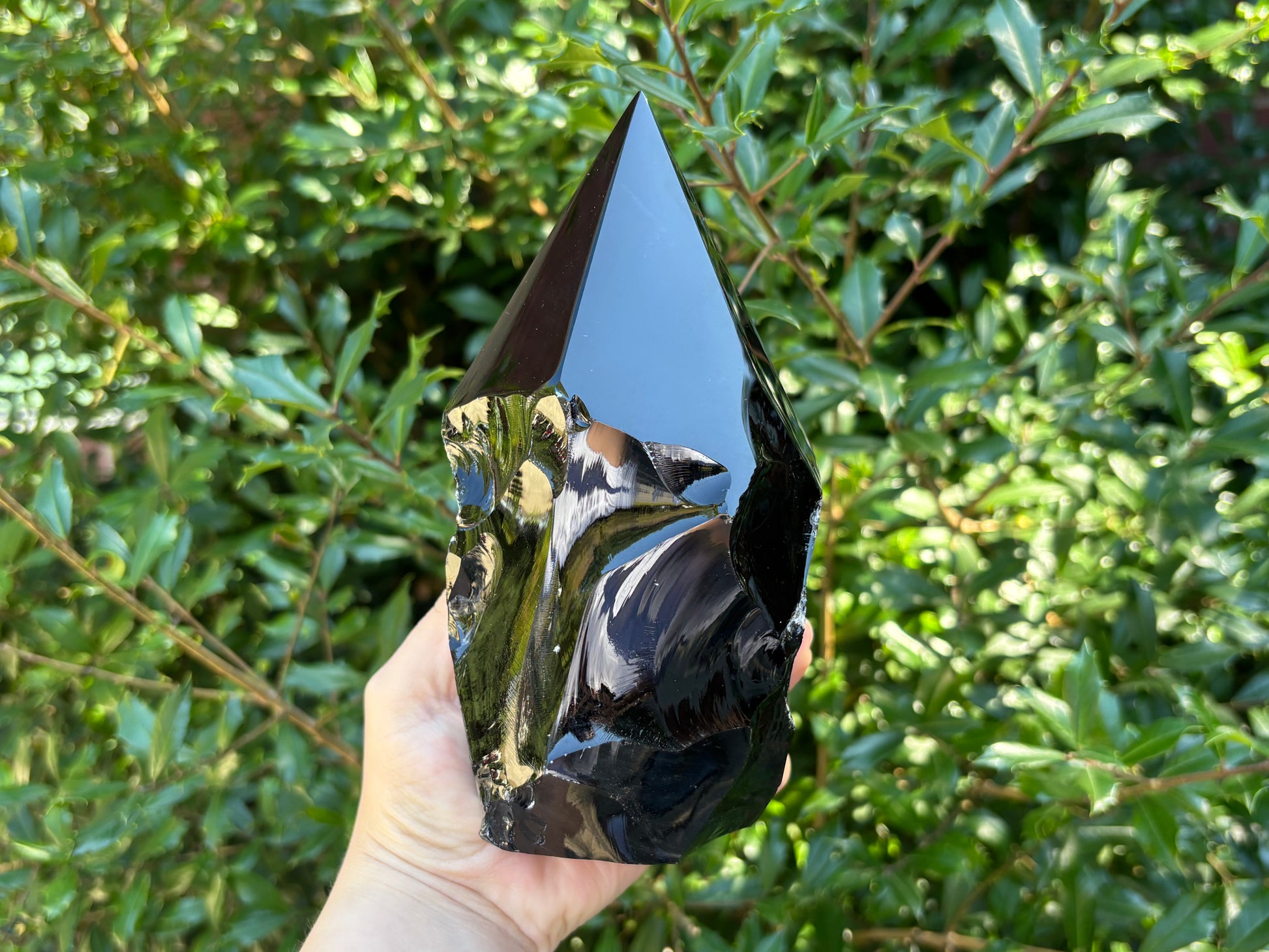 This Natural Black Obsidian Crystal Tower Point measures approximately 3 inches in length, 2.5 inches in width, and 6.75 inches in height. It weighs about 2.98 Lbs. The tower point shape is ideal for meditation and home decor. This towering obsidian crystal point originates from Mexico, known for its powerful, grounding, protective, and healing properties.