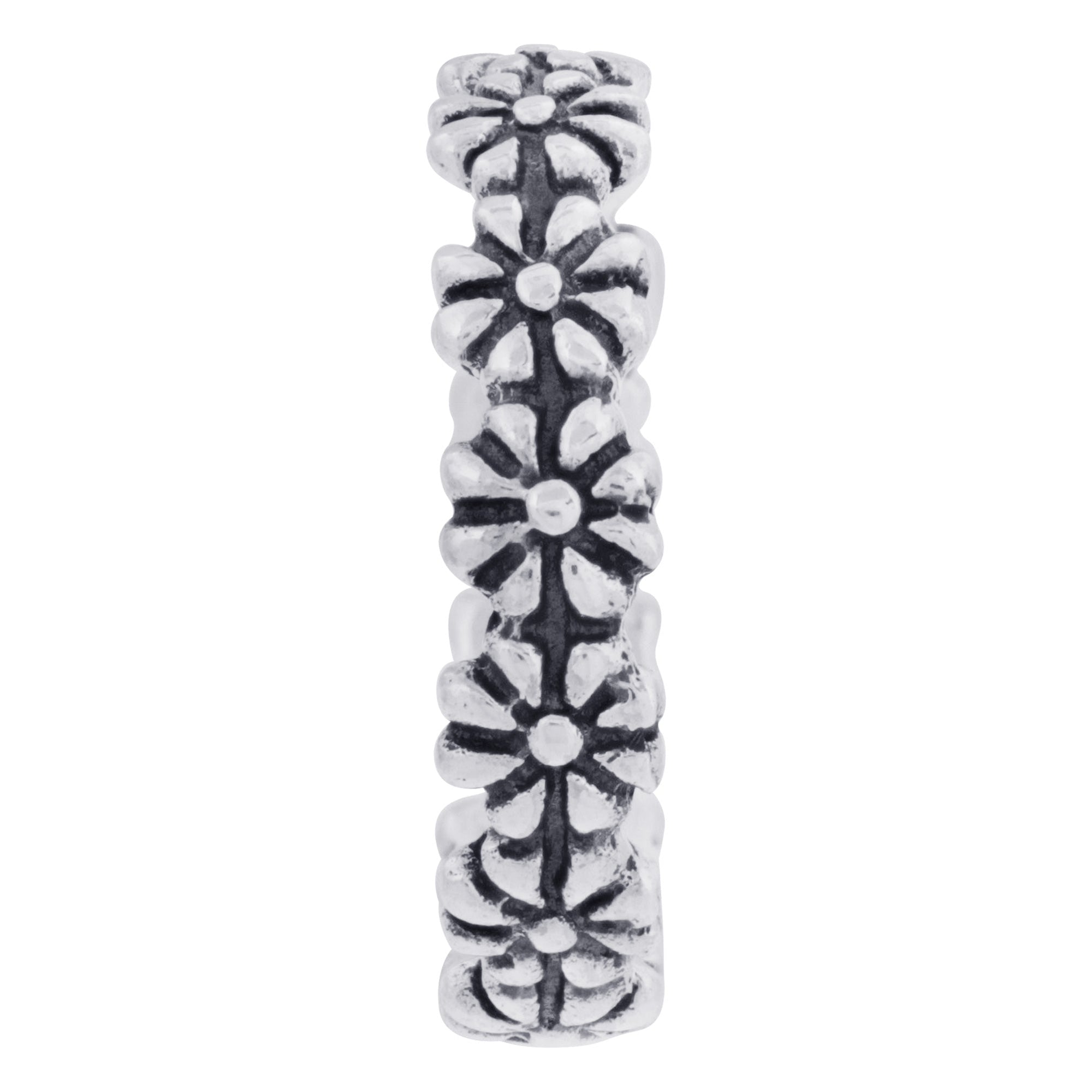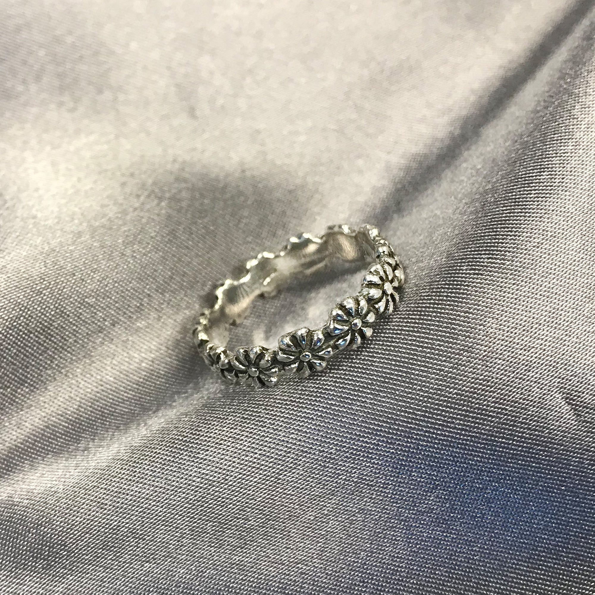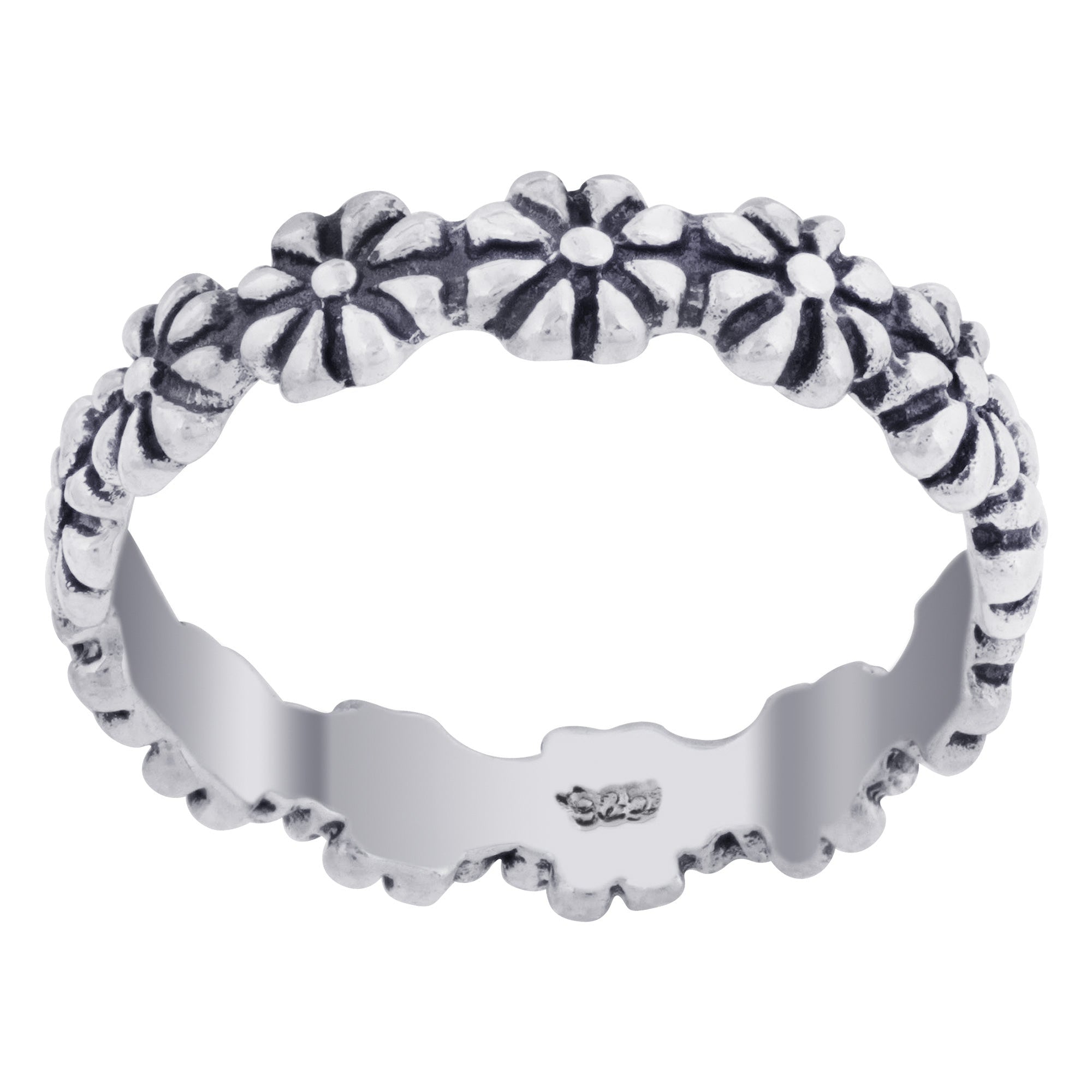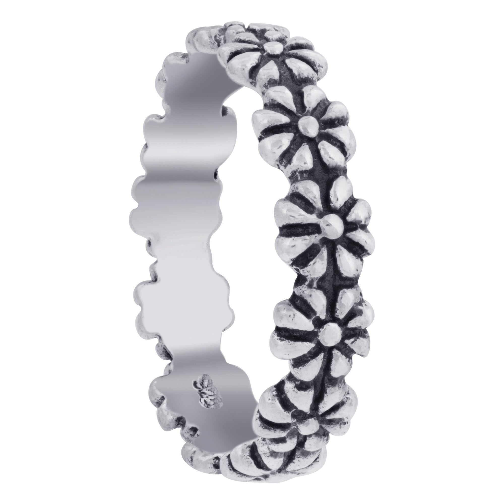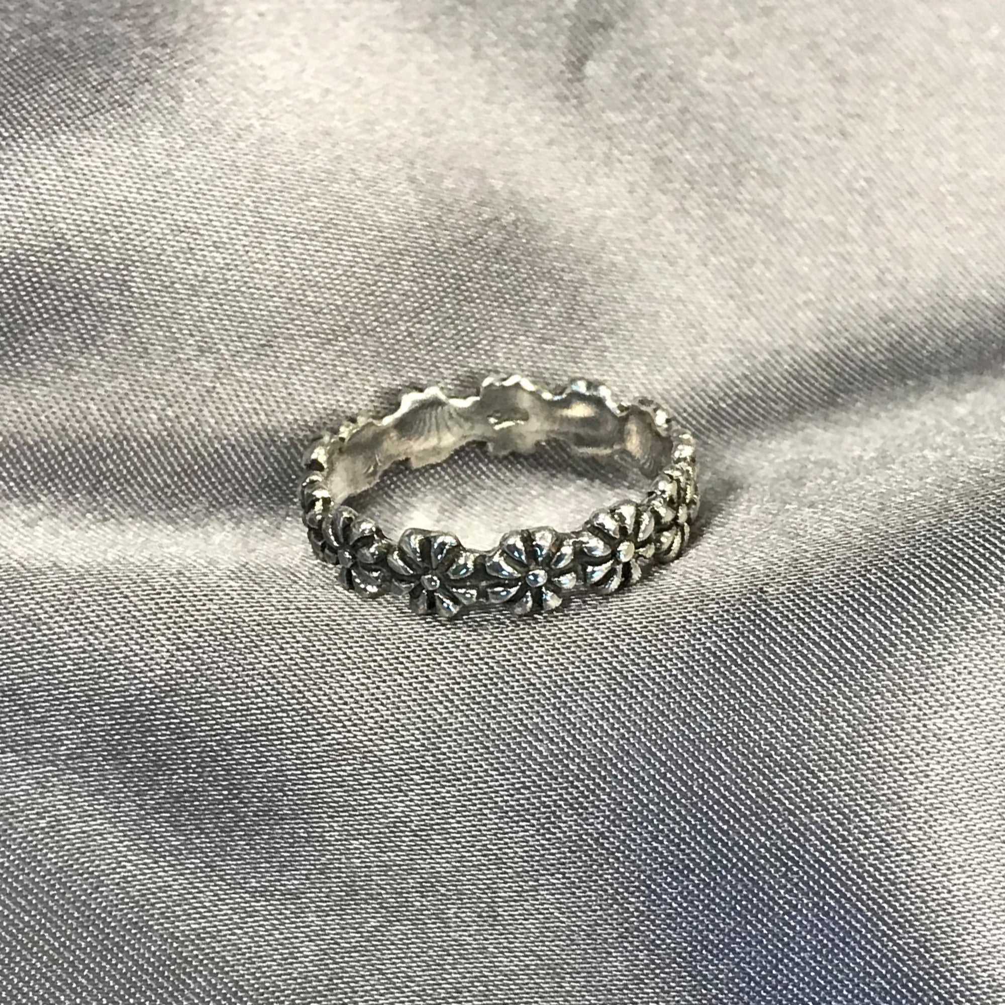 Lovely .925 sterling silver daisy flower ring. This beautiful ring comes in sizes 3, 4, 5, 6, 7, 8, and 9. Cute and comfortable, this ring is great for everyday wear! The width of the band is approximately 4 mm wide and looks wonderful on its own or stacked with another ring for a custom look that's all yours. Whether you give this as a gift or buy it for yourself, this ring is sure to delight all those who see it. Perfect for surprising that special someone.