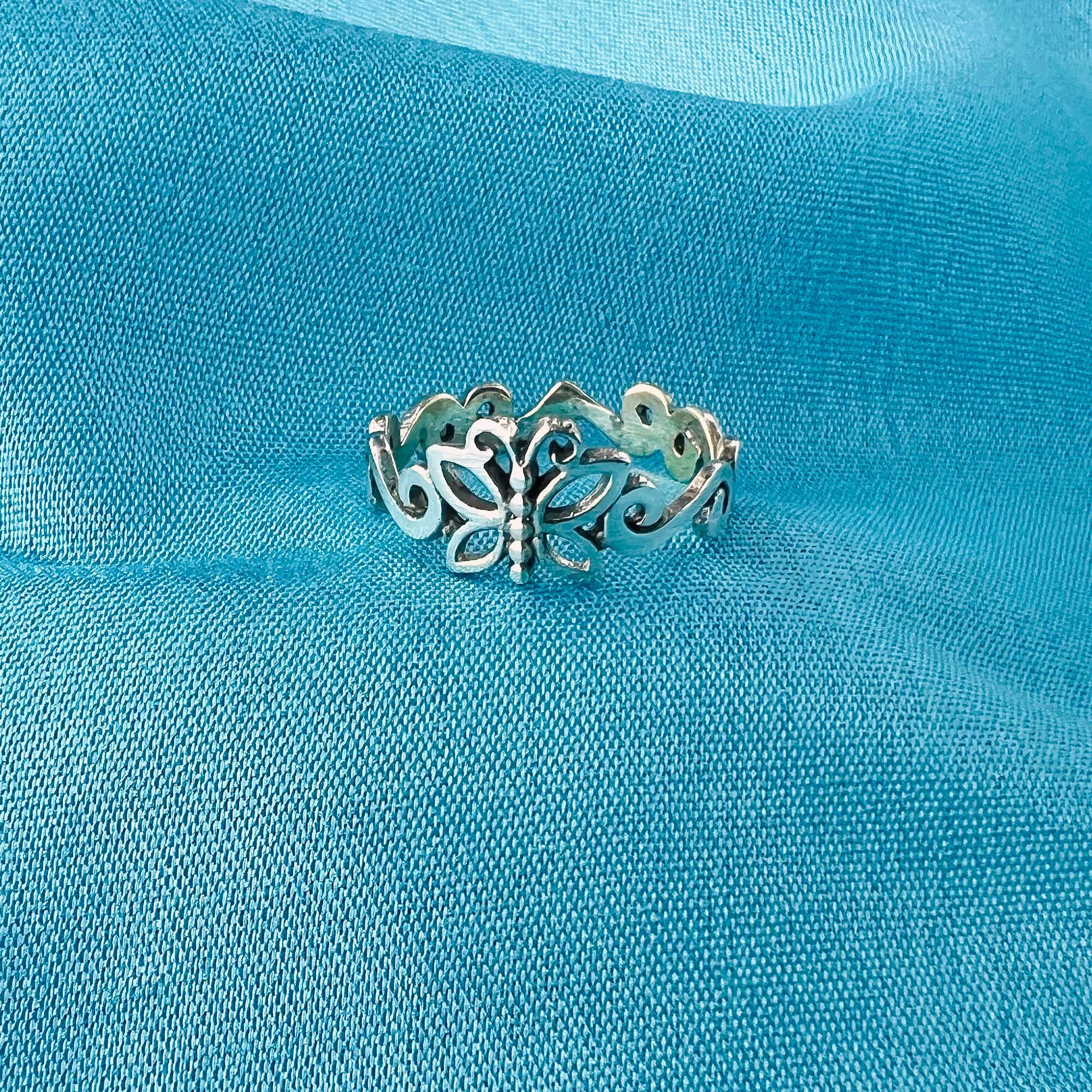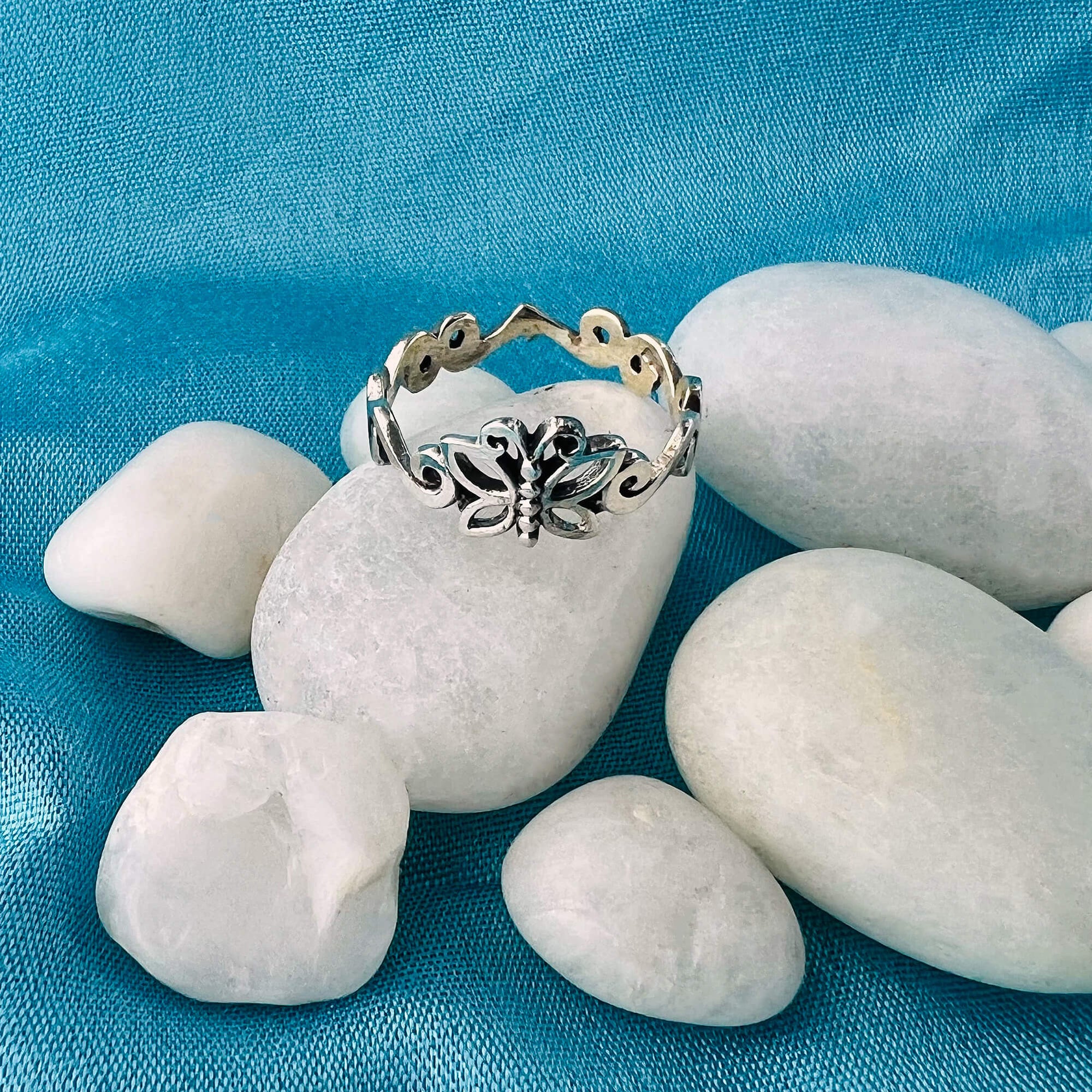Add a touch of elegance to your look with this sterling silver ring. The Butterfly Swirl Design Ring is crafted with great attention to detail, featuring a delicate butterfly motif that swirls around the band. The ring is made of 925 sterling silver, making it a high-quality and long-lasting choice. It's also adjustable so that it can be made to fit most finger sizes. Wear this ring as a symbol of nature's beauty and your own unique style.