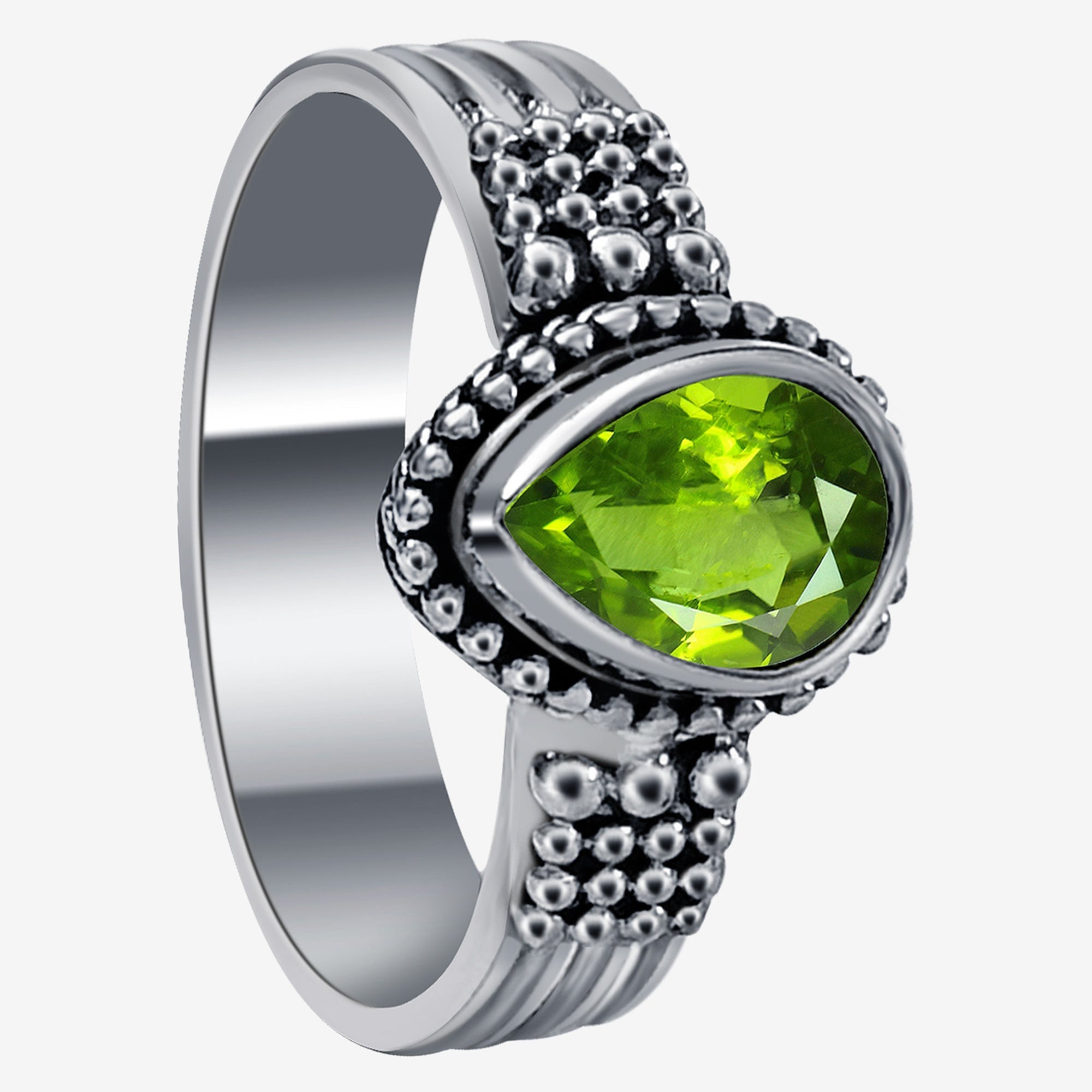 Made from .925 sterling silver, the ring features a 6mm by 8mm pear-shaped peridot gemstone surrounded by a beautiful silver design. The ring's design measures 11mm wide, while the ring tapers down to a comfortable 5mm.