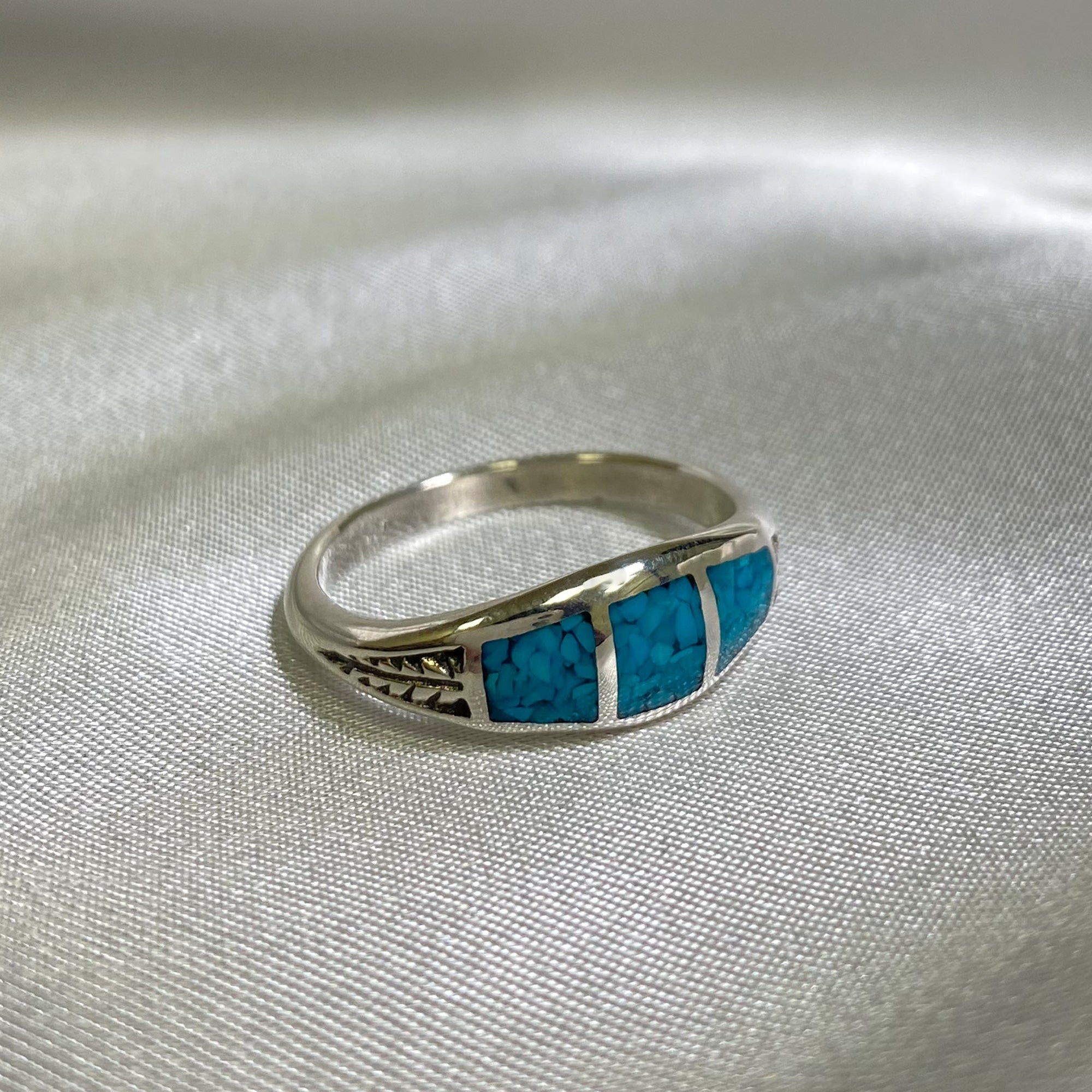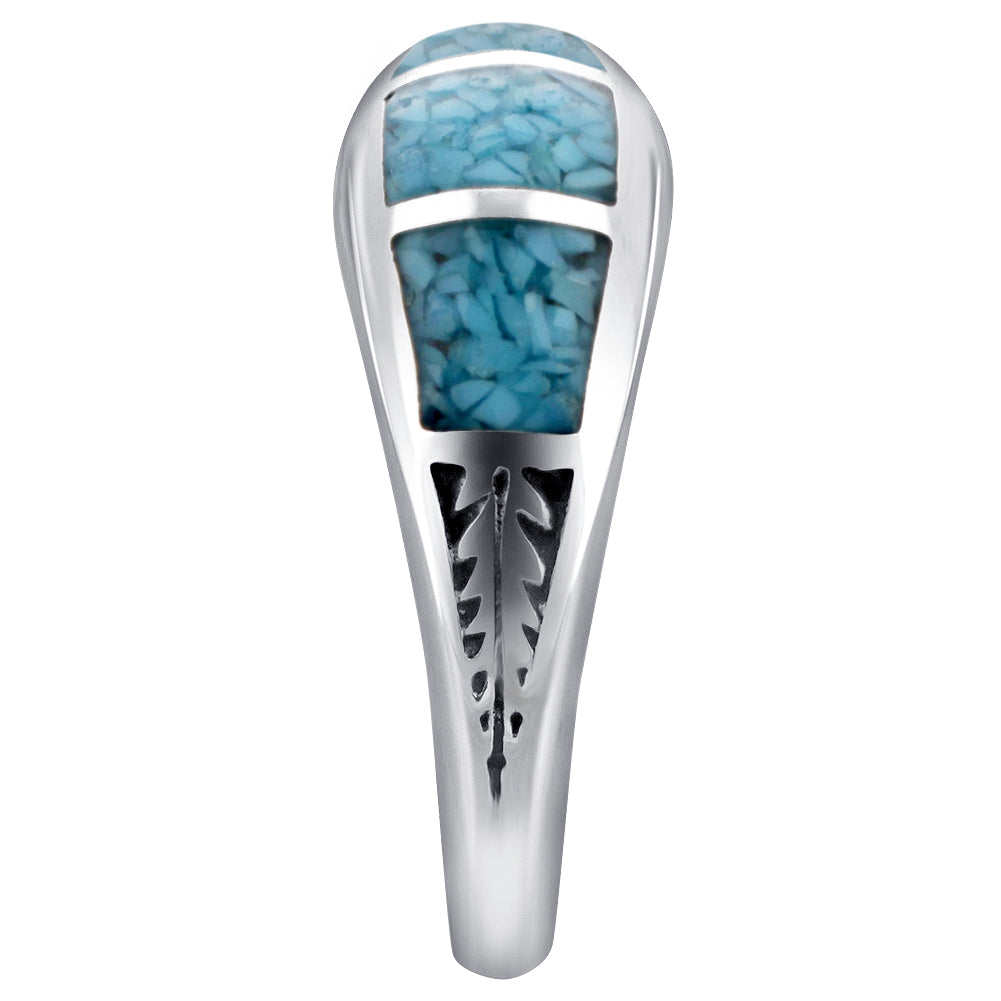 Add a pop of color to any look with this 925 sterling silver Southwestern-style turquoise gemstone ring. The stunning ring contains two engraved leafs on each side with vibrant turquoise chip inlays in the center. This ring comes in various sizes, a perfect fit for everyone!