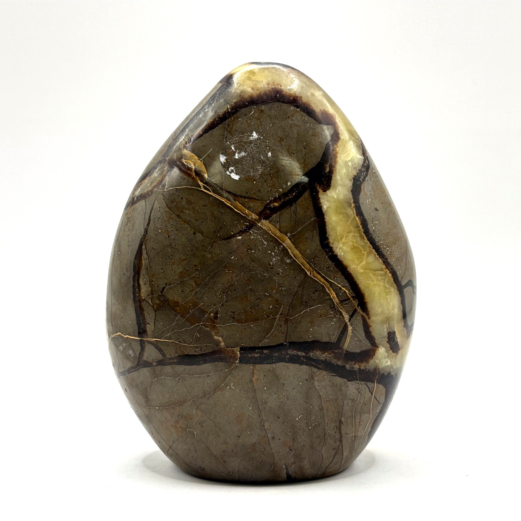 Septarian stones are known for their healing properties, making them popular among collectors, energy healers, and meditation enthusiasts. The unique septarian cracks, filled with calcite crystals, are believed to enhance emotional healing and balance. This fossil's freeform shape and polished finish make it an excellent decorative piece for your home, adding a touch of natural beauty to any space.