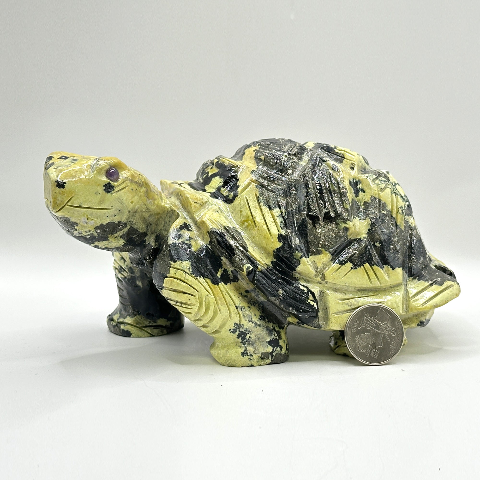 • description_tag : Hand carved serpentine stone turtle sculpture adds natural elegance to any space. 7 inch art piece, perfect for home or office decor. Gem Avenue in Charlotte.