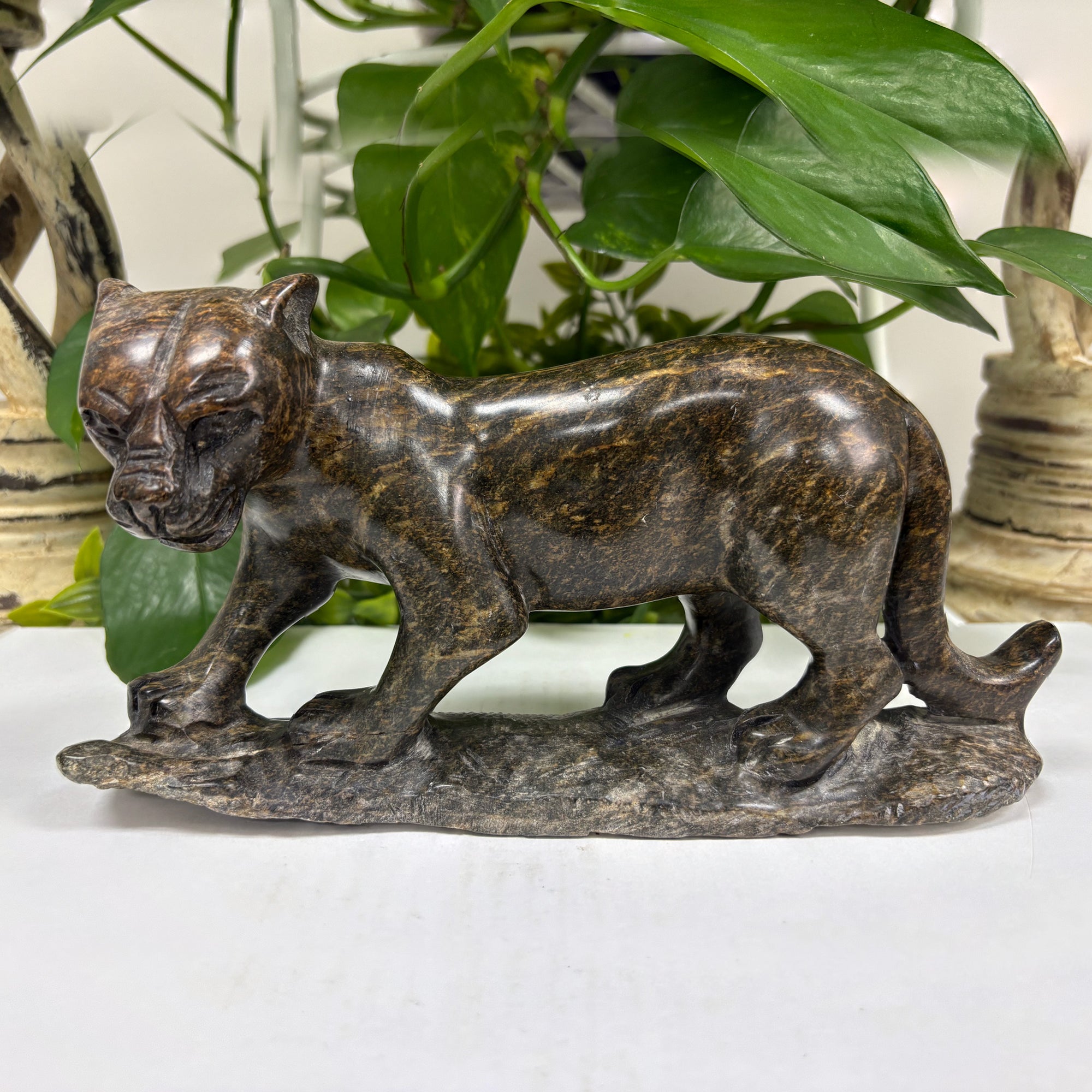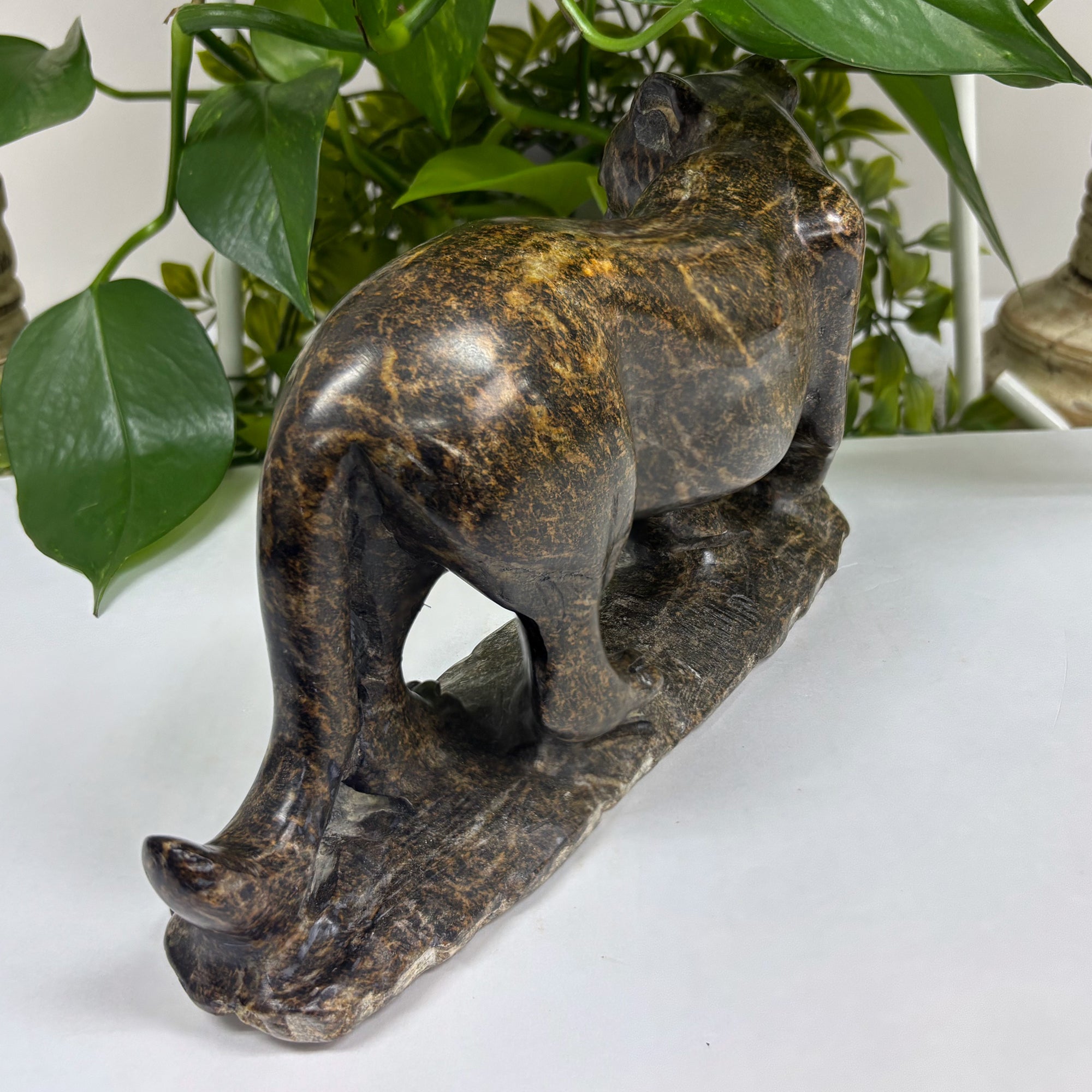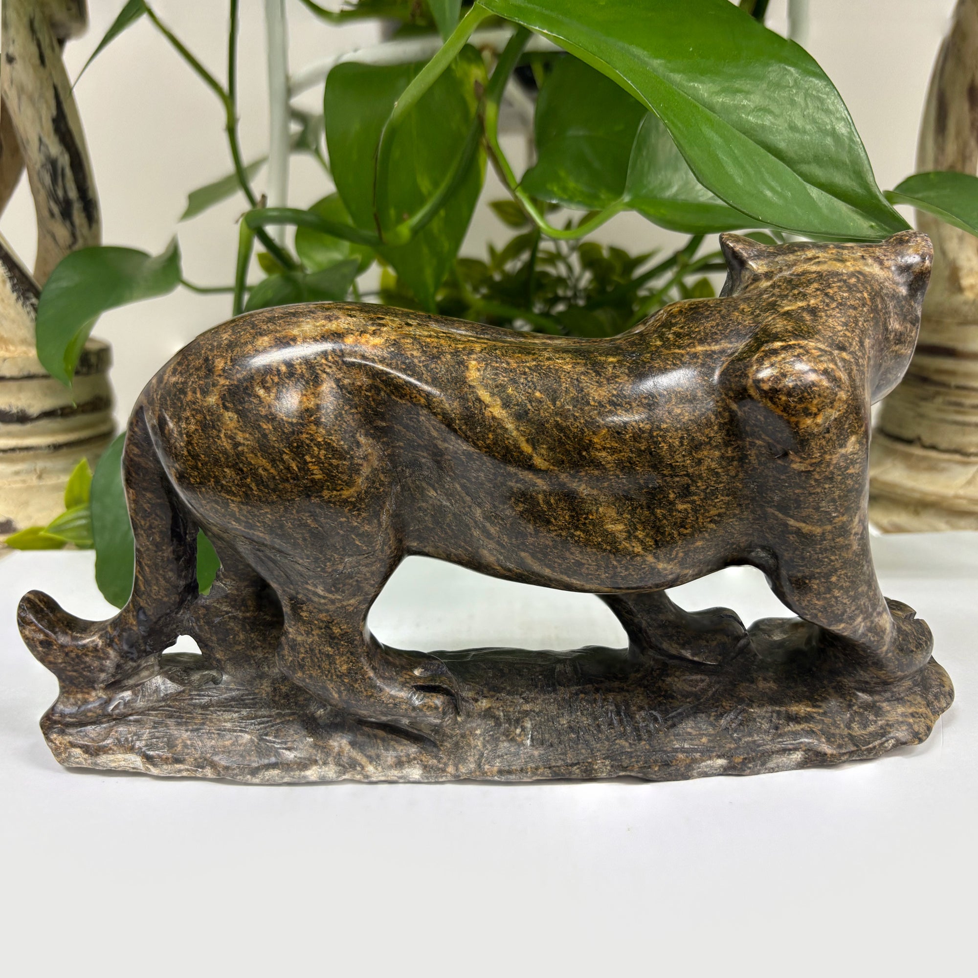 Experience the natural beauty and energy of this stunning Natural Serpentine Panther Gemstone Carving. Meticulously hand-carved from high-quality serpentine crystal, this figurine brings a sense of calm and balance to any space. Display it with pride as a symbol of strength and grace.