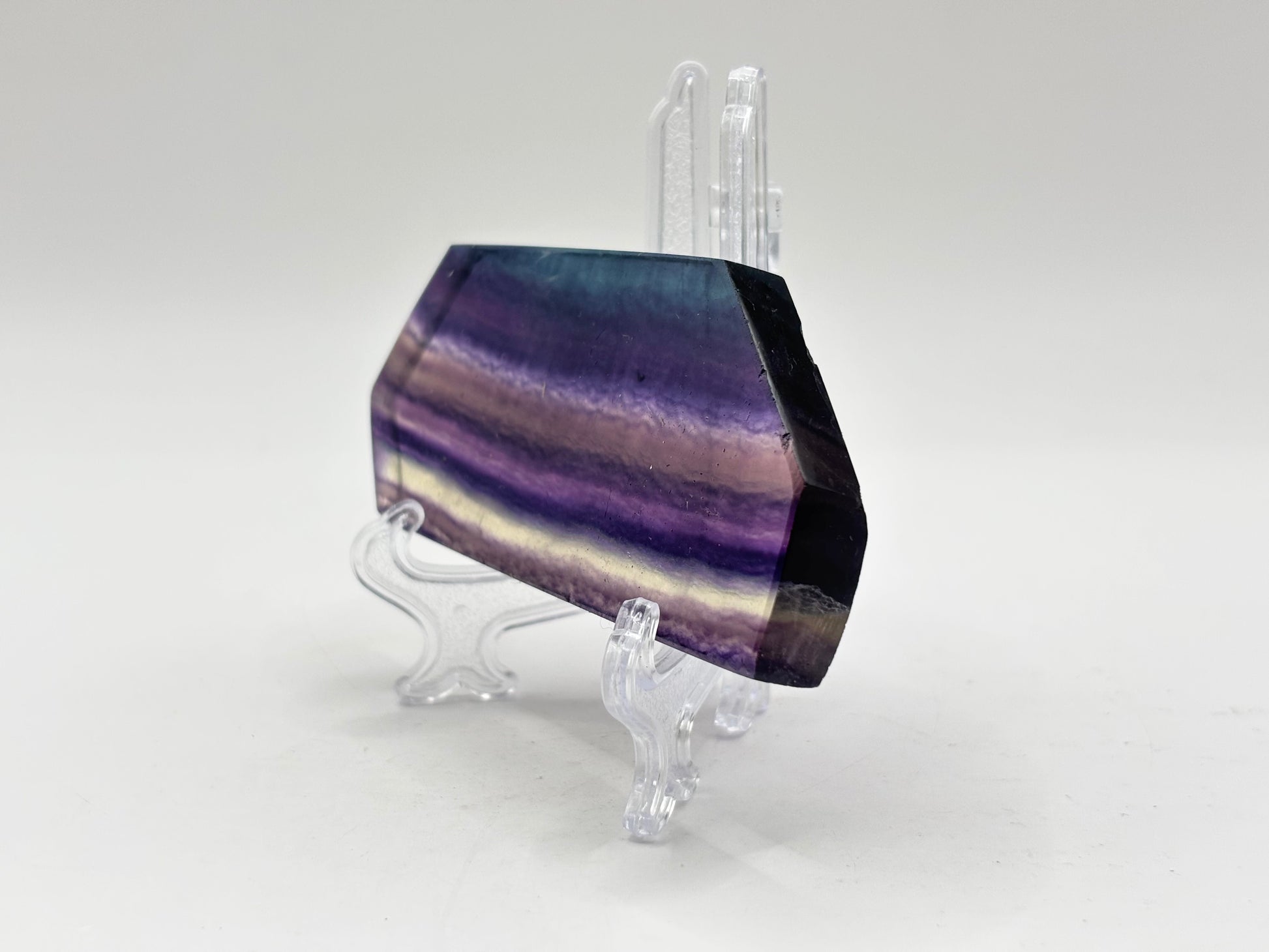 Introducing our Natural Rainbow Fluorite Crystal Slab, a captivating piece of nature's artistry. weighing around 3.3 ounces. It showcases a stunning array of colors, including purple, green, and clear, creating a mesmerizing rainbow effect. The Fluorite is sourced naturally and expertly cut and polished to highlight its unique beauty.