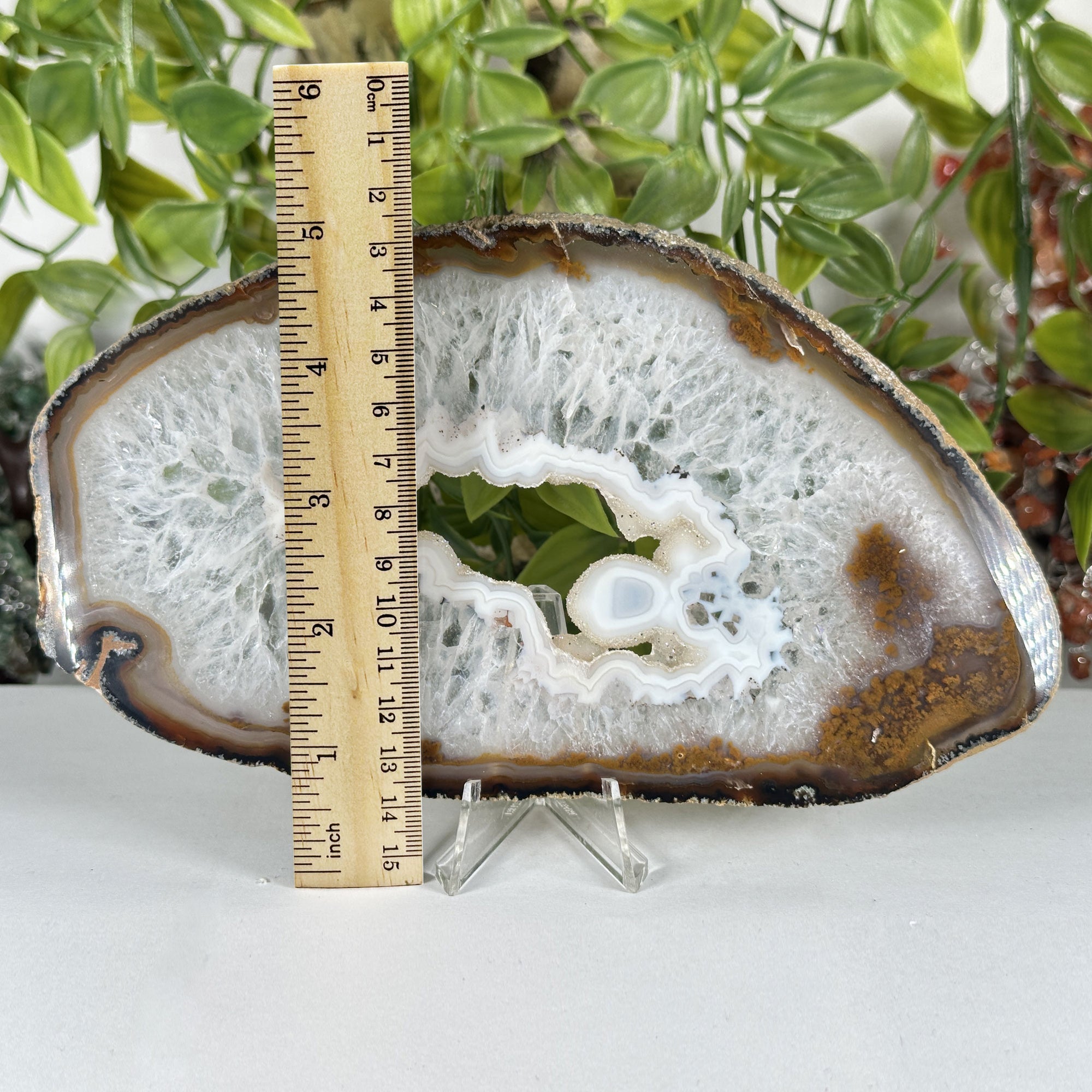 This beautiful Natural Agate Slab from Brazil is a polished crystal slice that showcases the stunning banded patterns and translucent layers that make agate one of the most visually captivating stones in the world. Measuring 8.25 inches in length and 4.75 inches in height with a slim profile of just 0.25 inches, this lightweight slab weighs approximately 0.55 lbs and is easy to display in a variety of settings. The polished face reveals intricate white, cream, and warm brown banding that radiates outward from a natural open center cavity, creating a one of a kind pattern that is entirely formed by nature. The outer edge retains its natural rough texture, providing a beautiful contrast to the smooth polished interior and highlighting the raw character of this Brazilian agate specimen.