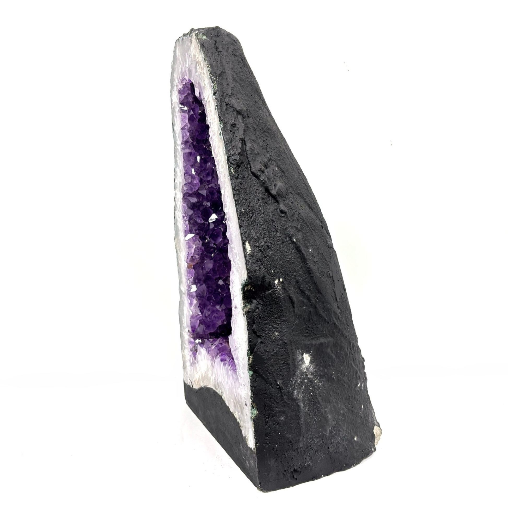 Introducing our Natural Dark Purple Amethyst Crystal Geode, a stunning and captivating piece of nature's art. This geode, sourced from the rich mineral deposits of Uruguay, measures approximately 7.25 inches in length, 4.75 inches in width, and 13.75 inches in height, and weighs around 20 pounds. The geode is encased in a natural, rough matrix, revealing a breathtaking display of deep purple amethyst crystals within, each unique and beautifully formed.