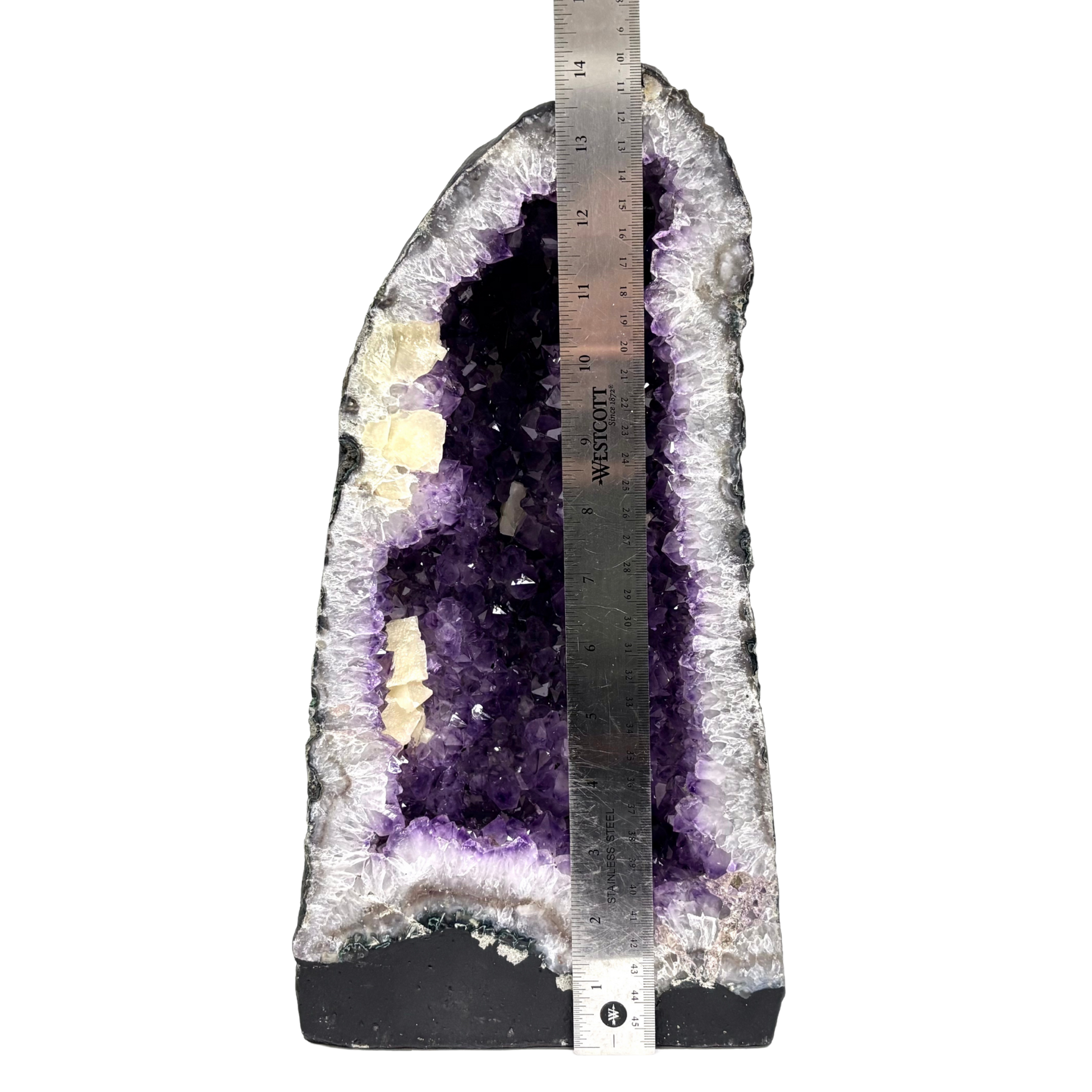 Introducing a stunning Natural Dark Purple Amethyst with Calcite Crystal Geode, meticulously sourced from the vibrant landscapes of Uruguay. This exquisite specimen measures approximately 7 inches in length, 5 inches in width, and 14.25 inches in height, weighing around 21 pounds. The geode boasts a captivating dark purple Amethyst crystal formation, accentuated by the presence of Calcite crystals, creating a mesmerizing contrast.