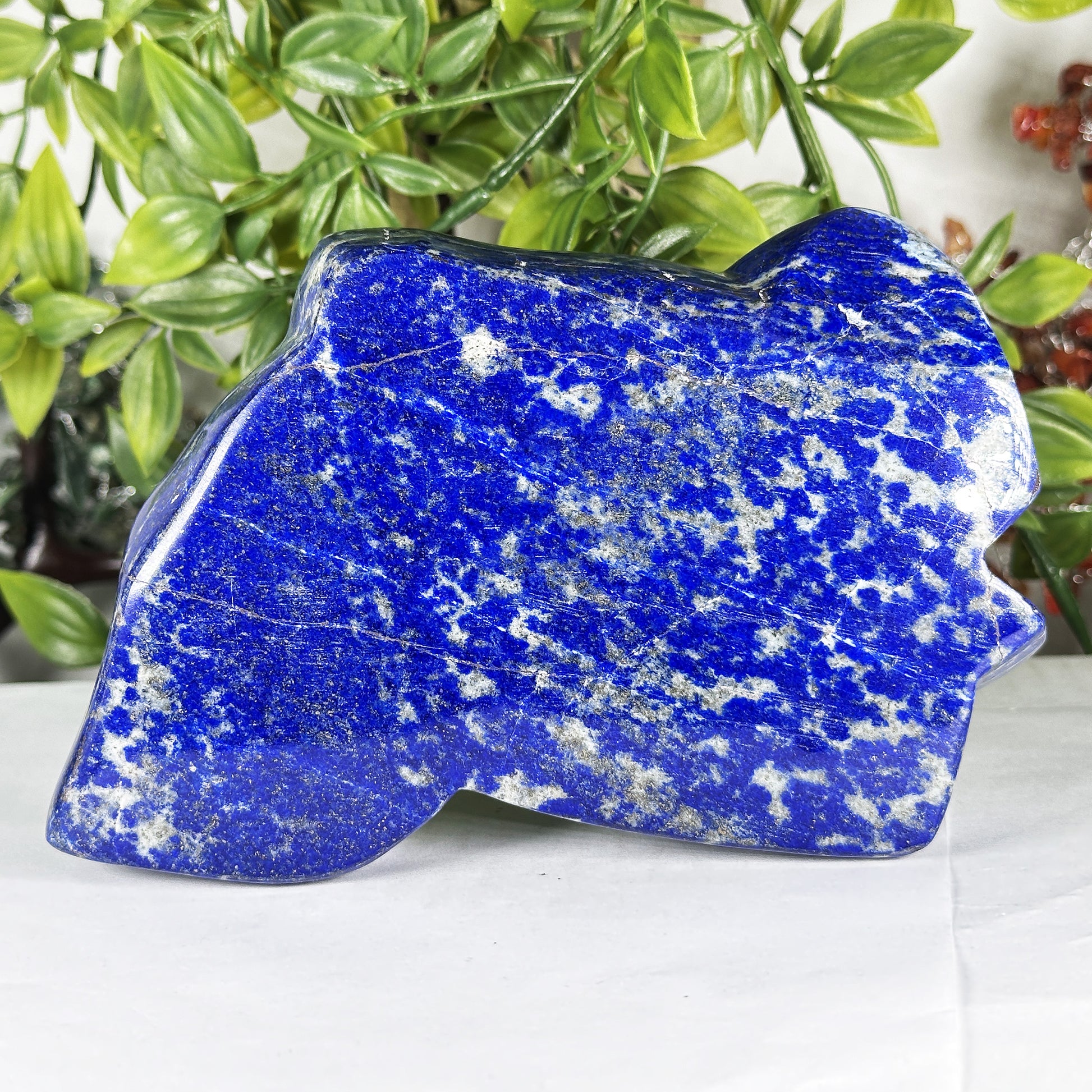 This Natural Lapis Lazuli Polished Freeform Stone showcases a stunning deep blue color with natural variations and golden pyrite flecks. Measuring 4.75 inches long, 6.25 inches tall, and 1 inch wide, this 1.92 lb stone features a smooth polished surface that highlights its natural fractures and unique organic shape. The premium lapis lazuli material displays rich azure tones throughout its freeform structure.