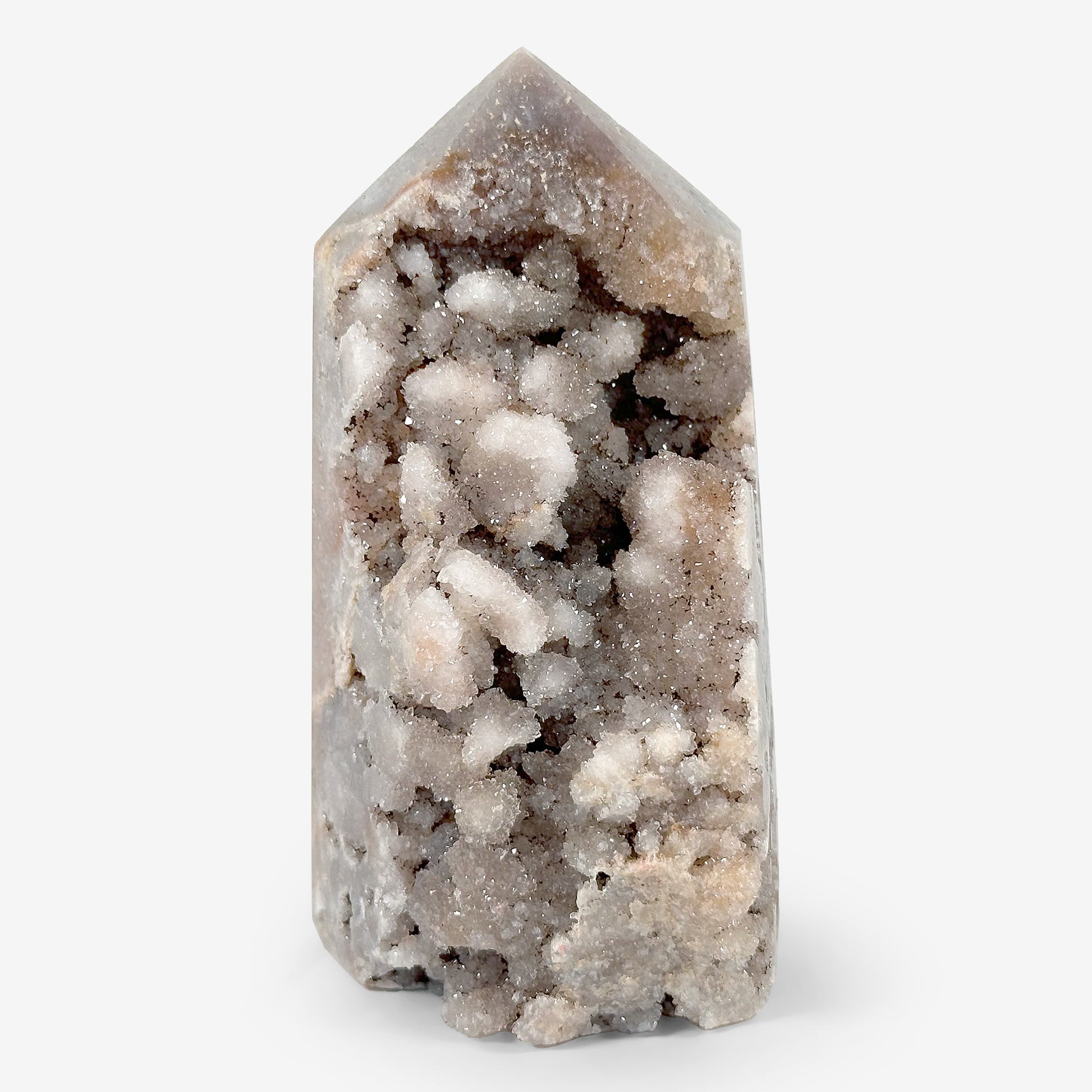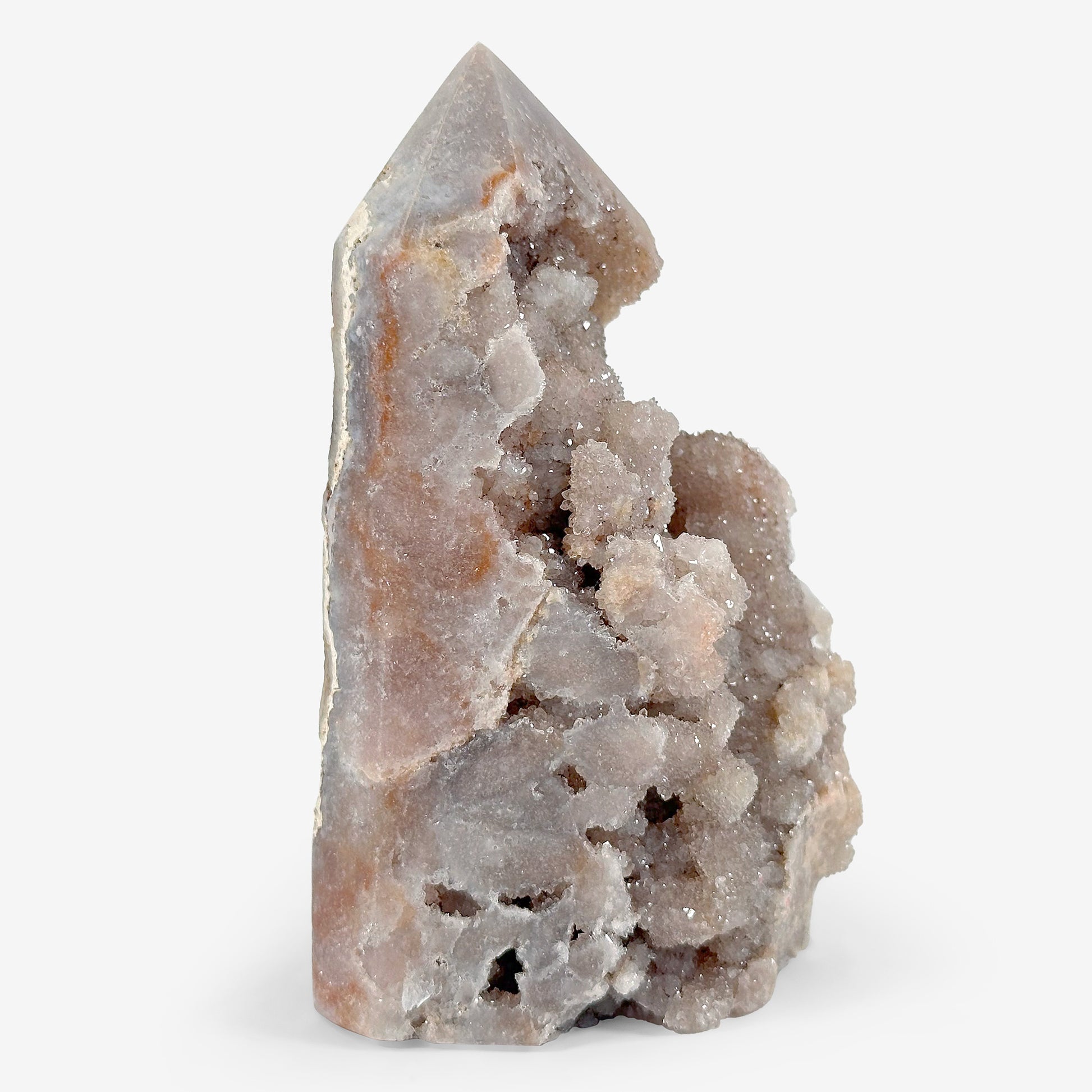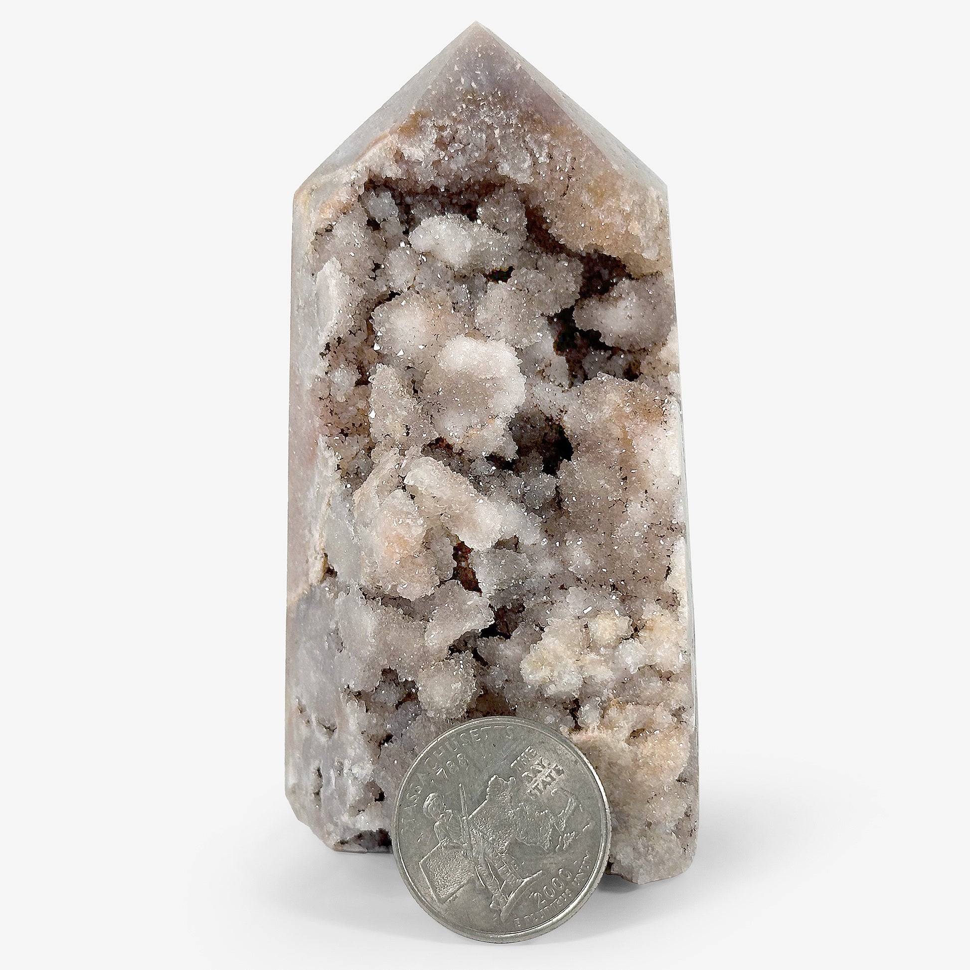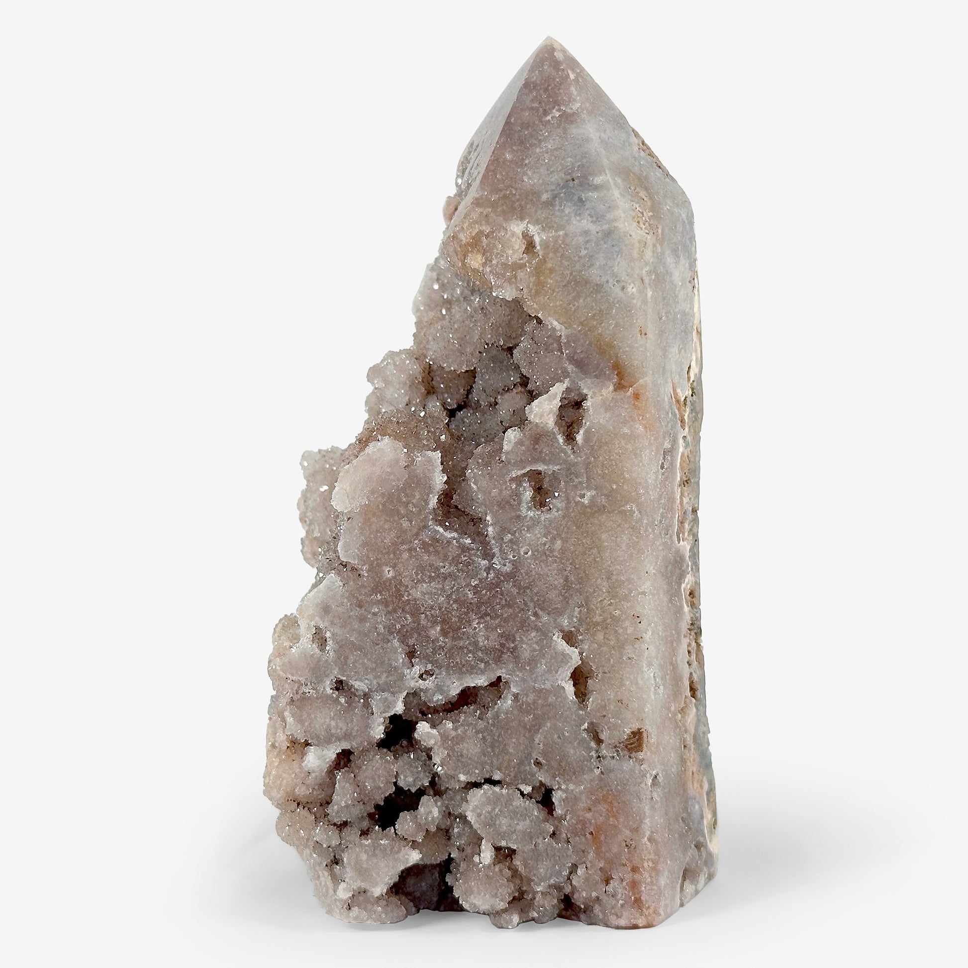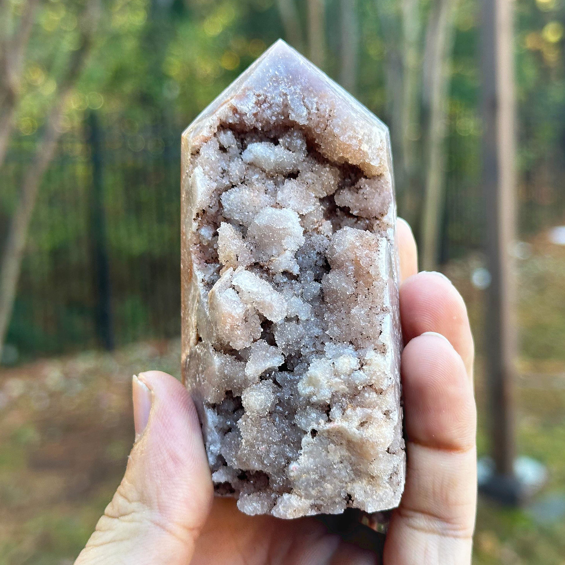 This exquisite piece is crafted from genuine pink amethyst, renowned for its soft blush hues and unique, intricate patterns. The obelisk shape symbolizes strength, balance, and positive energy flow, making it perfect for enhancing any space. This tower is covered in druzy pink quartz. A perfect gift for crystal collectors, healers, or anyone who appreciates nature's artistry in its purest form.