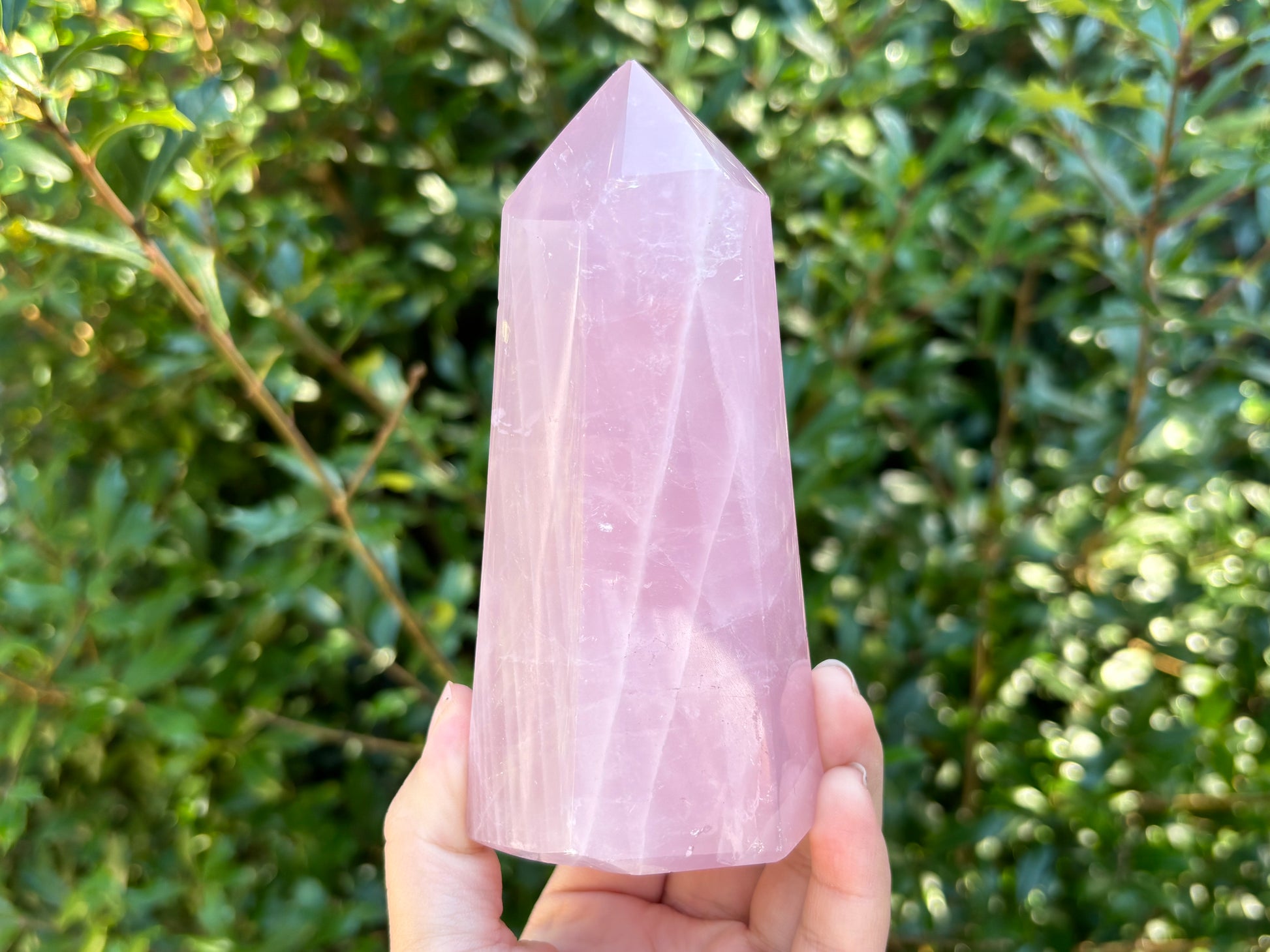 - description_tag : Natural Rose Quartz Crystal Tower Point from Madagascar - Enhance love, healing, & peace. Perfect for meditation, decor, & crystal collectors. Gem Avenue in Charlotte.