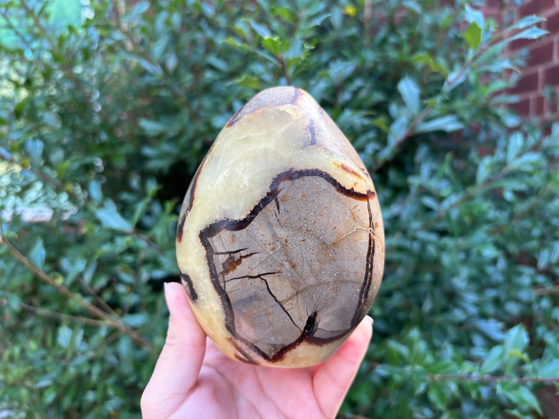Septarian stones are known for their healing properties, making them popular among collectors, energy healers, and meditation enthusiasts. The unique septarian cracks, filled with calcite crystals, are believed to enhance emotional healing and balance. This fossil's freeform shape and polished finish make it an excellent decorative piece for your home, adding a touch of natural beauty to any space.