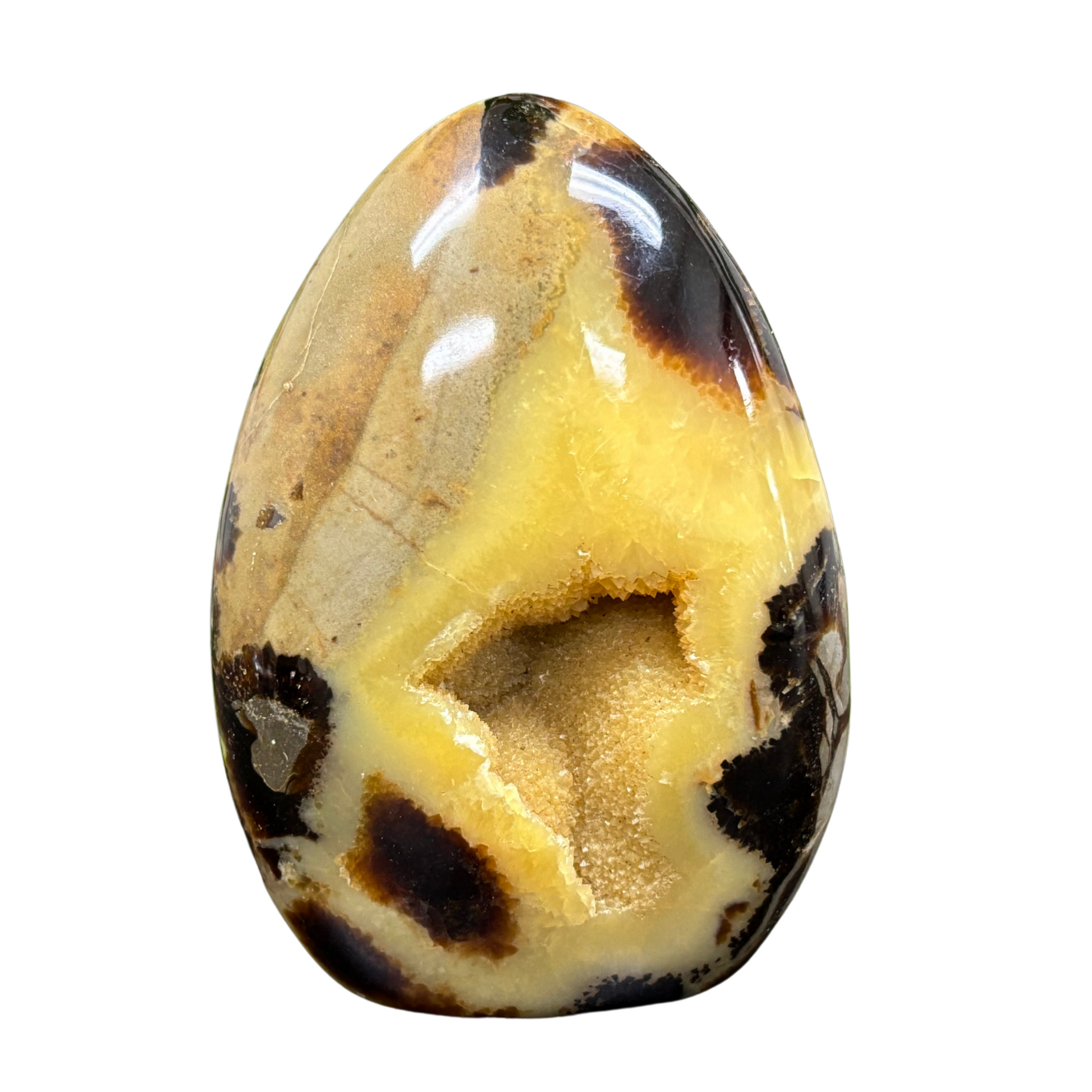 This septarian freeform from Madagascar is a visually striking stone that showcase a unique combination of earthy colors and natural geometric patterns. Formed millions of years ago, septarian is a blend of minerals—typically calcite, aragonite, and limestone—creating a bold mosaic of golden yellow, brown, and gray tones. Polished into a freeform shape, this piece highlights the stone’s natural cracks and separations, which resemble a dragon’s skin, earning it the nickname “Dragon Stone.”