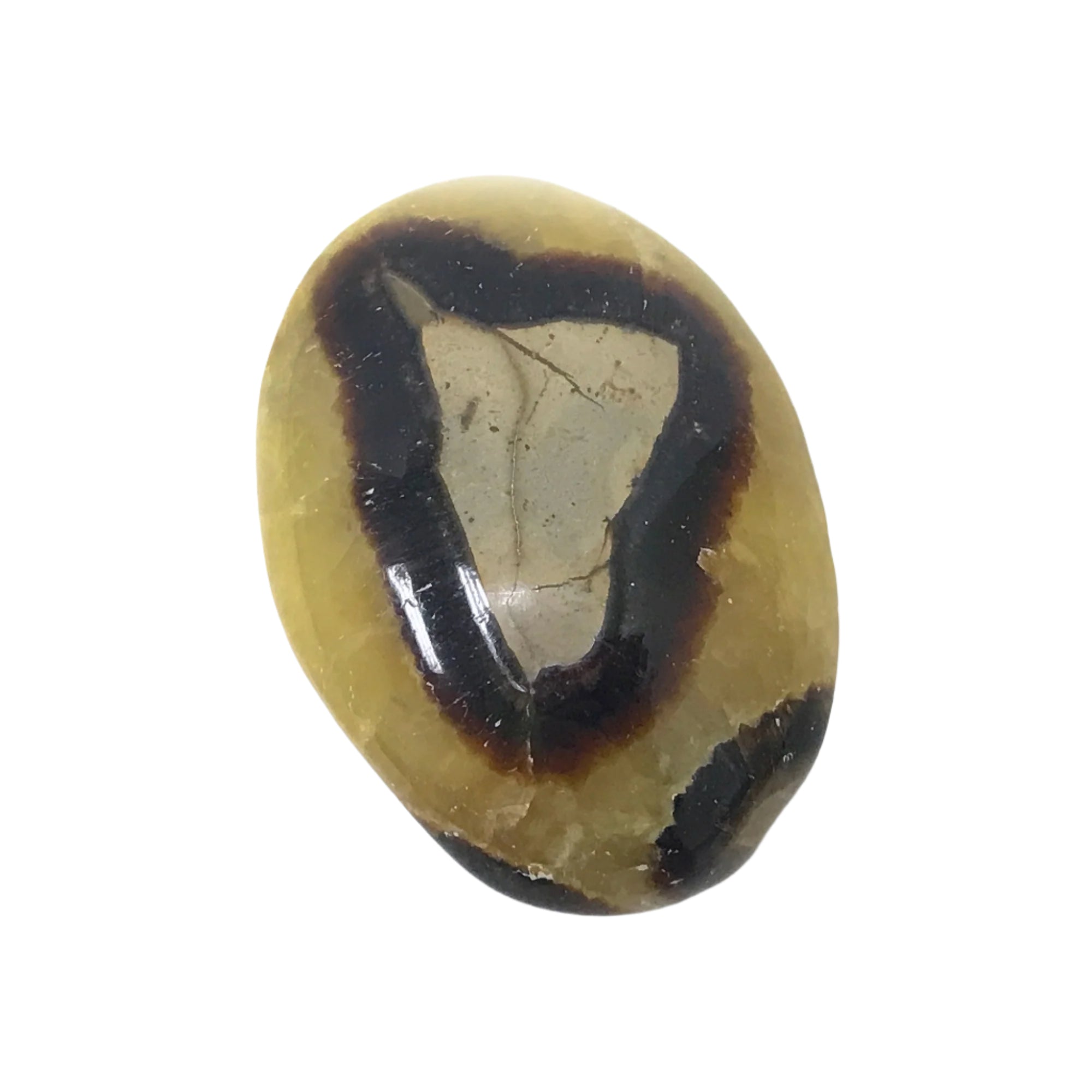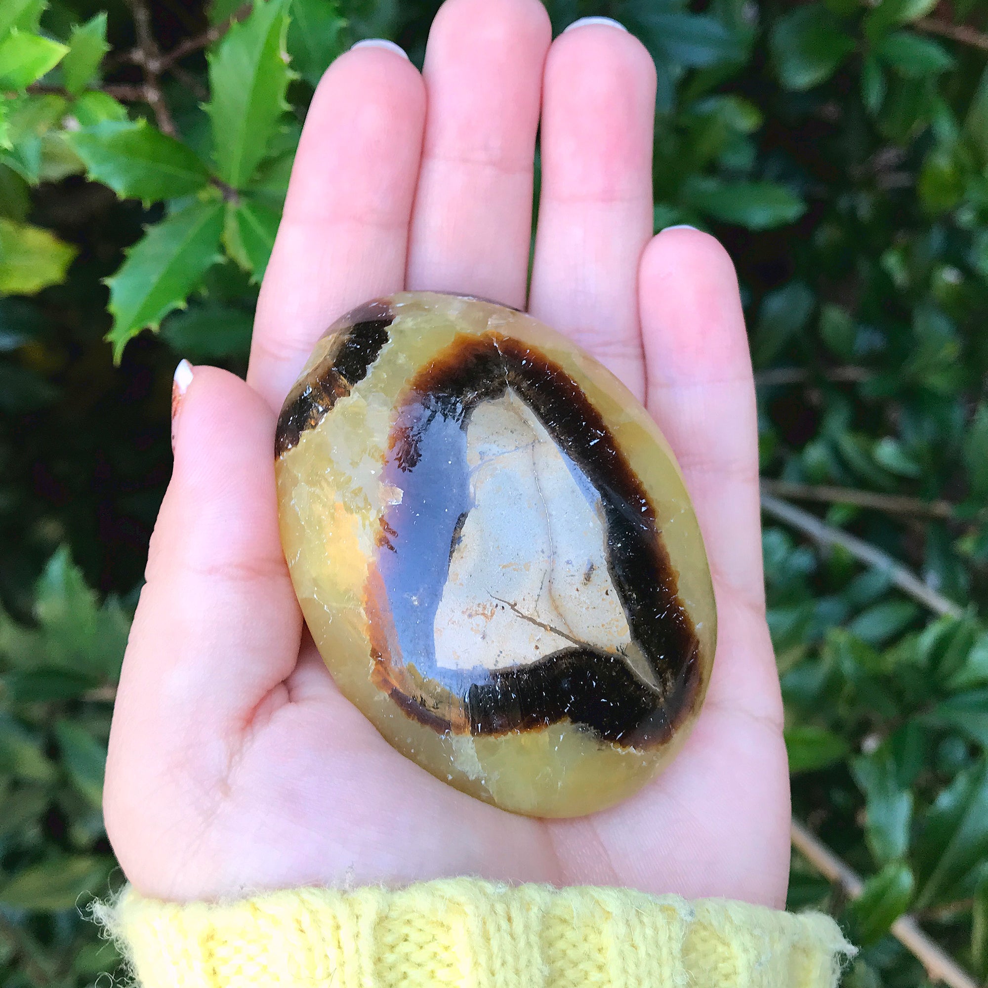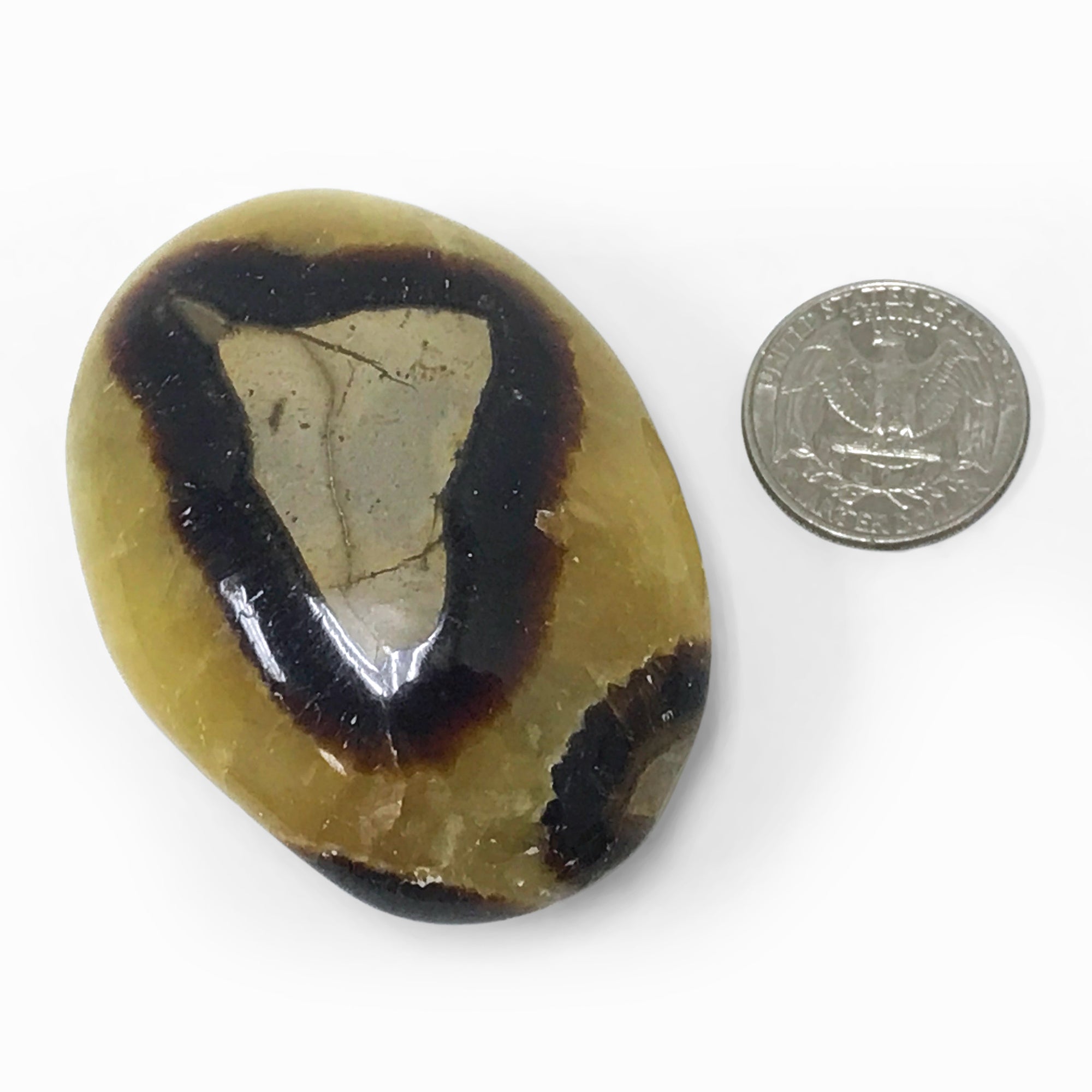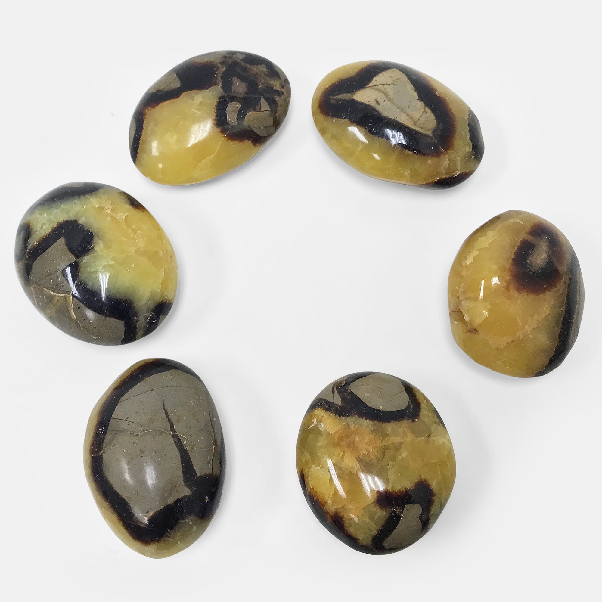 Lovely Septarian Palm Stone have a unique pattern with their yellow, brown, and grey coloring. Observing each stone one can see the difference in their design.