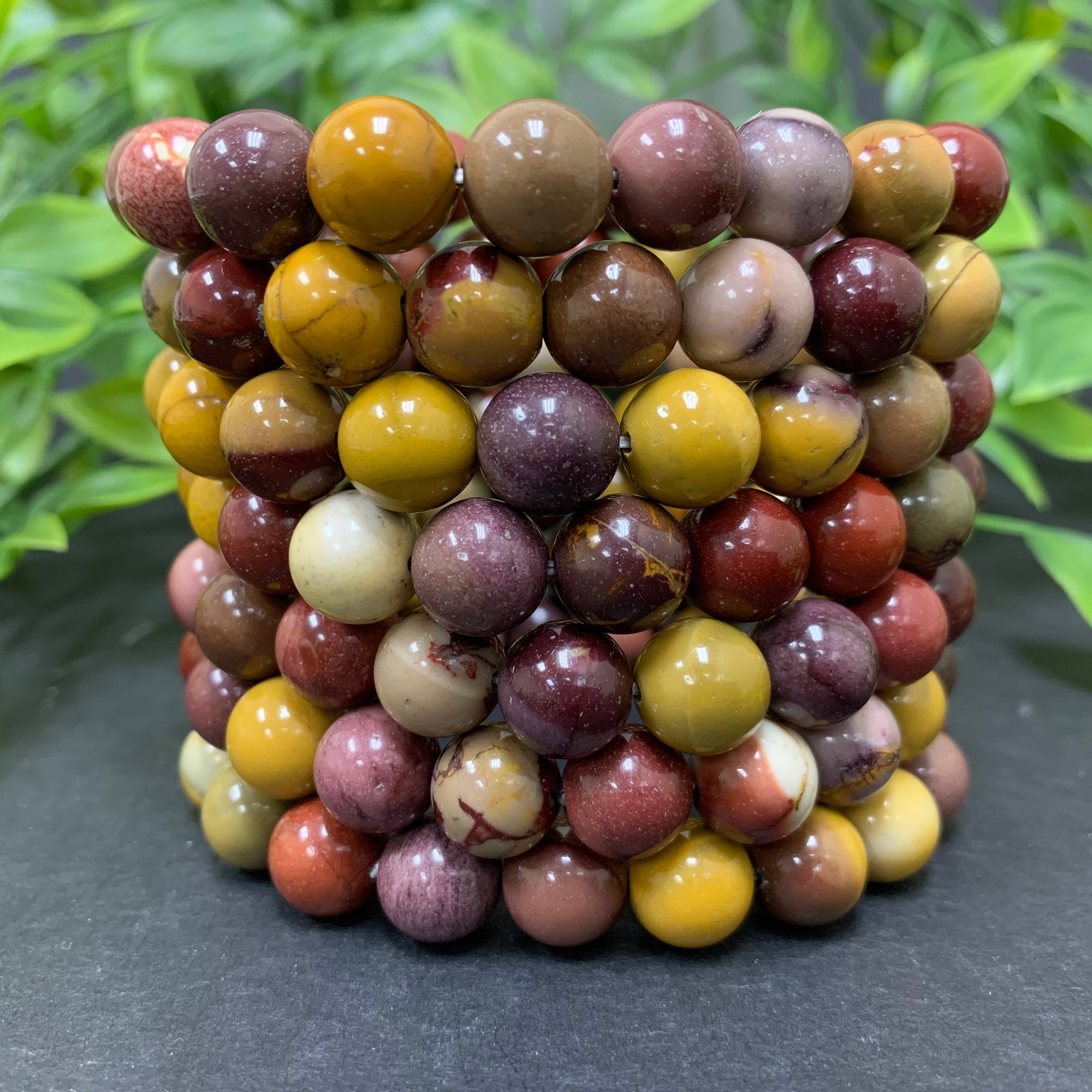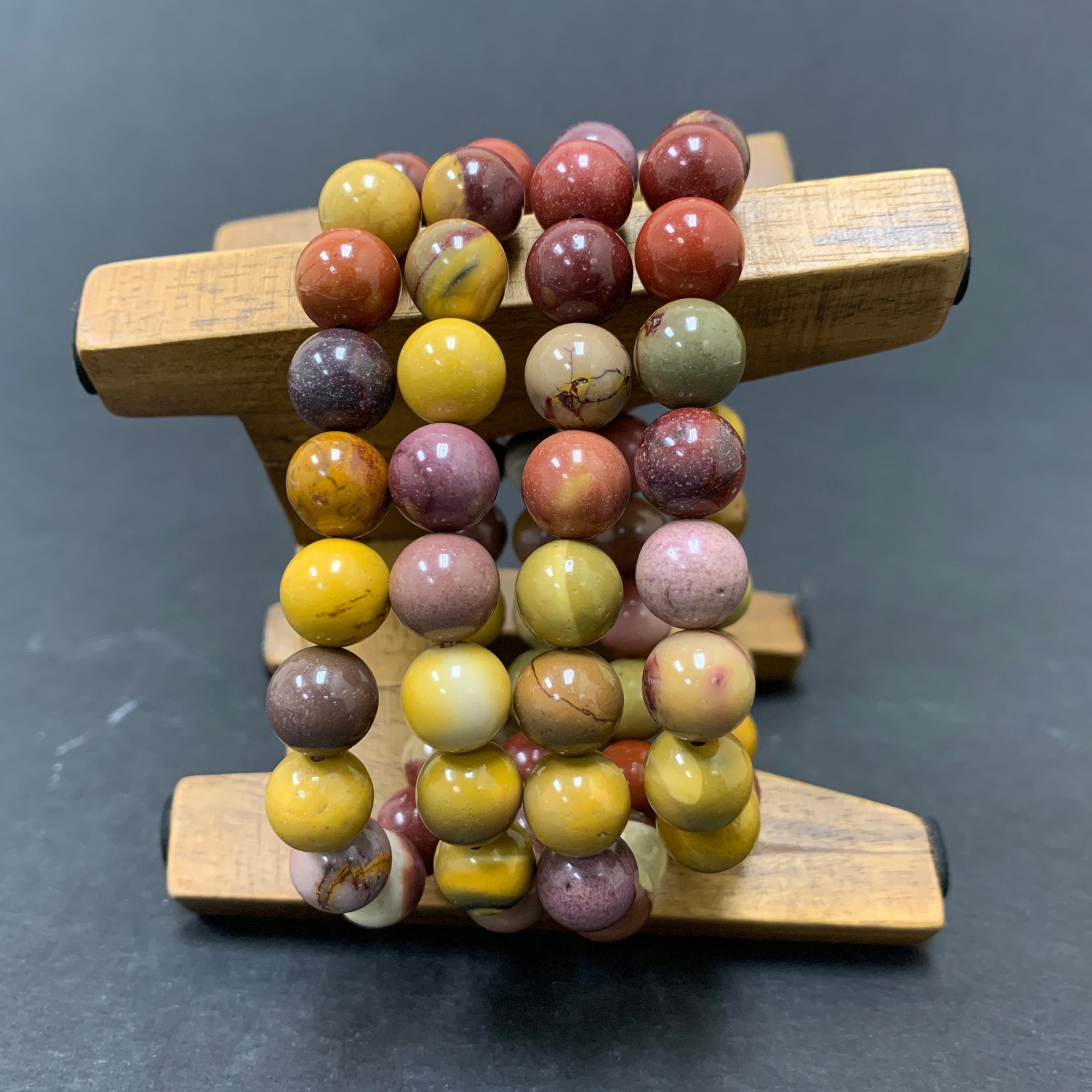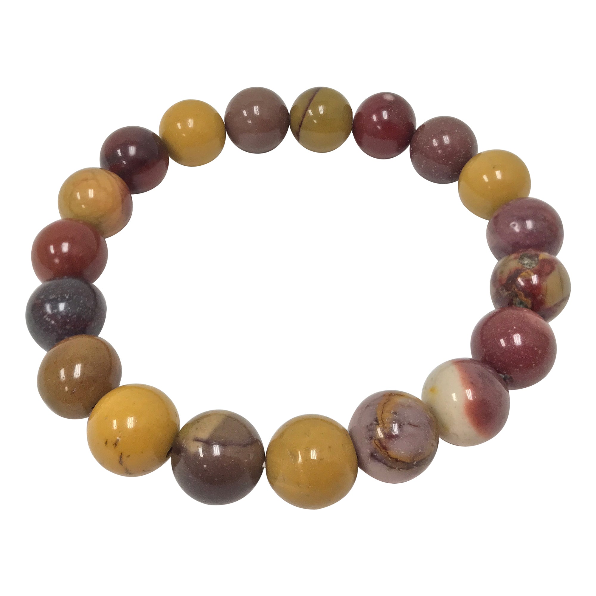 These bracelets are composed of 10mm Mookaite beads that have vibrant colors such as yellow, red, and white. These round bead bracelets are incredibly beautiful at an unbeatable price! Get yours today we are positive you will not be disappointed!