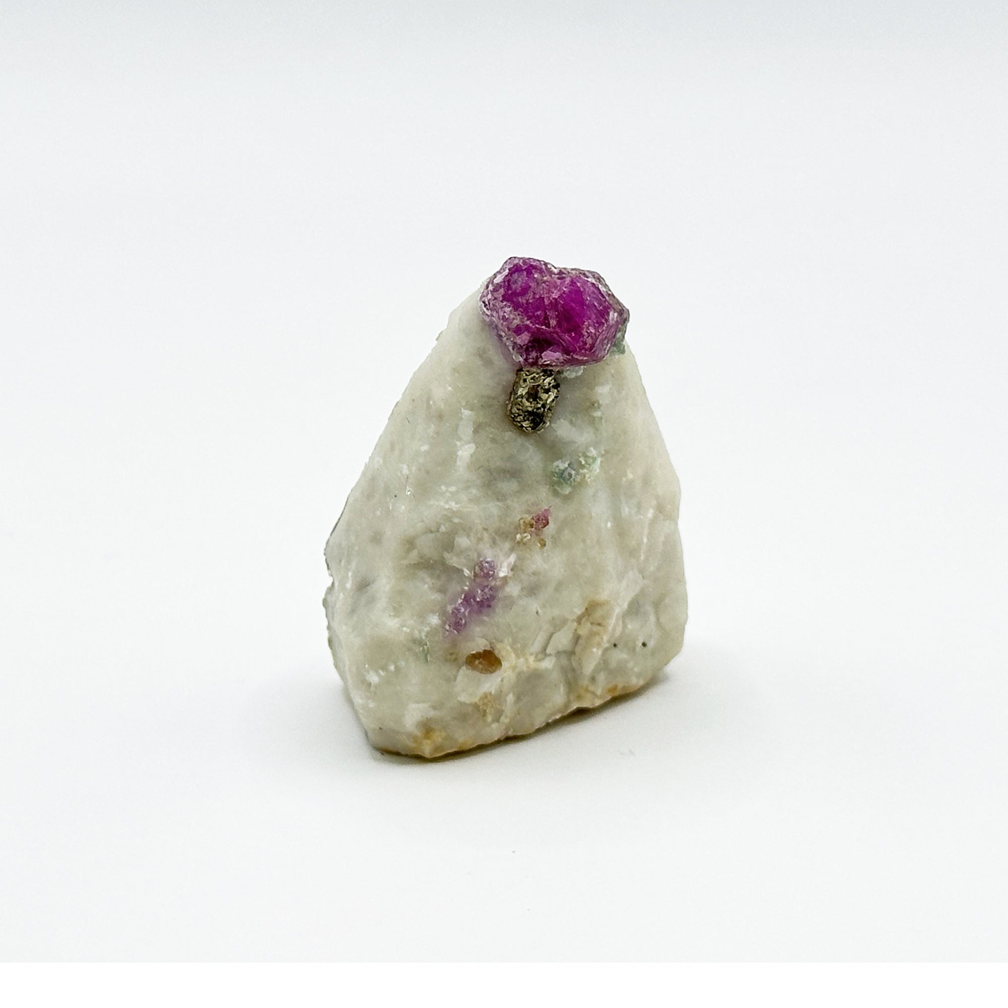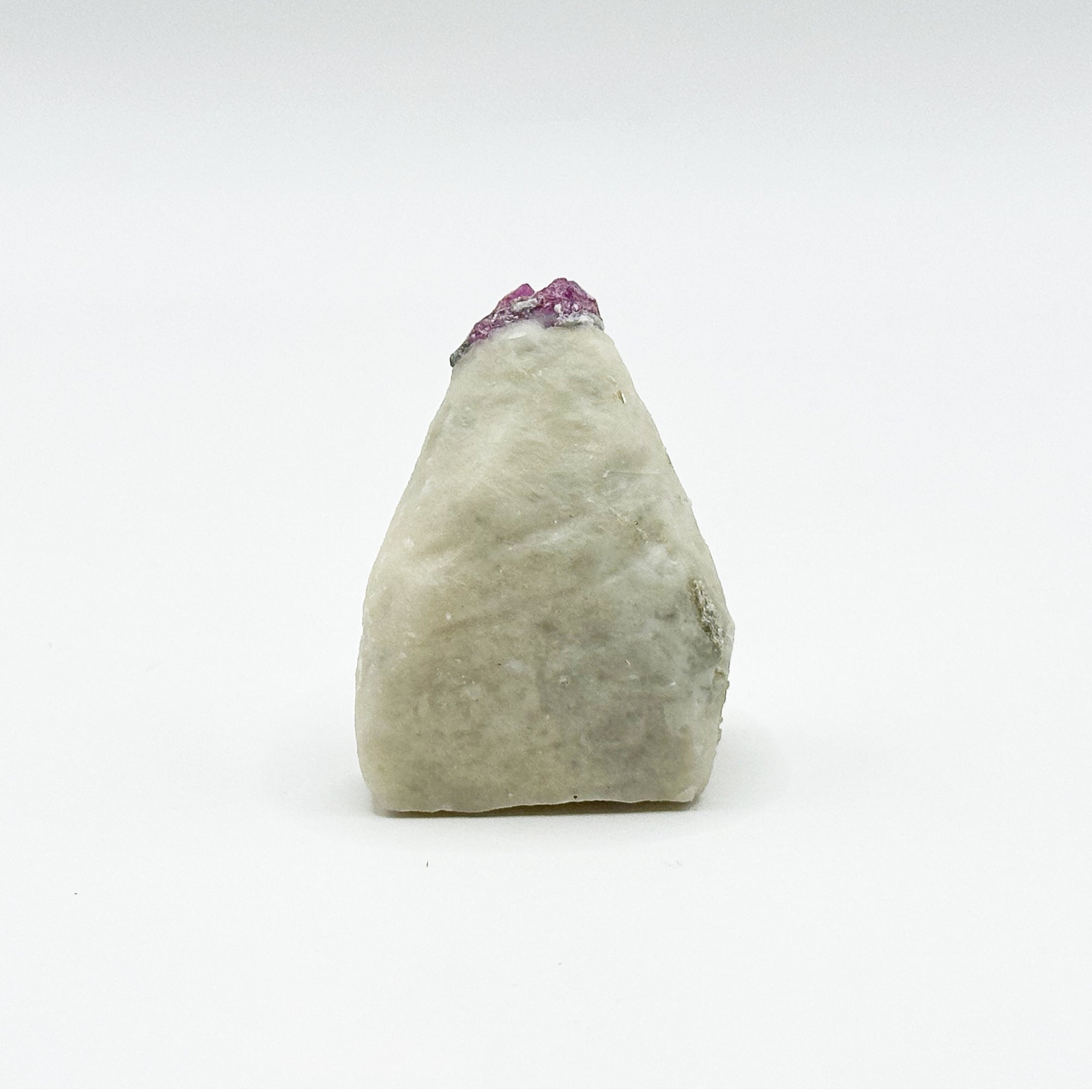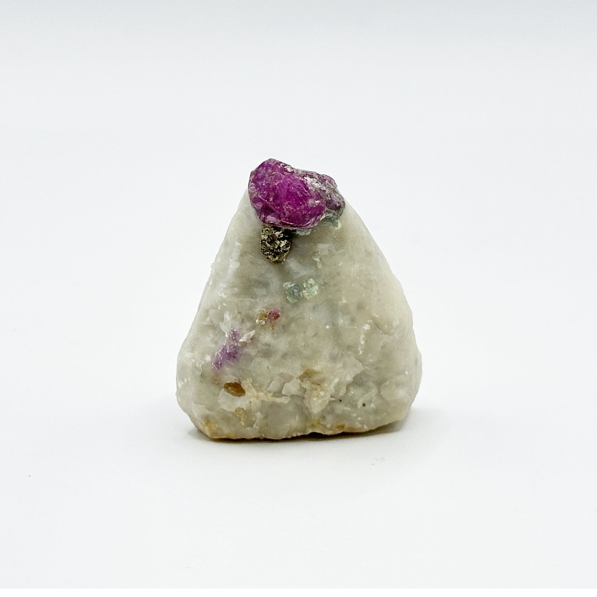 This natural Ruby specimen from Pakistan showcases deep red to pinkish red hues with a raw, unpolished charm that highlights its natural formation. Part of the corundum family and rubies are known for their durability and vibrant color. This piece contains an approximate height of 1.5” with an approximate weight of 1.3oz, making it a perfect addition to any home or collection!